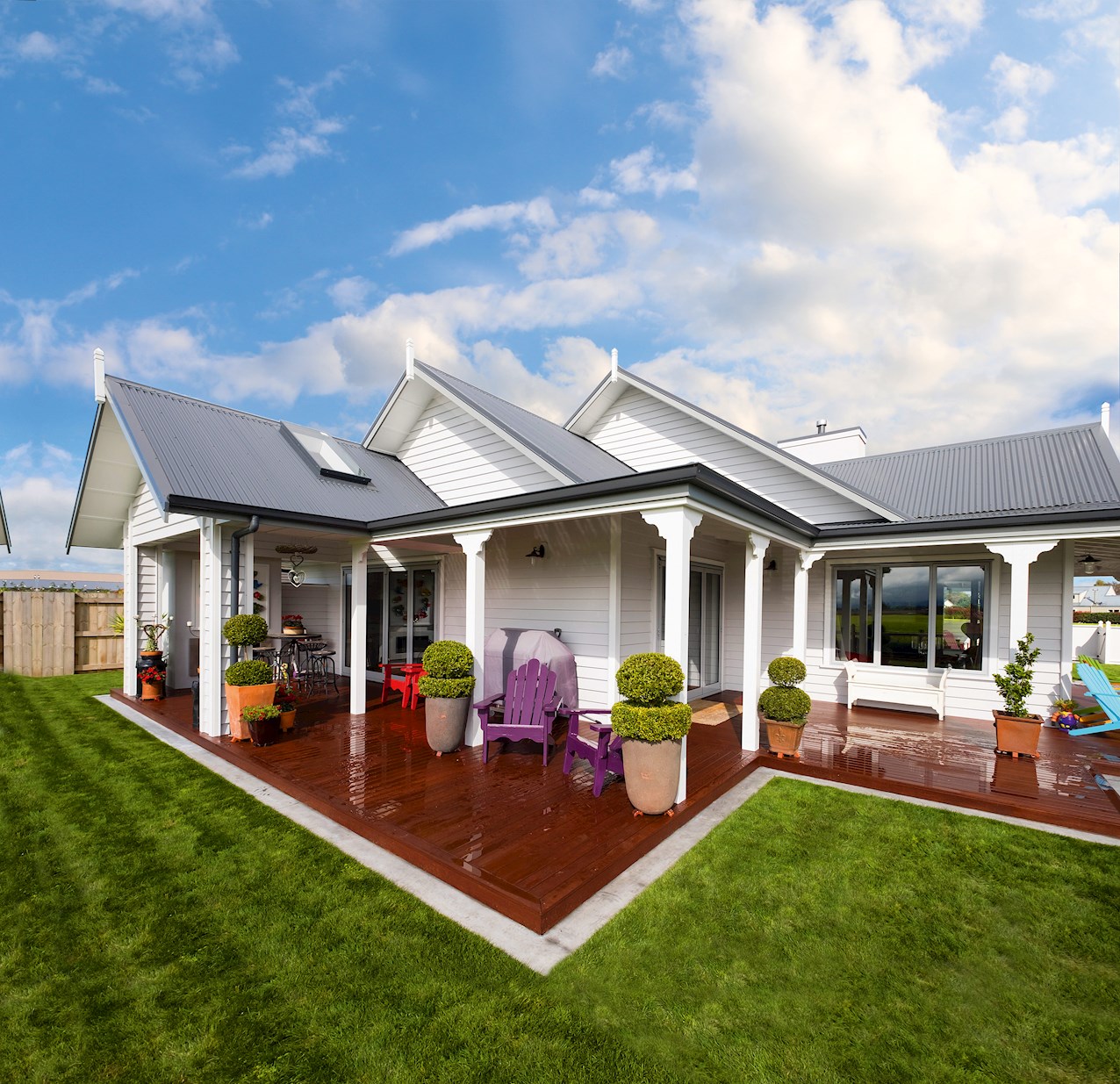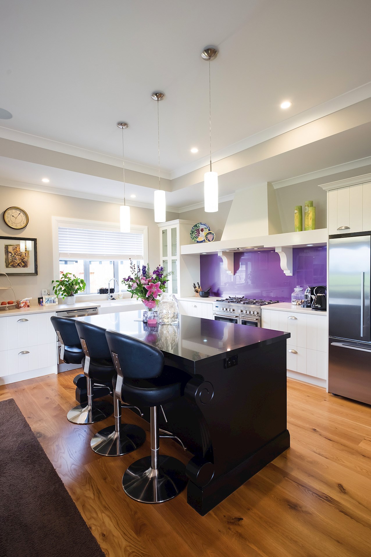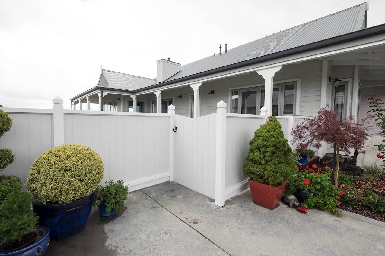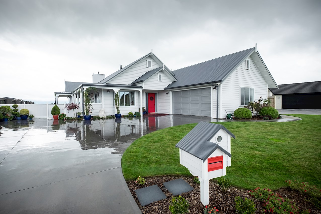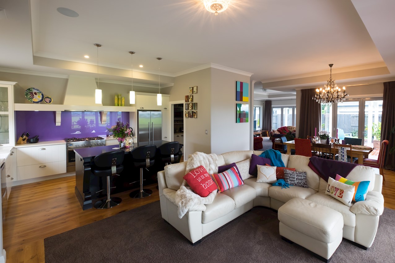 This modern take on a traditional villa hits the mark in Matamata. The fresh and light exterior is elegant and understated. A huge, wraparound deck conjures visions of summer soirees. The portico with gas fire warms late into the evening, so there’s no need to rush inside when the temperature drops. The classic yet contemporary interior boasts four bedrooms, two bathrooms and dual living spaces, including an open-plan layout. A black central island, purple splashback and stainless steel appliances give the entertainer’s haven a dramatic edge. Meanwhile, stepped ceilings, wide architraves and skirtings, and panelled doors foster a traditional feel. The antique bronze hardware on the doors deserves a medal. Window seats with bookshelves in the bedrooms are another fine feature. Plenty of storage, a laundry and a garage with attic are pleasingly practical additions. In the bathroom, the bold, beautiful freestanding tub is a light and lovely place to soak at the end of a long day.