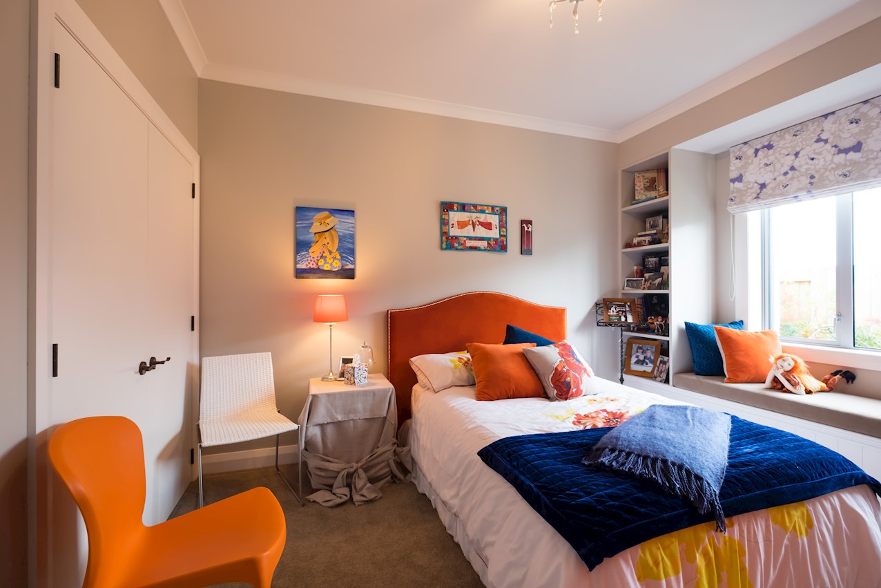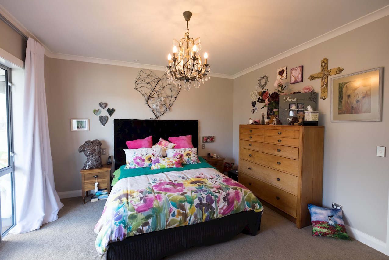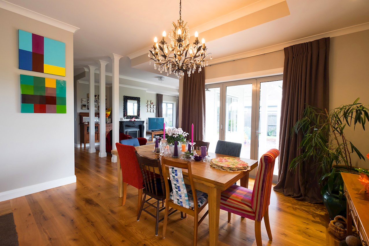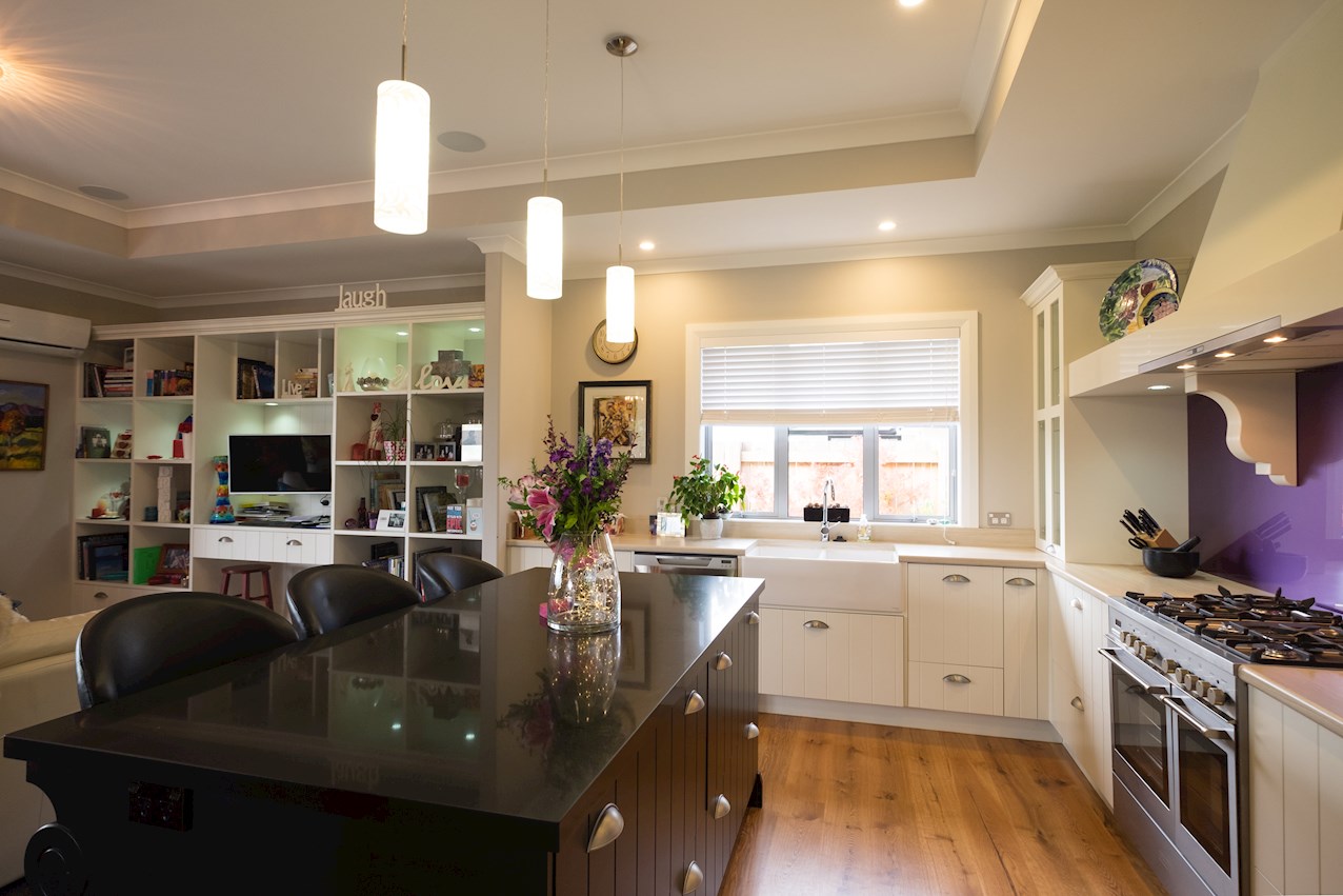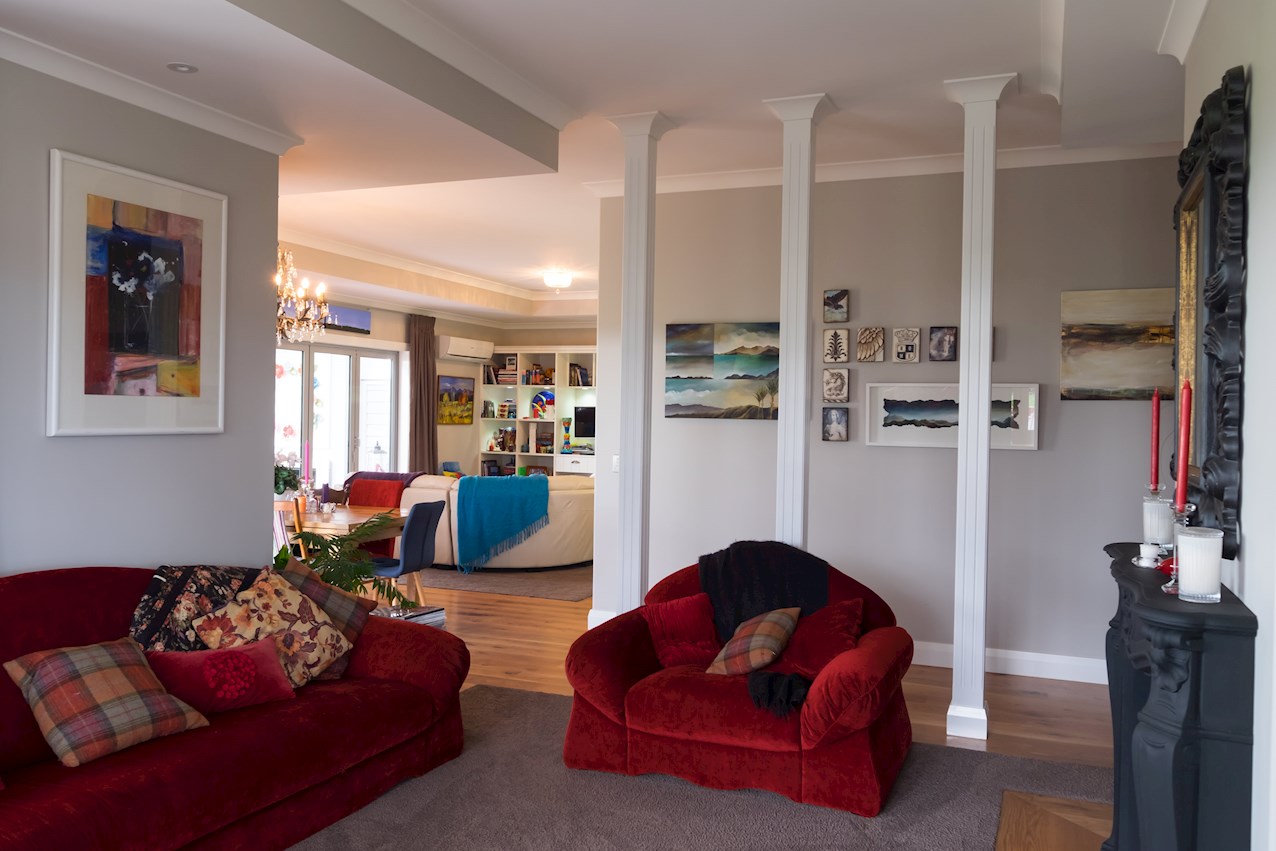 This modern take on a traditional villa hits the mark in Matamata. The fresh and light exterior is elegant and understated. A huge, wraparound deck conjures visions of summer soirees. The portico with gas fire warms late into the evening, so there’s no need to rush inside when the temperature drops. The classic yet contemporary interior boasts four bedrooms, two bathrooms and dual living spaces, including an open-plan layout. A black central island, purple splashback and stainless steel appliances give the entertainer’s haven a dramatic edge. Meanwhile, stepped ceilings, wide architraves and skirtings, and panelled doors foster a traditional feel. The antique bronze hardware on the doors deserves a medal. Window seats with bookshelves in the bedrooms are another fine feature. Plenty of storage, a laundry and a garage with attic are pleasingly practical additions. In the bathroom, the bold, beautiful freestanding tub is a light and lovely place to soak at the end of a long day.
