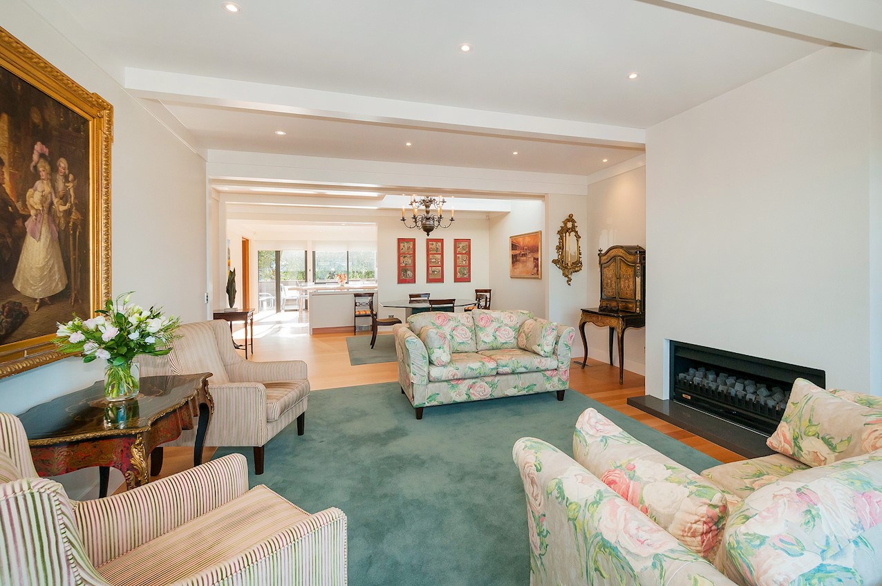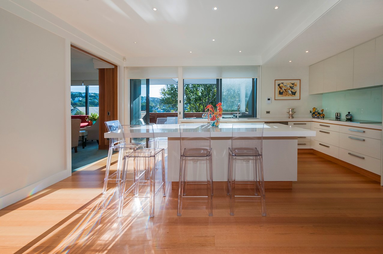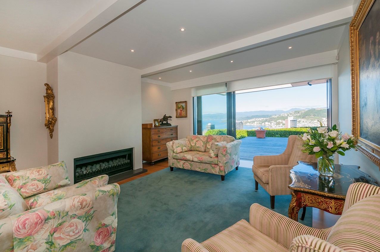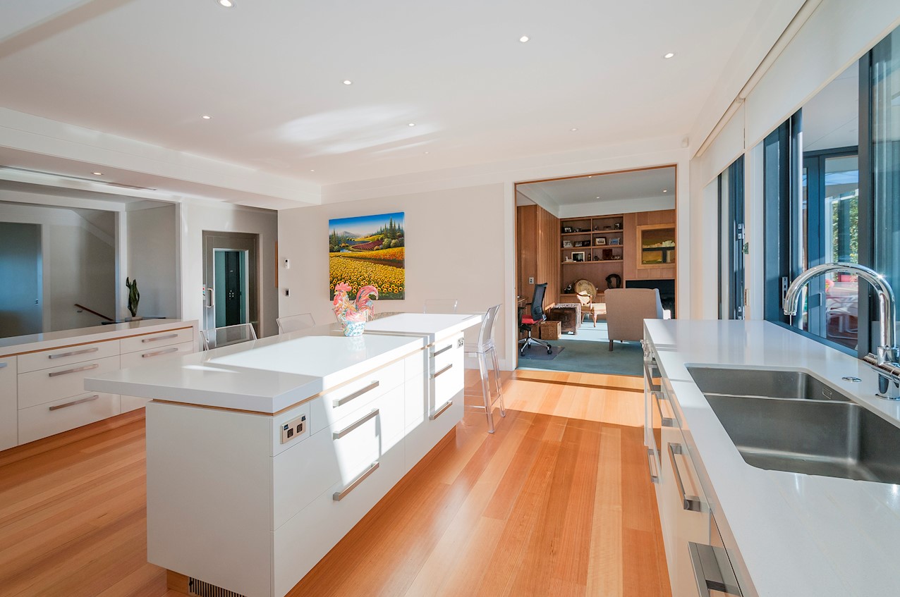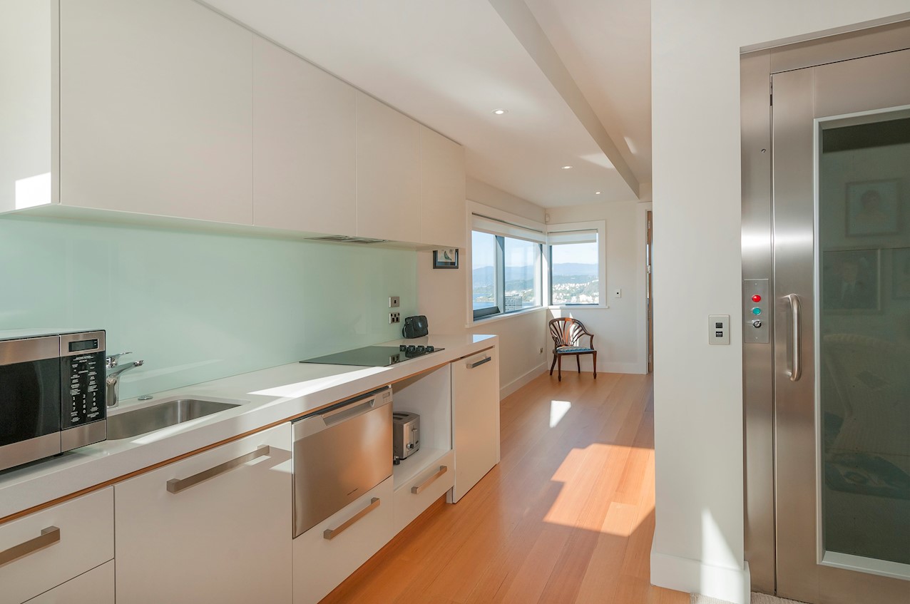 With its modern mix of cladding and playful folding planes, it’s clear from the outset that this is no ordinary Kelburn home. Step through the front gate and your suspicions will be confirmed. The home’s four large bedrooms all boast elegant tiled ensuites. Three cosy light-filled living rooms offer space to unwind, with views to boot. Two outdoor areas promise alfresco enjoyment. It all amounts to a grand total 521sqm of paradise, which includes a fully self-contained area for guests. The swimming pool is a year-round retreat, great for staying active in winter or simply relaxing at the end of a long day. An internal lift takes the legwork out of laidback living. Open-plan living is roomy, relaxed, refined and well-connected to the outdoors. The kitchen opens to a sheltered deck for easy serving. The living room flows out to a covered deck with breathtaking views of the city and water. Formal dining is positioned at the heart of it all under a chandelier.
