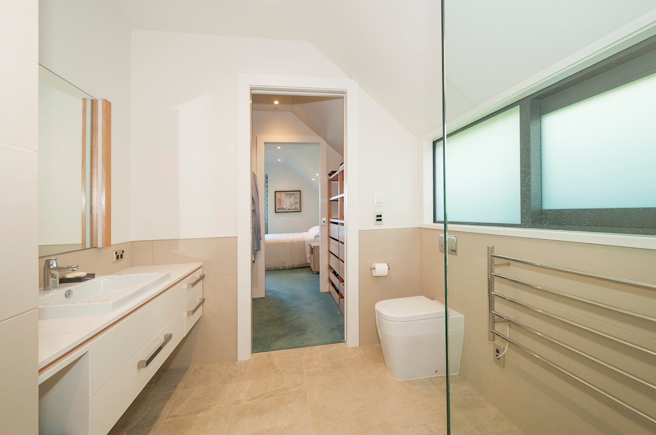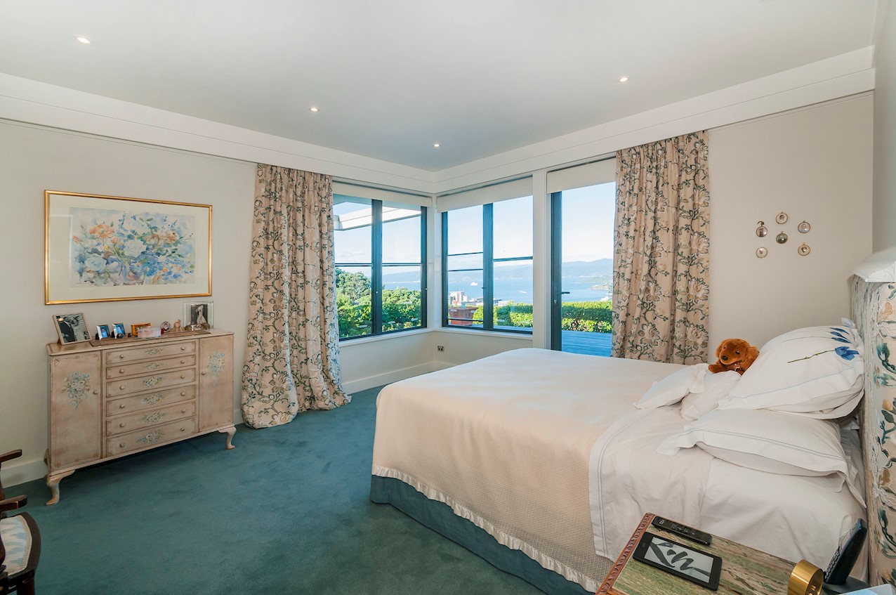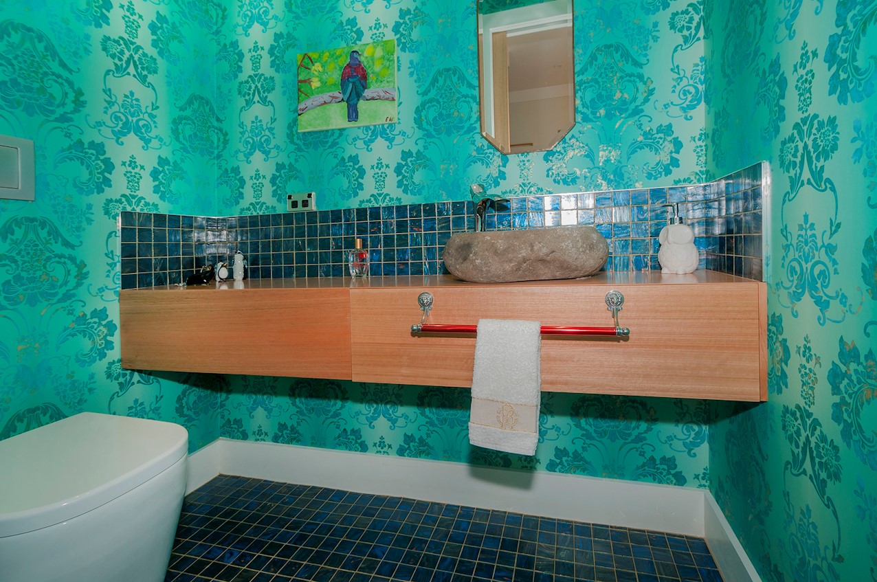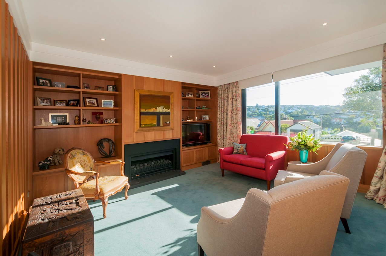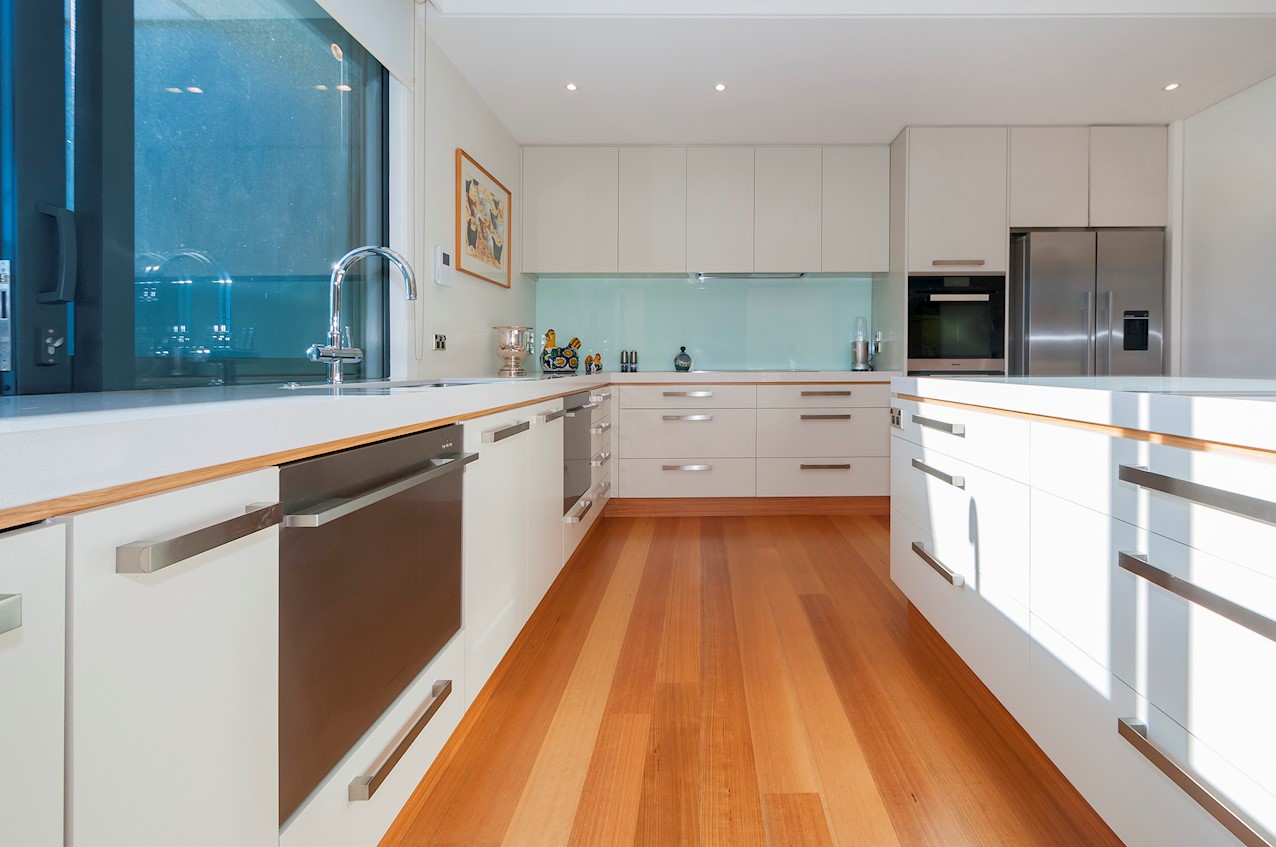 With its modern mix of cladding and playful folding planes, it’s clear from the outset that this is no ordinary Kelburn home. Step through the front gate and your suspicions will be confirmed. The home’s four large bedrooms all boast elegant tiled ensuites. Three cosy light-filled living rooms offer space to unwind, with views to boot. Two outdoor areas promise alfresco enjoyment. It all amounts to a grand total 521sqm of paradise, which includes a fully self-contained area for guests. The swimming pool is a year-round retreat, great for staying active in winter or simply relaxing at the end of a long day. An internal lift takes the legwork out of laidback living. Open-plan living is roomy, relaxed, refined and well-connected to the outdoors. The kitchen opens to a sheltered deck for easy serving. The living room flows out to a covered deck with breathtaking views of the city and water. Formal dining is positioned at the heart of it all under a chandelier.