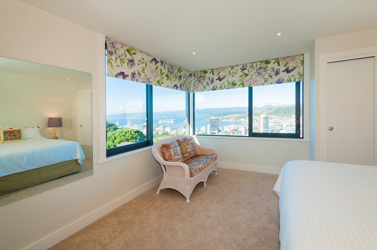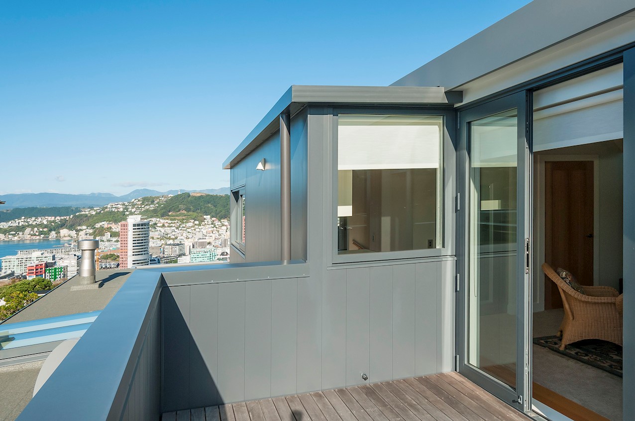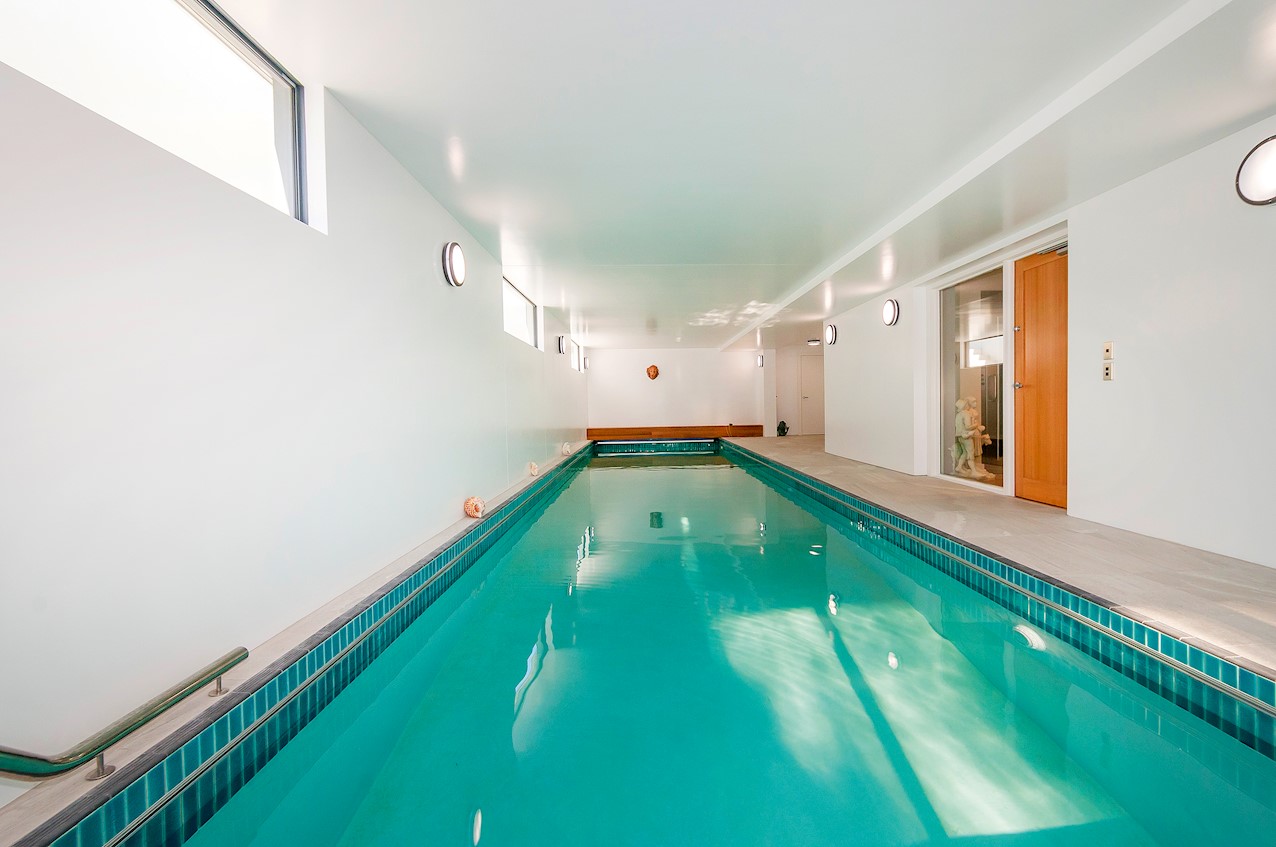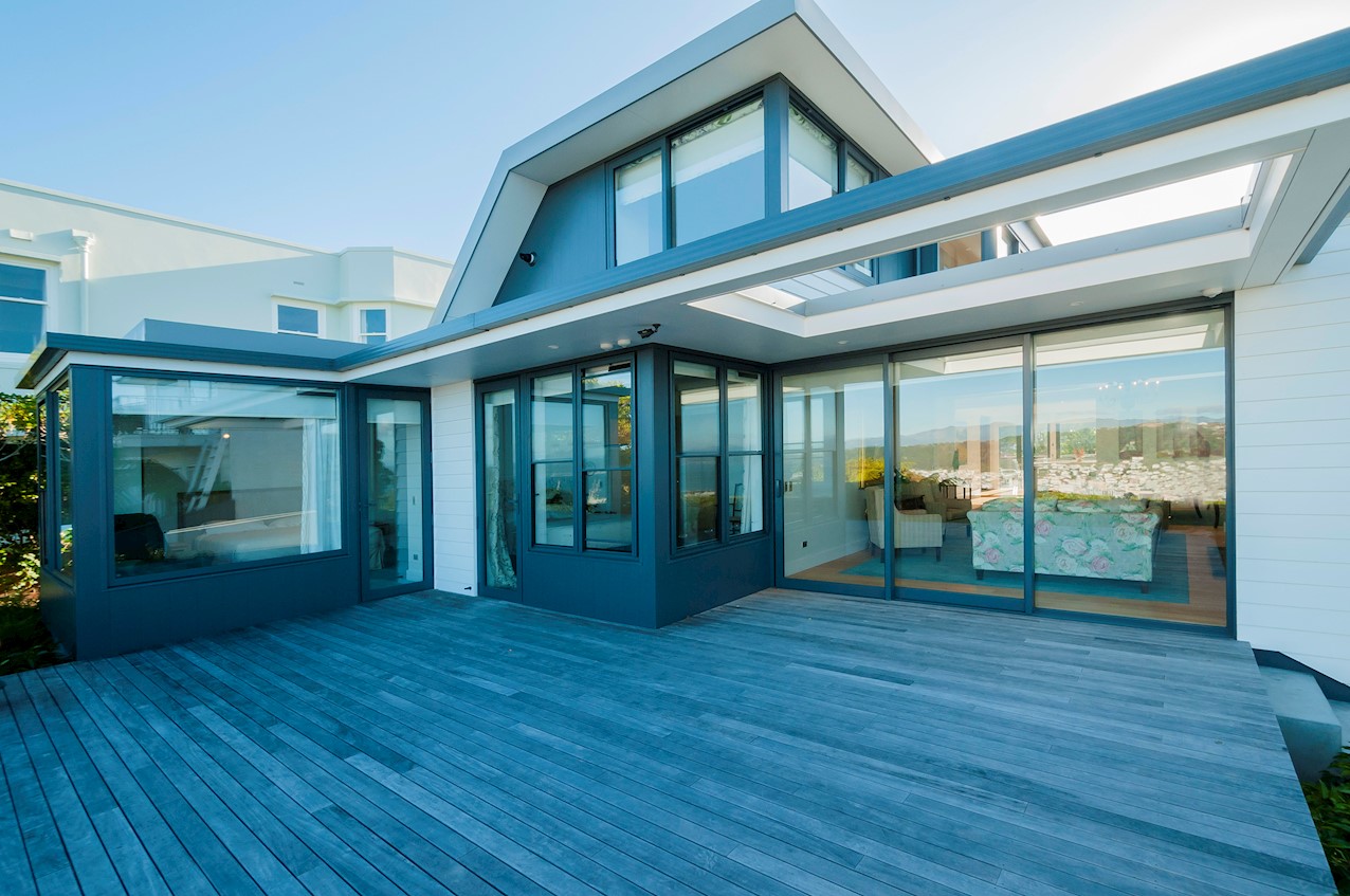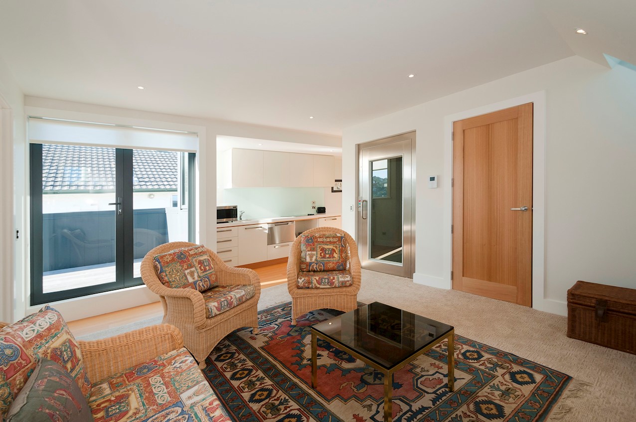 With its modern mix of cladding and playful folding planes, it’s clear from the outset that this is no ordinary Kelburn home. Step through the front gate and your suspicions will be confirmed. The home’s four large bedrooms all boast elegant tiled ensuites. Three cosy light-filled living rooms offer space to unwind, with views to boot. Two outdoor areas promise alfresco enjoyment. It all amounts to a grand total 521sqm of paradise, which includes a fully self-contained area for guests. The swimming pool is a year-round retreat, great for staying active in winter or simply relaxing at the end of a long day. An internal lift takes the legwork out of laidback living. Open-plan living is roomy, relaxed, refined and well-connected to the outdoors. The kitchen opens to a sheltered deck for easy serving. The living room flows out to a covered deck with breathtaking views of the city and water. Formal dining is positioned at the heart of it all under a chandelier.