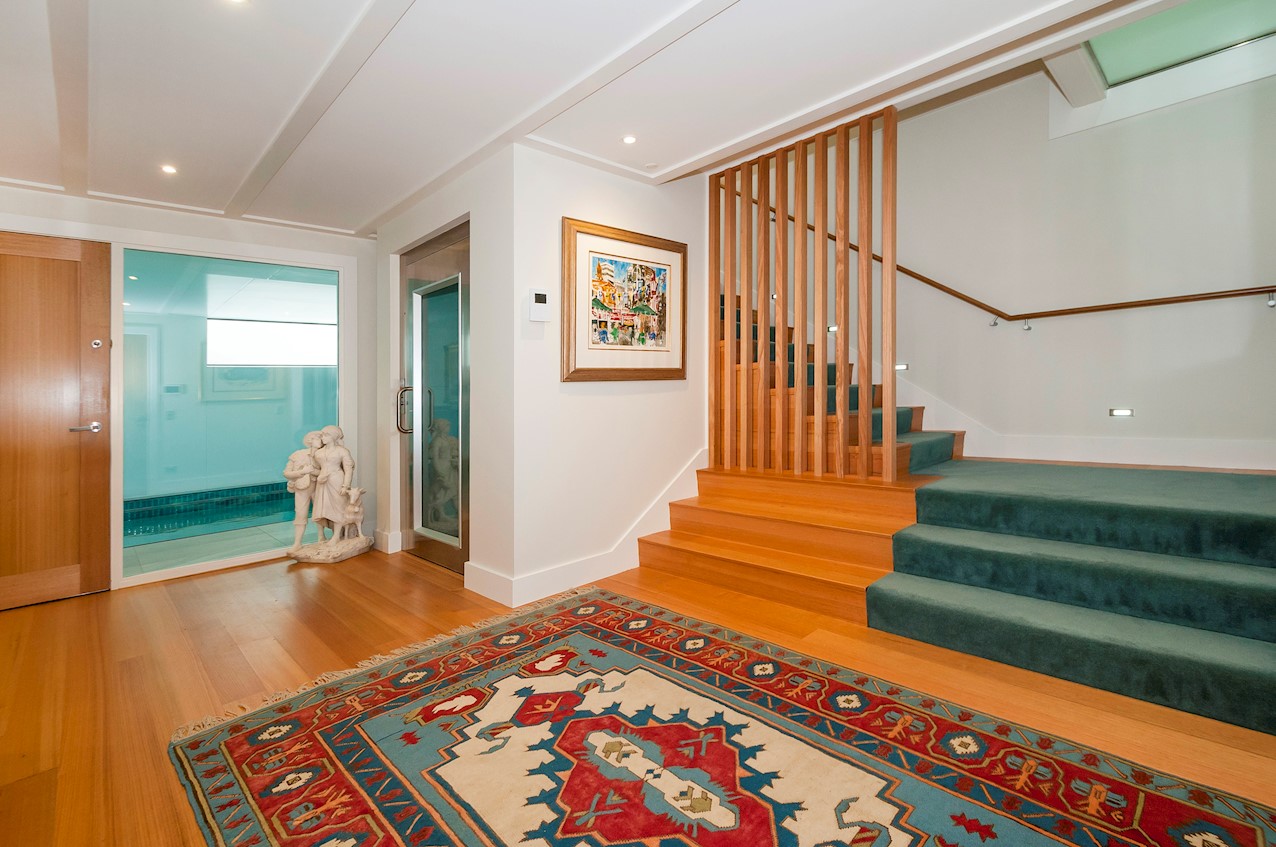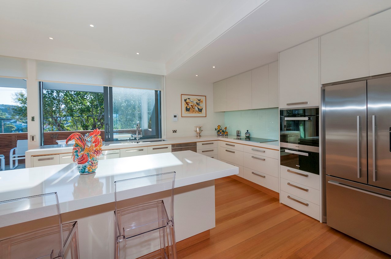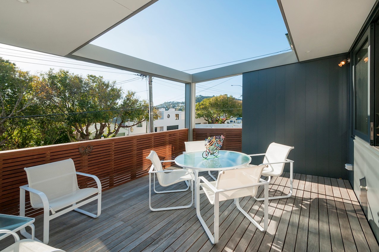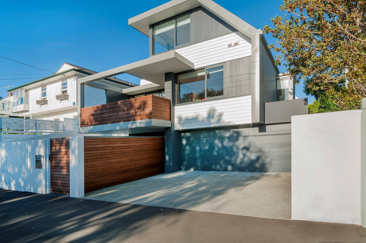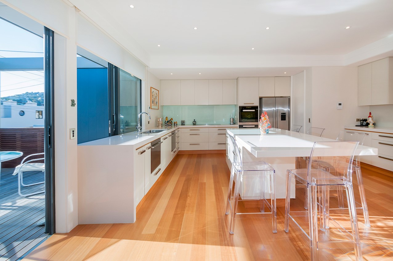 With its modern mix of cladding and playful folding planes, it’s clear from the outset that this is no ordinary Kelburn home. Step through the front gate and your suspicions will be confirmed. The home’s four large bedrooms all boast elegant tiled ensuites. Three cosy light-filled living rooms offer space to unwind, with views to boot. Two outdoor areas promise alfresco enjoyment. It all amounts to a grand total 521sqm of paradise, which includes a fully self-contained area for guests. The swimming pool is a year-round retreat, great for staying active in winter or simply relaxing at the end of a long day. An internal lift takes the legwork out of laidback living. Open-plan living is roomy, relaxed, refined and well-connected to the outdoors. The kitchen opens to a sheltered deck for easy serving. The living room flows out to a covered deck with breathtaking views of the city and water. Formal dining is positioned at the heart of it all under a chandelier.