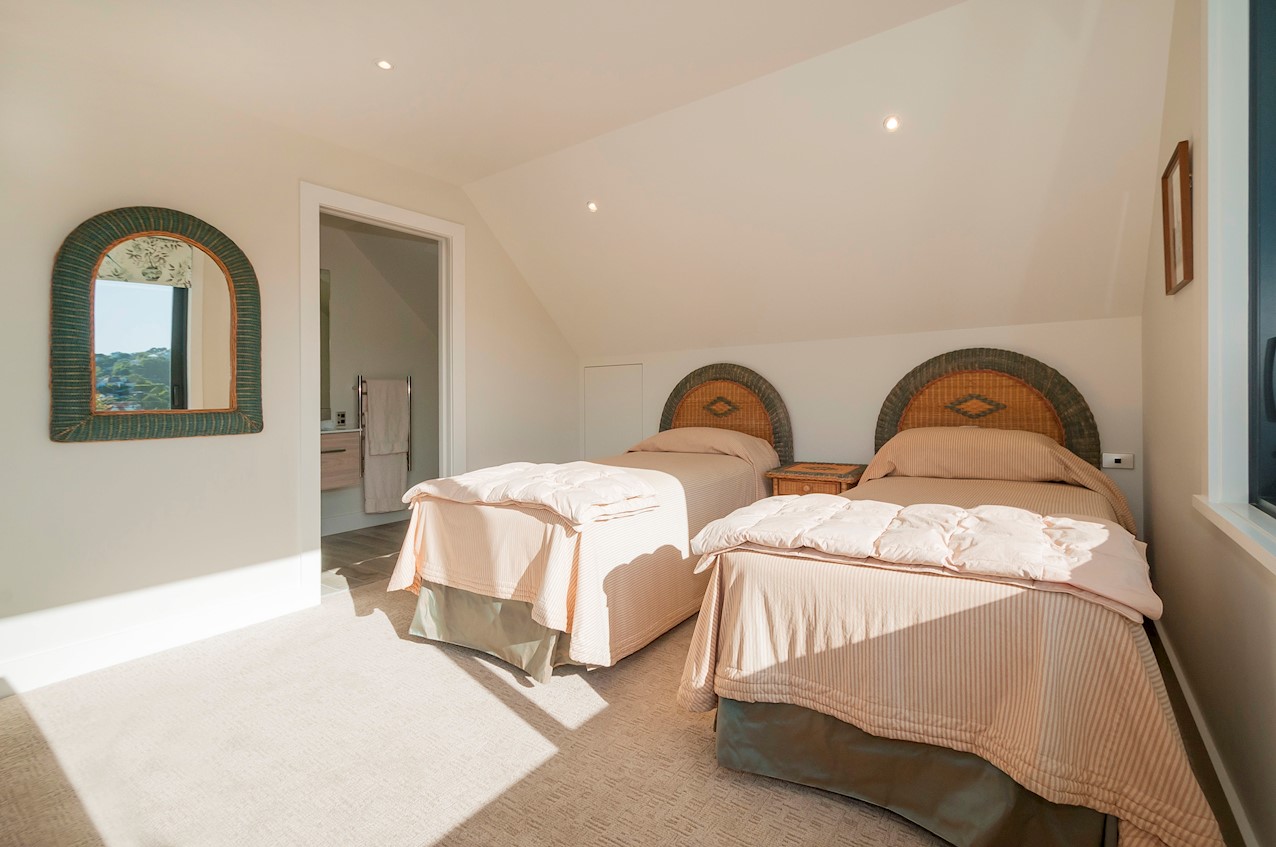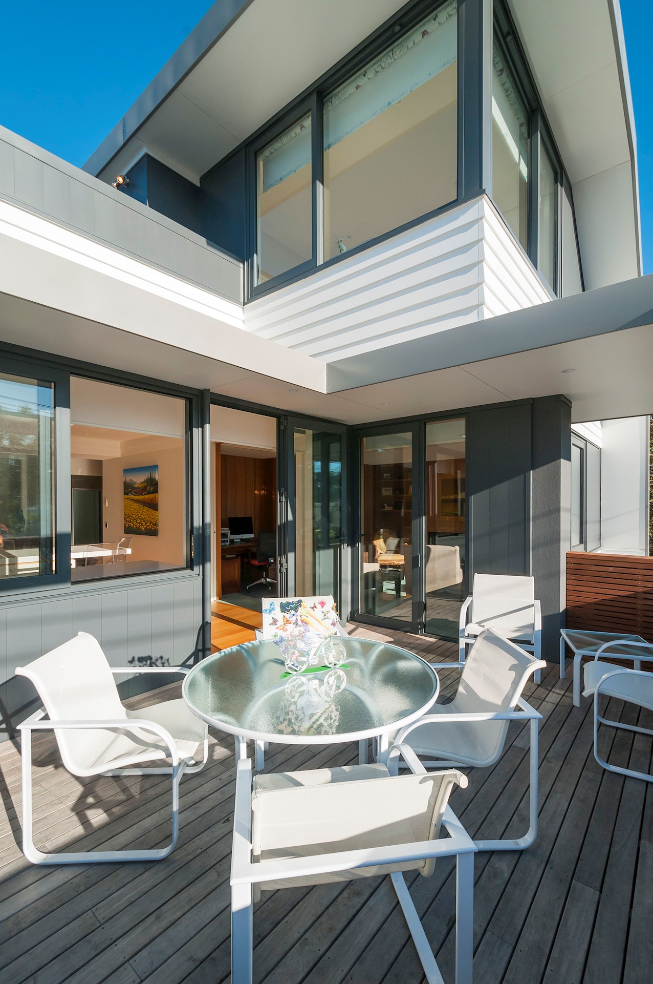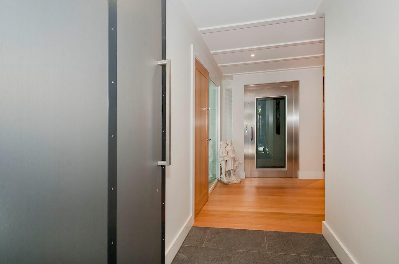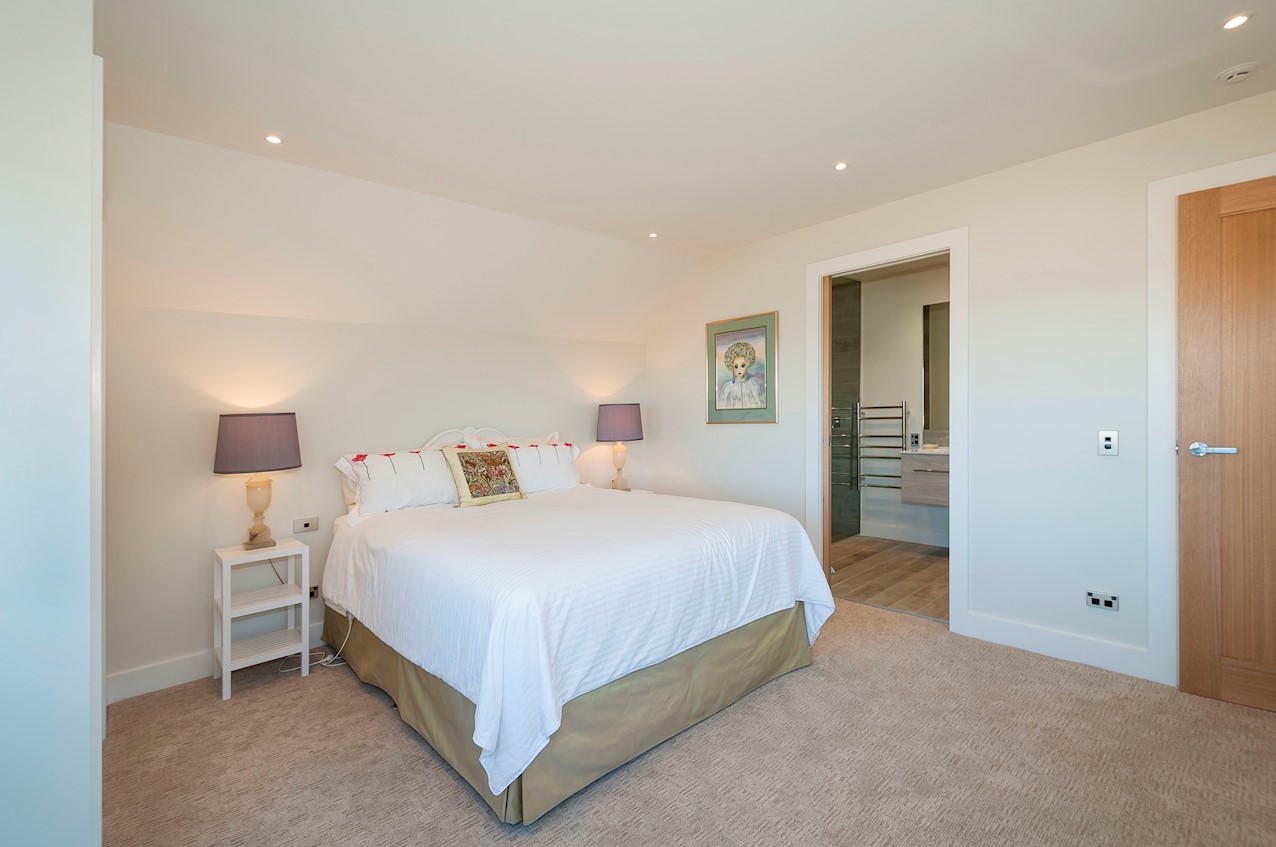 With its modern mix of cladding and playful folding planes, it’s clear from the outset that this is no ordinary Kelburn home. Step through the front gate and your suspicions will be confirmed. The home’s four large bedrooms all boast elegant tiled ensuites. Three cosy light-filled living rooms offer space to unwind, with views to boot. Two outdoor areas promise alfresco enjoyment. It all amounts to a grand total 521sqm of paradise, which includes a fully self-contained area for guests. The swimming pool is a year-round retreat, great for staying active in winter or simply relaxing at the end of a long day. An internal lift takes the legwork out of laidback living. Open-plan living is roomy, relaxed, refined and well-connected to the outdoors. The kitchen opens to a sheltered deck for easy serving. The living room flows out to a covered deck with breathtaking views of the city and water. Formal dining is positioned at the heart of it all under a chandelier.