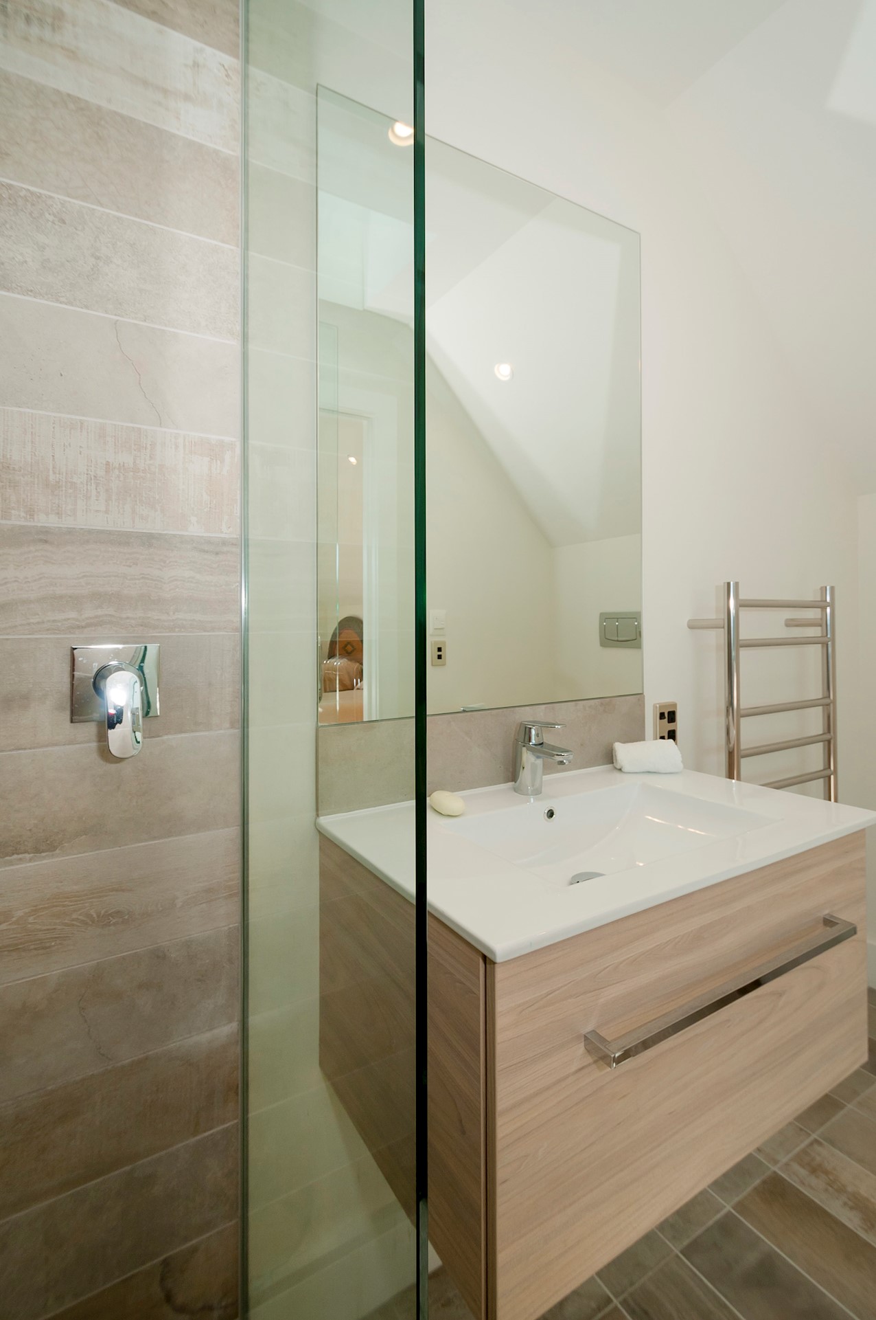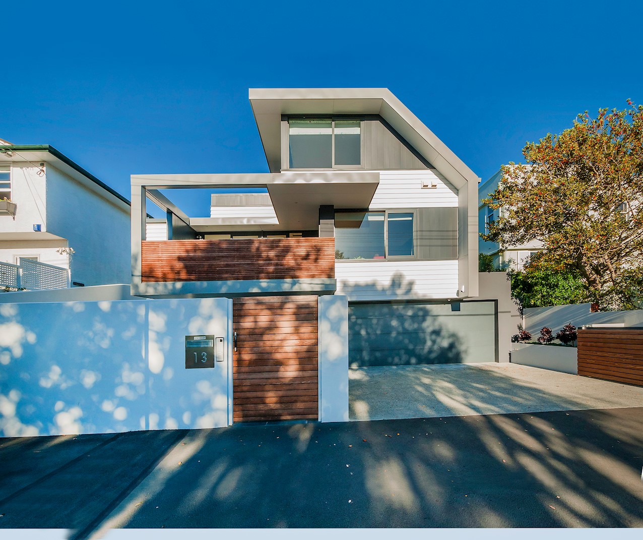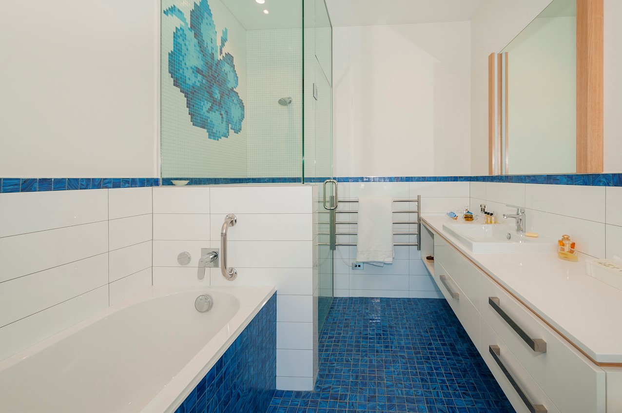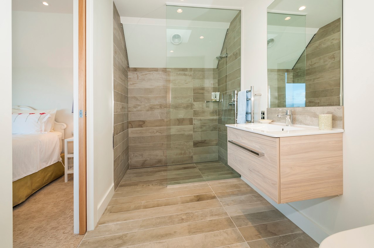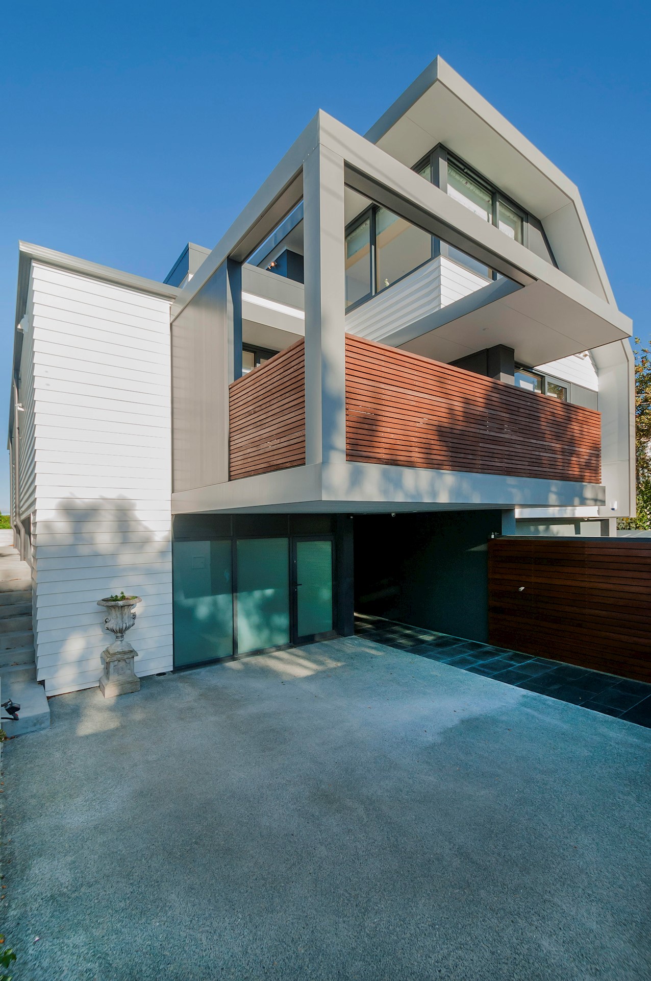 With its modern mix of cladding and playful folding planes, it’s clear from the outset that this is no ordinary Kelburn home. Step through the front gate and your suspicions will be confirmed. The home’s four large bedrooms all boast elegant tiled ensuites. Three cosy light-filled living rooms offer space to unwind, with views to boot. Two outdoor areas promise alfresco enjoyment. It all amounts to a grand total 521sqm of paradise, which includes a fully self-contained area for guests. The swimming pool is a year-round retreat, great for staying active in winter or simply relaxing at the end of a long day. An internal lift takes the legwork out of laidback living. Open-plan living is roomy, relaxed, refined and well-connected to the outdoors. The kitchen opens to a sheltered deck for easy serving. The living room flows out to a covered deck with breathtaking views of the city and water. Formal dining is positioned at the heart of it all under a chandelier.