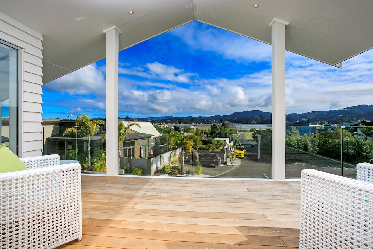 It’s also upstairs that the white kitchen – a minimalist’s dream – and hidden scullery, with open-plan dining and living can be found. Step outside onto the glass-sided deck and take in the vistas.
