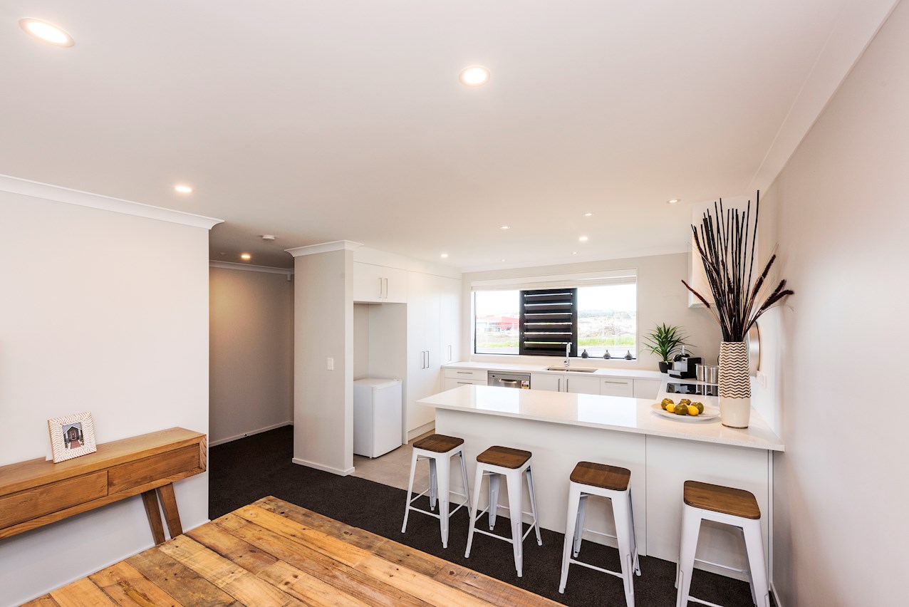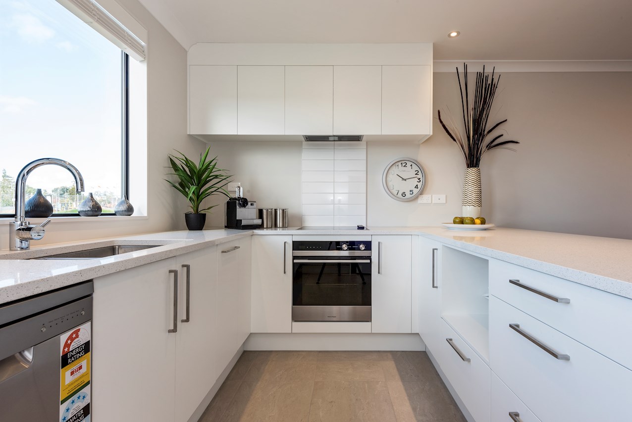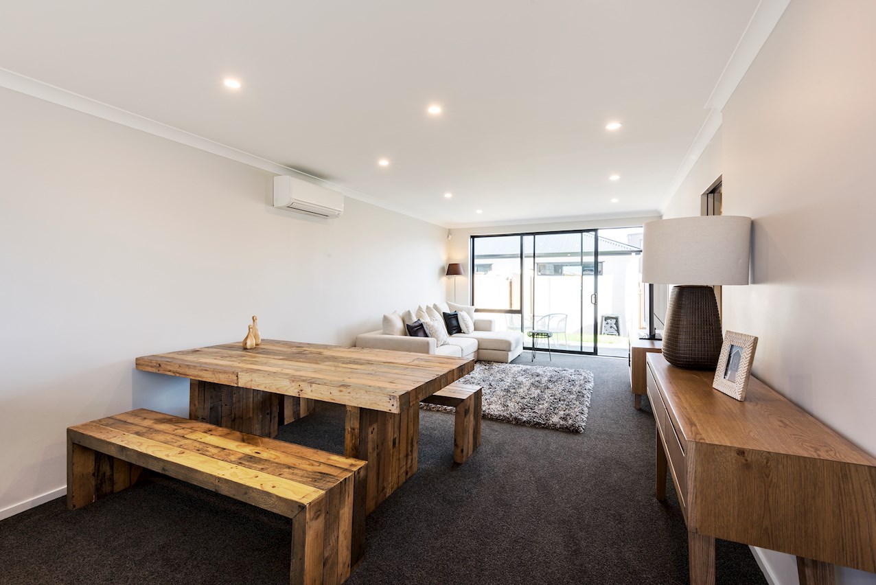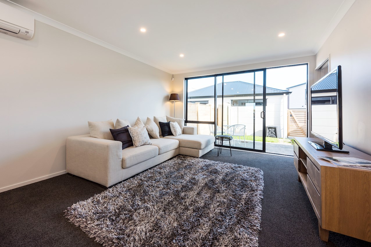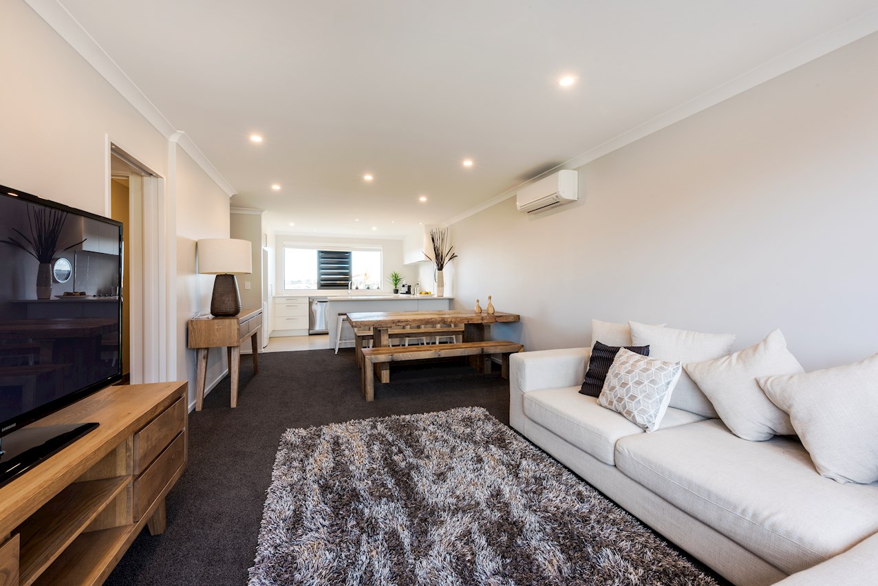 Awash in white and natural light, the contemporary kitchen gazes out large windows in one direction and over the dining and living space in the other. The clever, compact layout boasts a dishwasher, modern oven and discreet space for a washing machine. Cosy carpet takes the floor in the rest of the living space. Warm vibes are enhanced by the heat pump.
