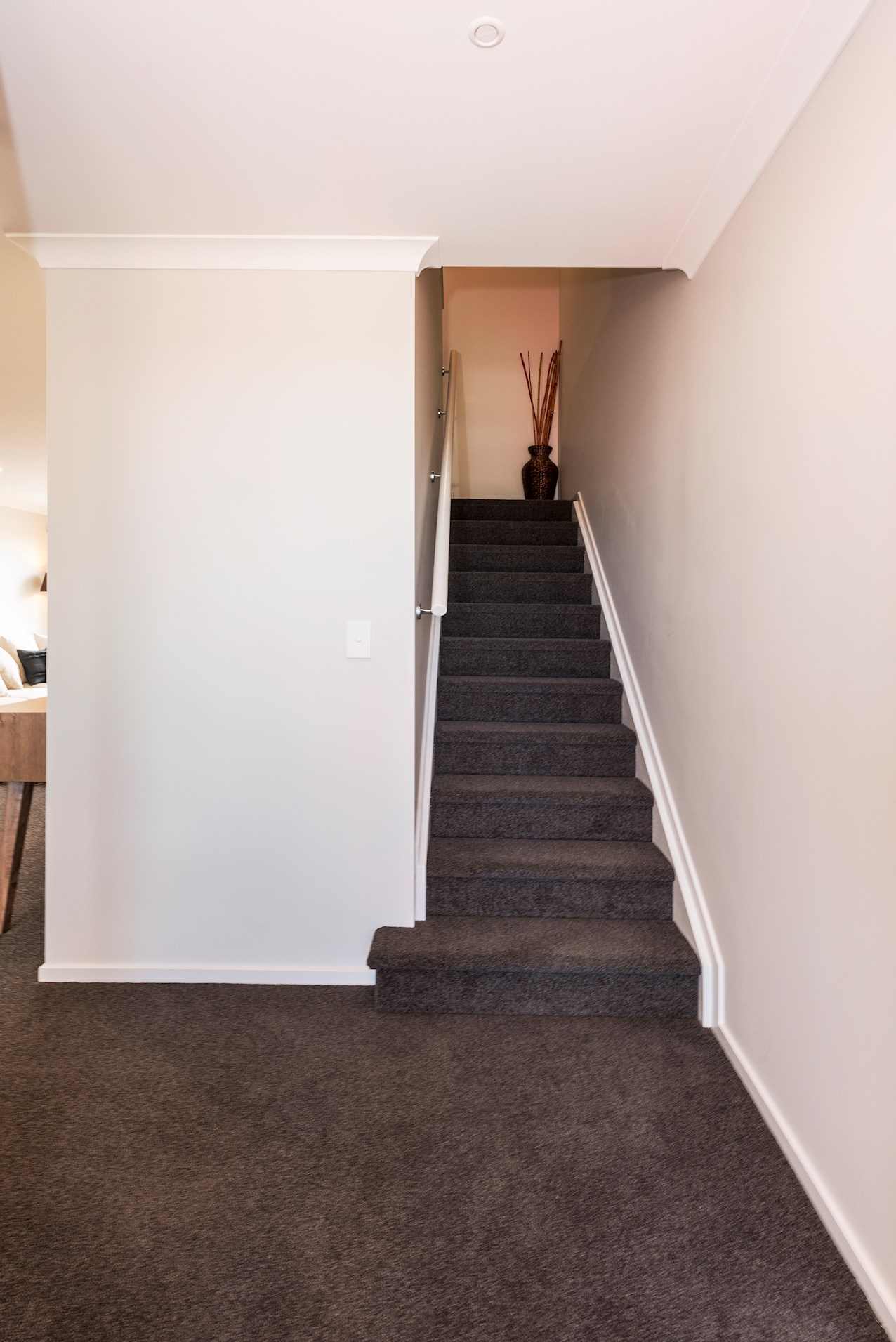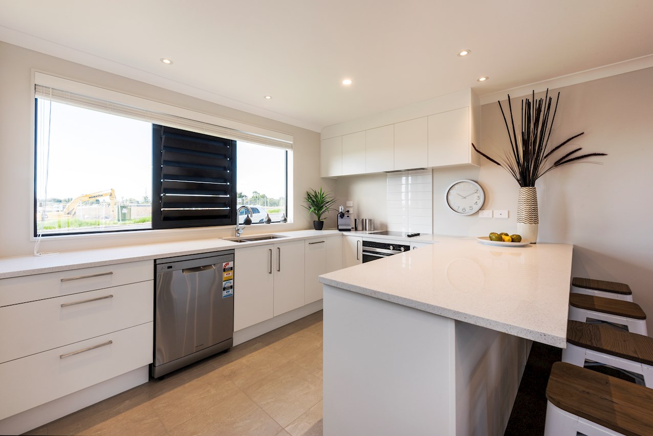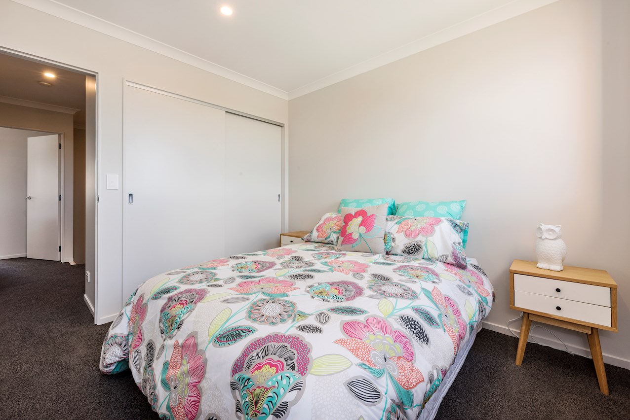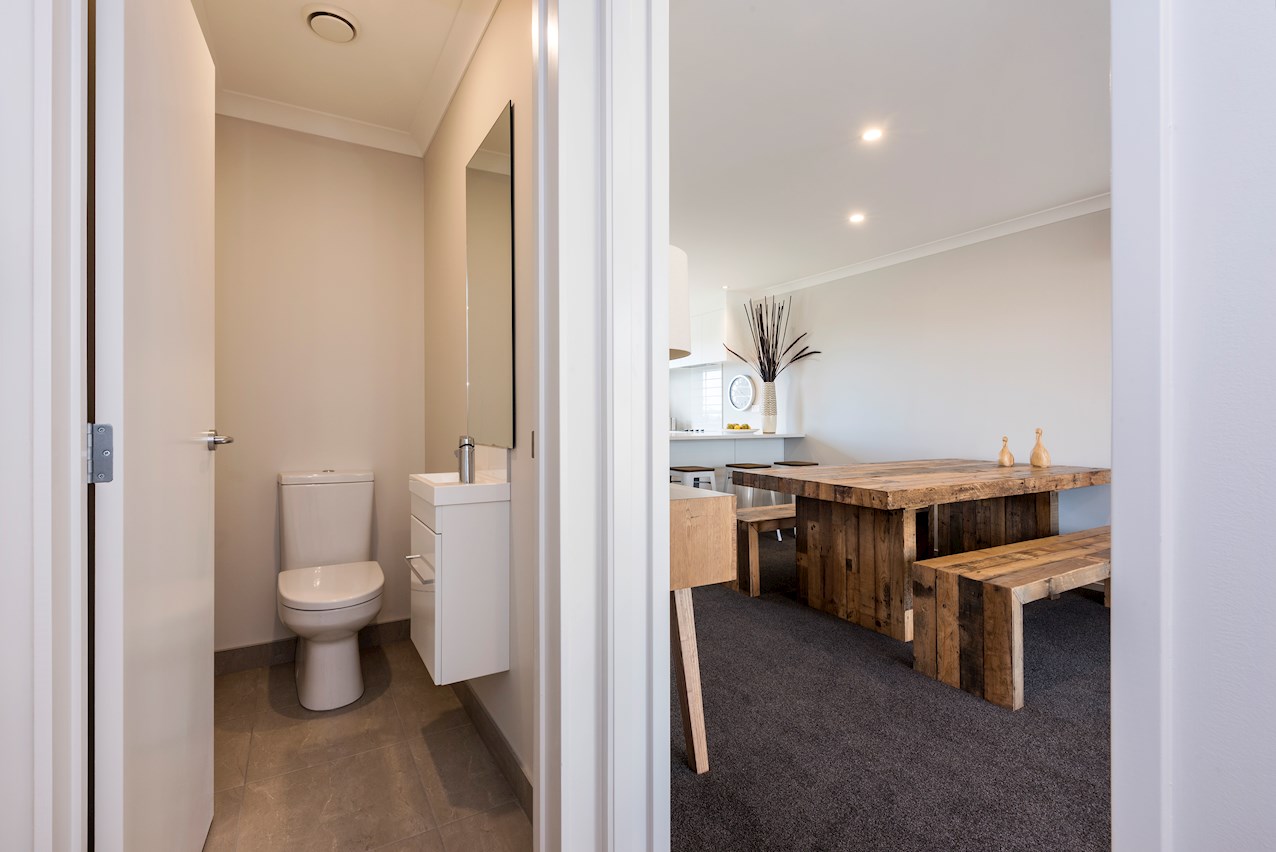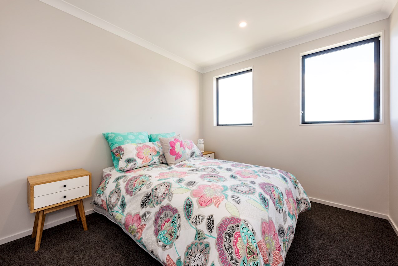 Awash in white and natural light, the contemporary kitchen gazes out large windows in one direction and over the dining and living space in the other. The clever, compact layout boasts a dishwasher, modern oven and discreet space for a washing machine. Cosy carpet takes the floor in the rest of the living space. Warm vibes are enhanced by the heat pump.