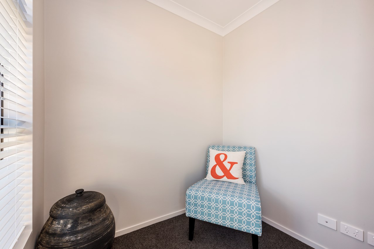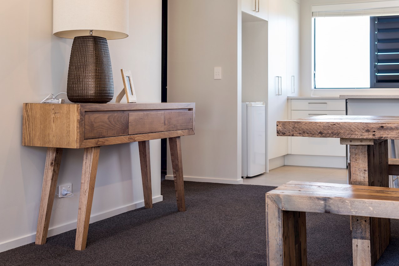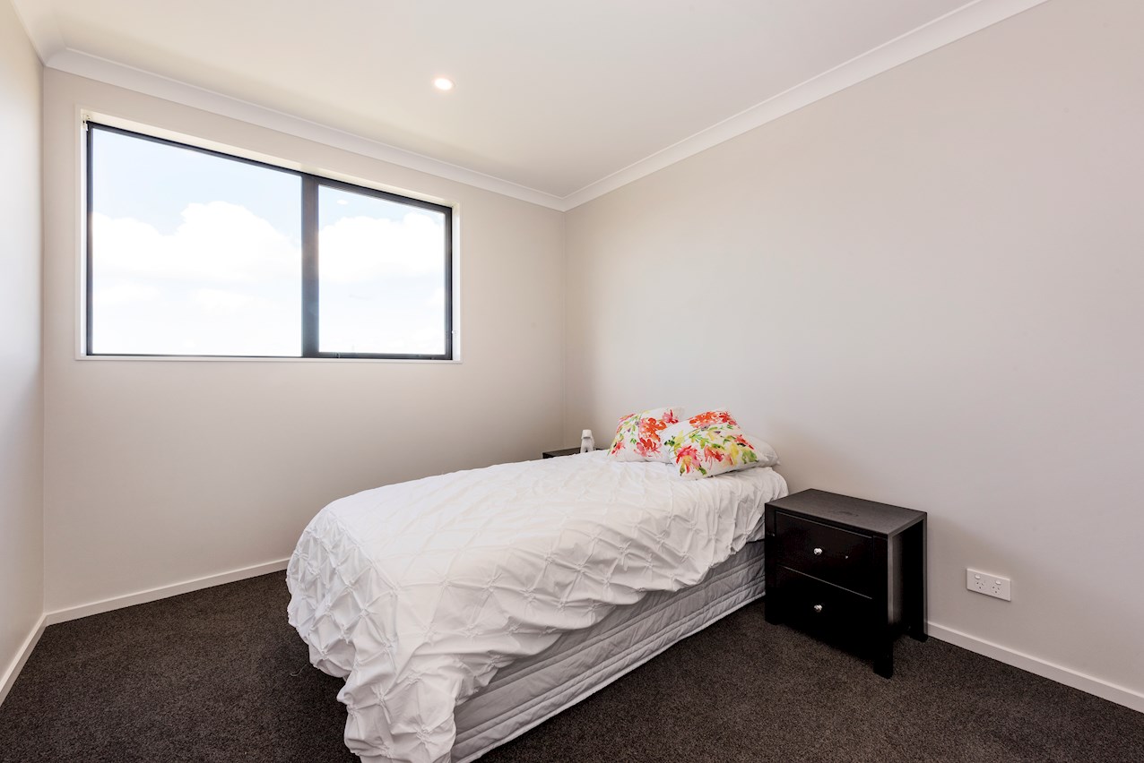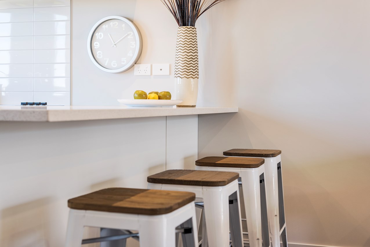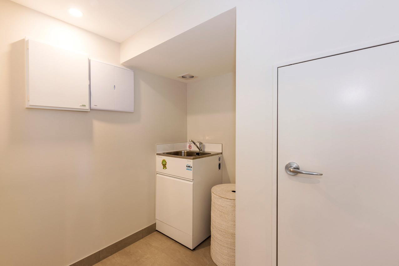 Awash in white and natural light, the contemporary kitchen gazes out large windows in one direction and over the dining and living space in the other. The clever, compact layout boasts a dishwasher, modern oven and discreet space for a washing machine. Cosy carpet takes the floor in the rest of the living space. Warm vibes are enhanced by the heat pump.