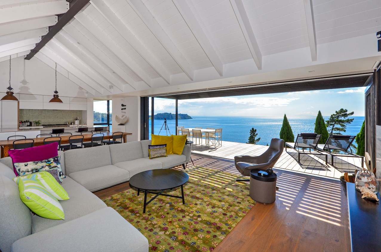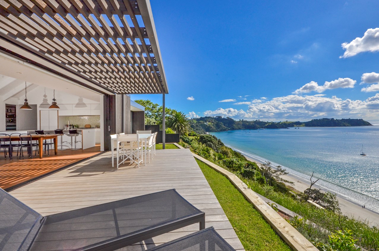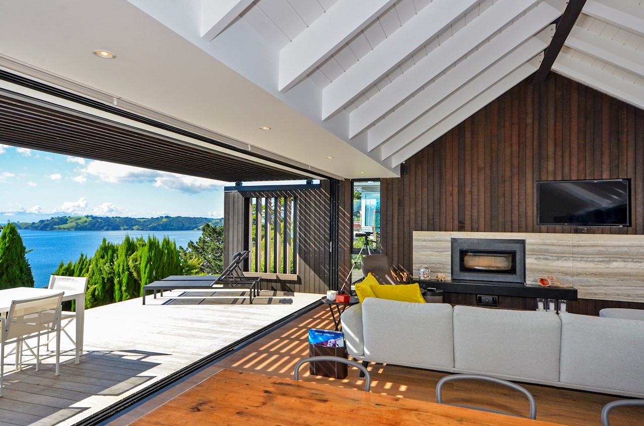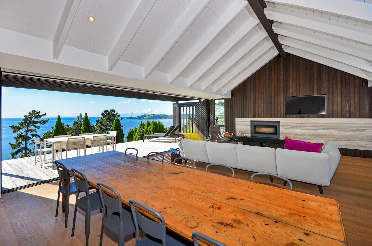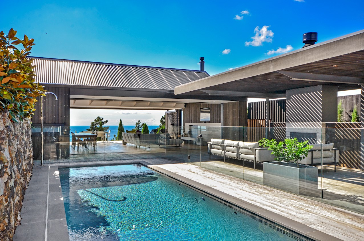 Paradise is best enjoyed with company, but a little privacy shouldn’t be underestimated. This elegant three-bedroom, three-bathroom residence on Waiheke Island serves up two single-storey dwelling spaces linked – but also separated – by a beautifully designed courtyard and pool area with outdoor fire.