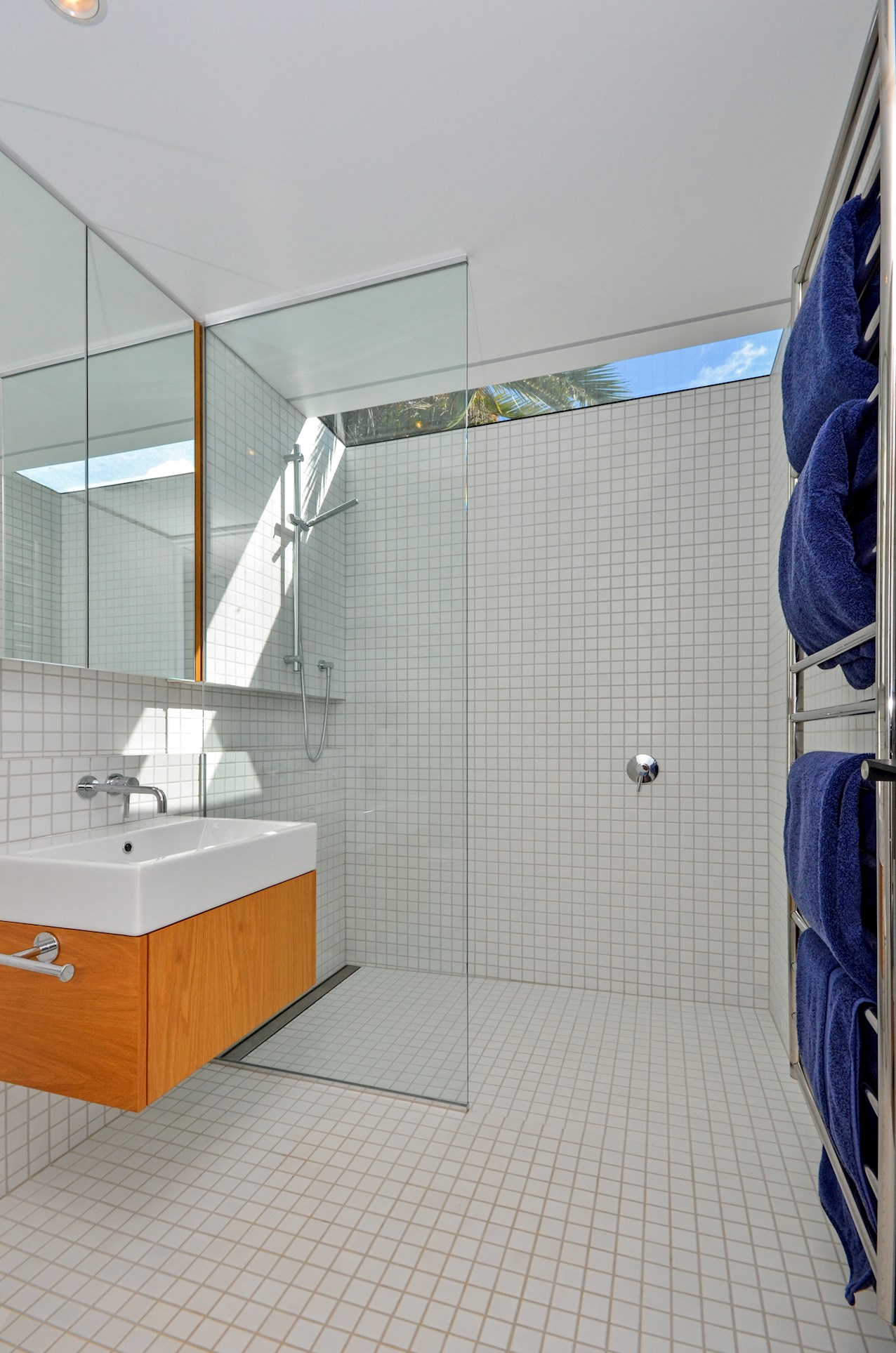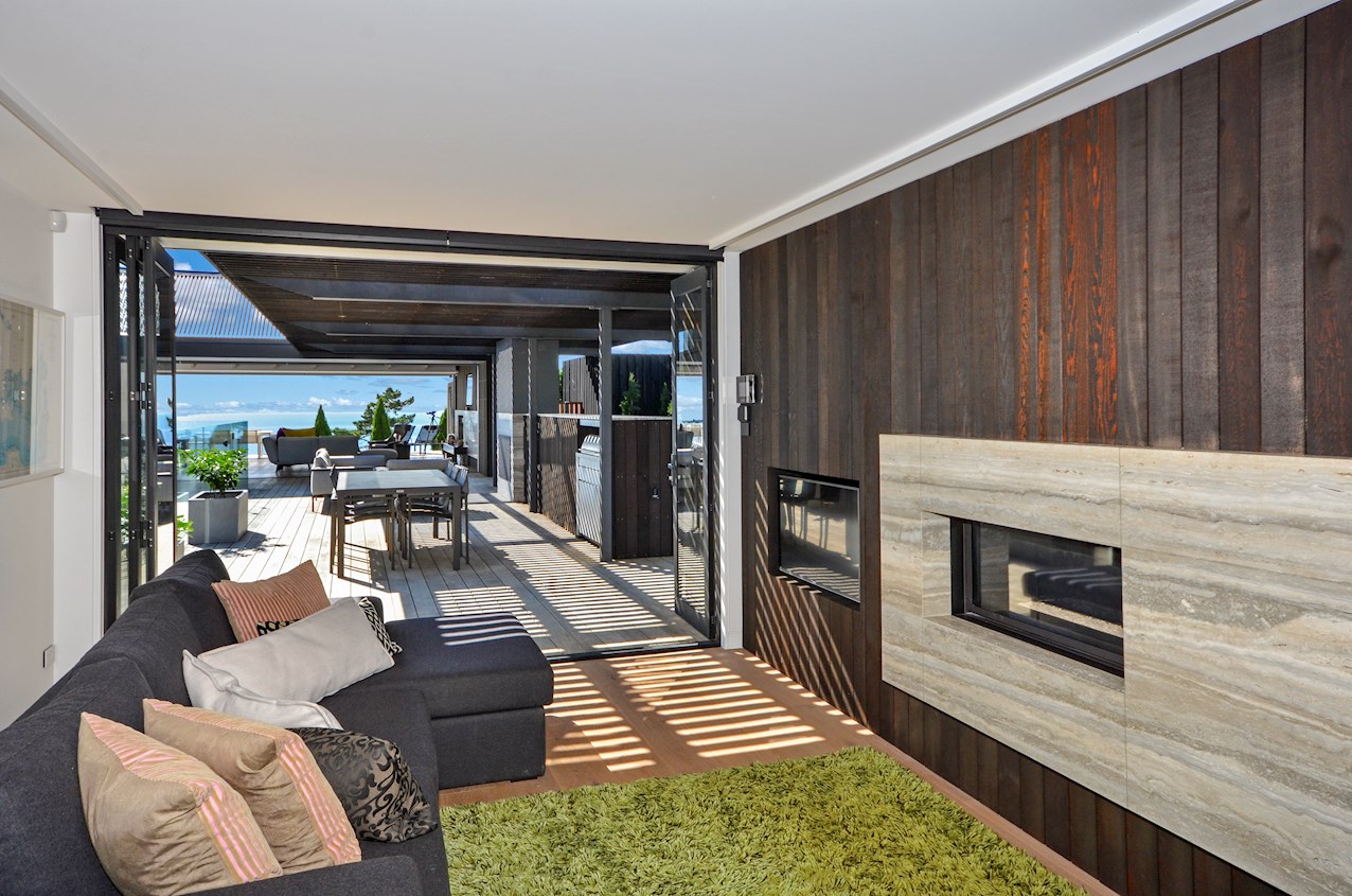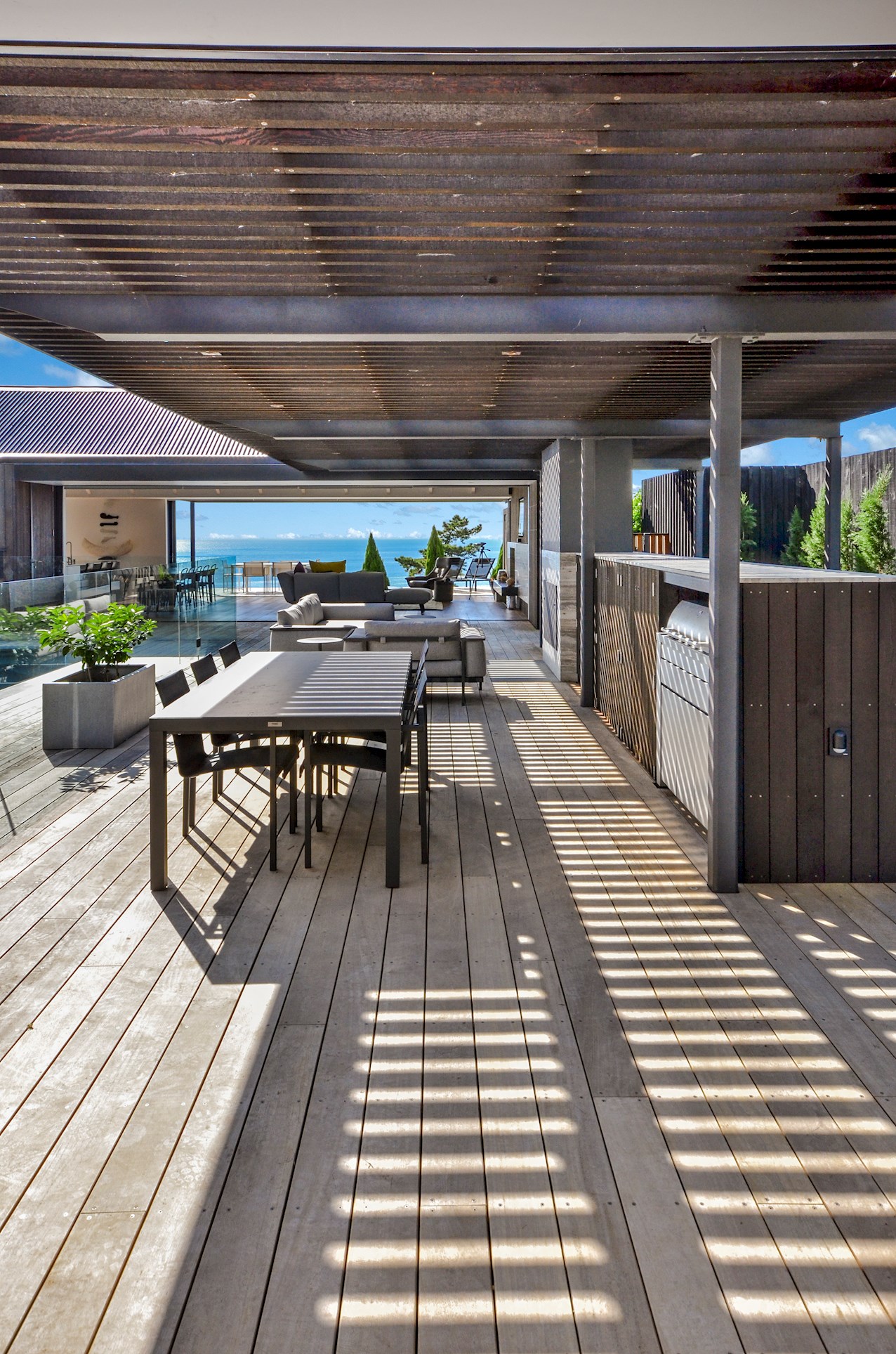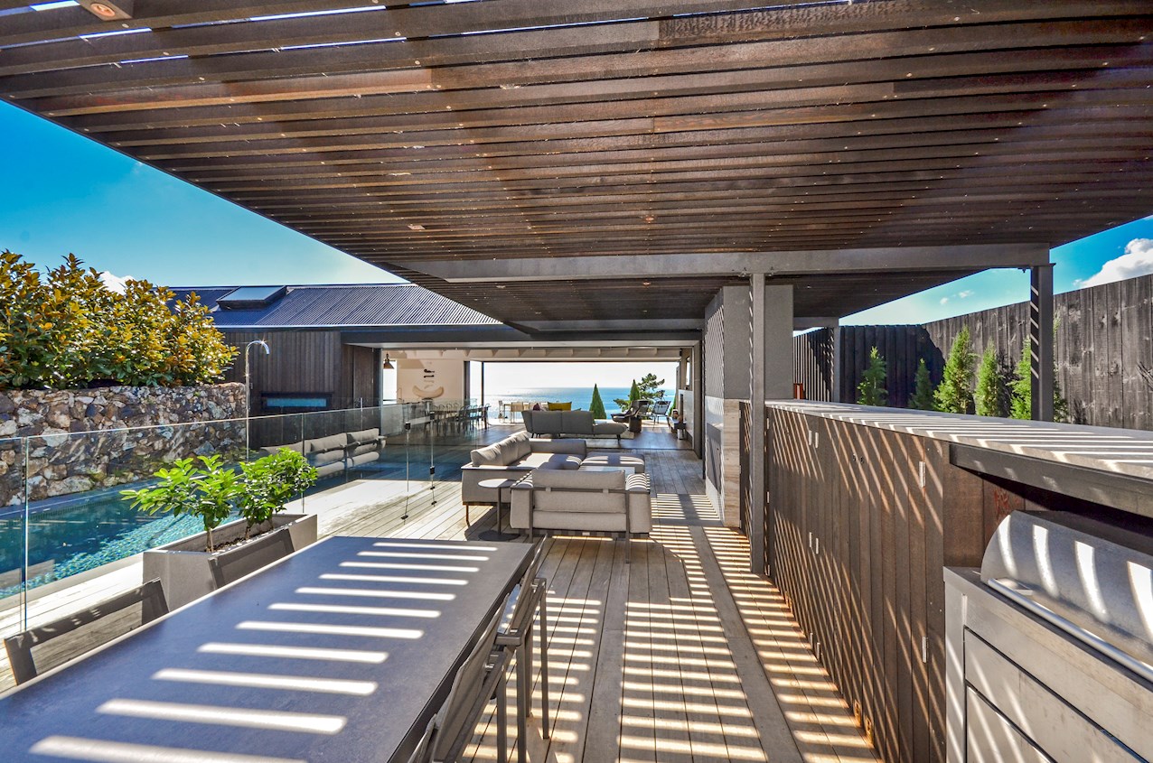 The living space flows to a covered deck for lounging, lunching or both. Its louvred roof maximises use year-round. Screens and planting maintain privacy from neighbours without compromising the view.