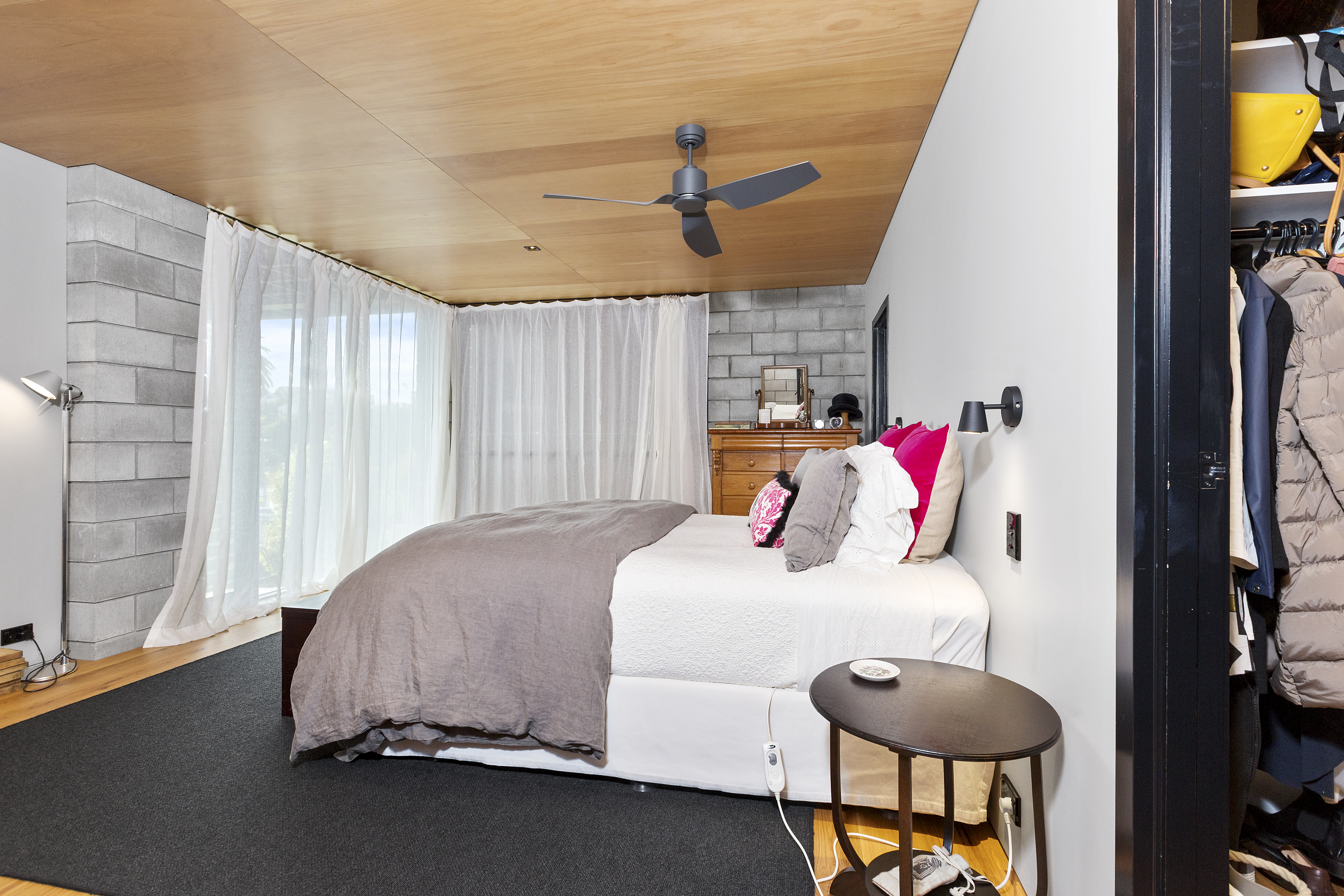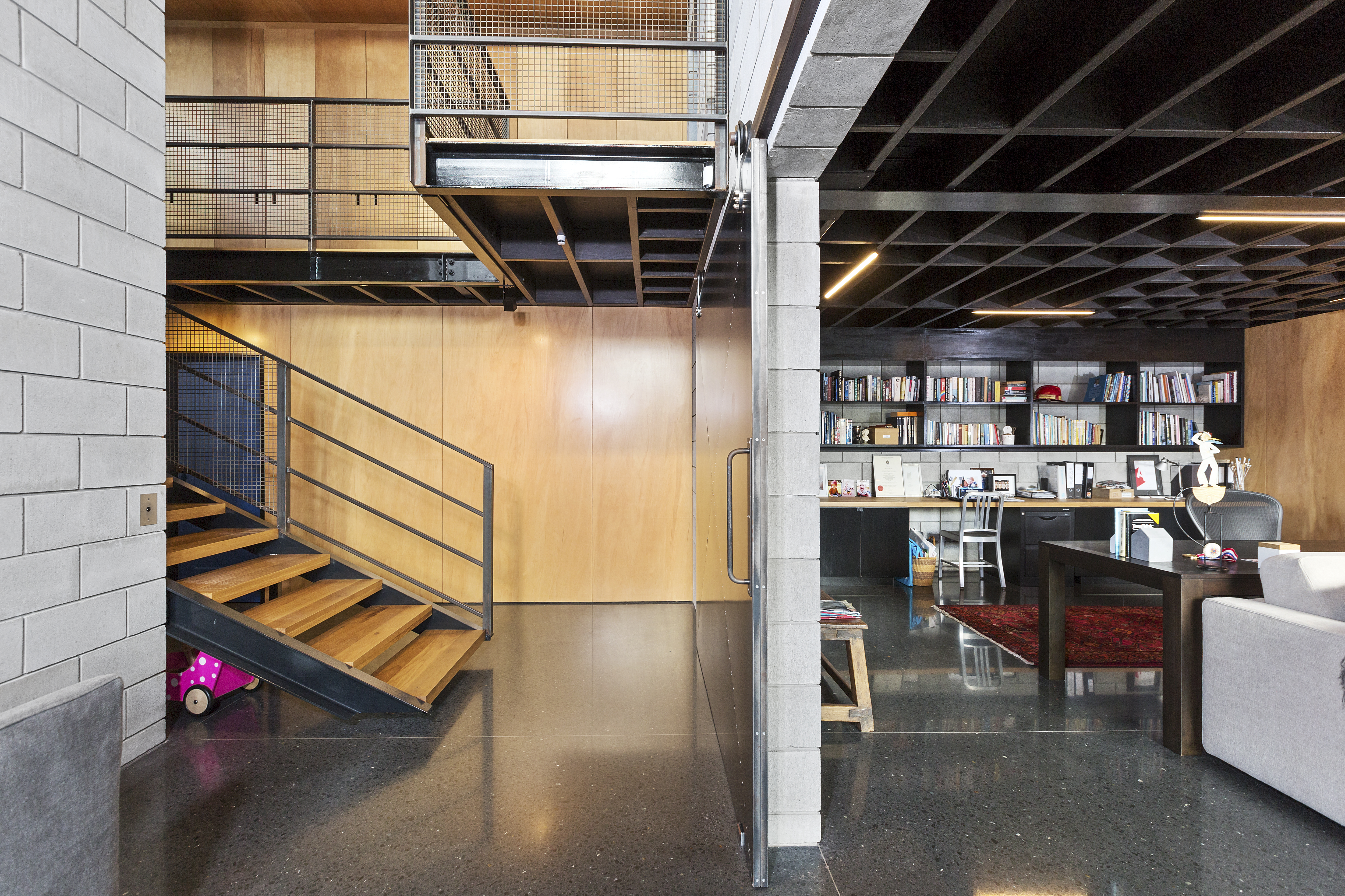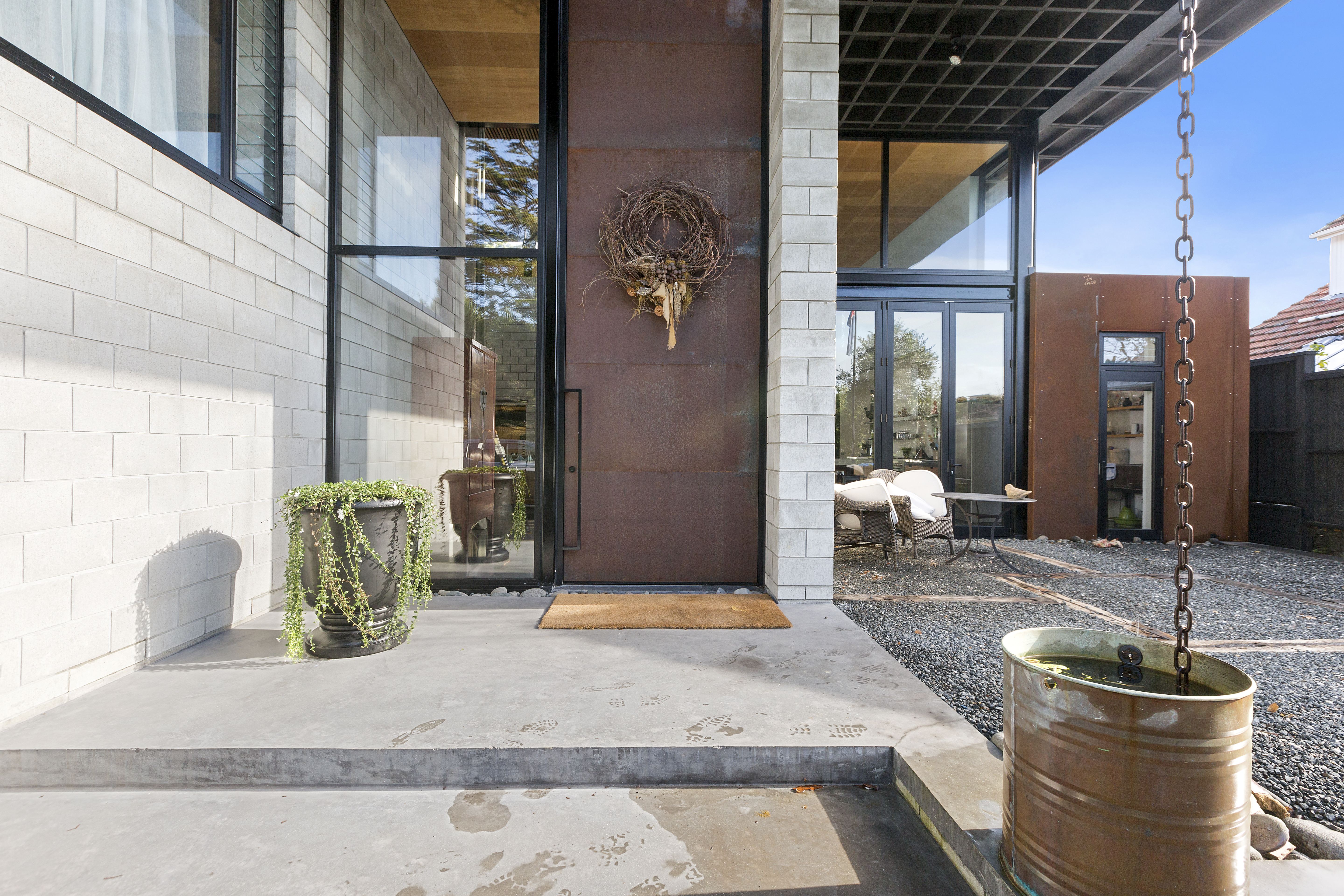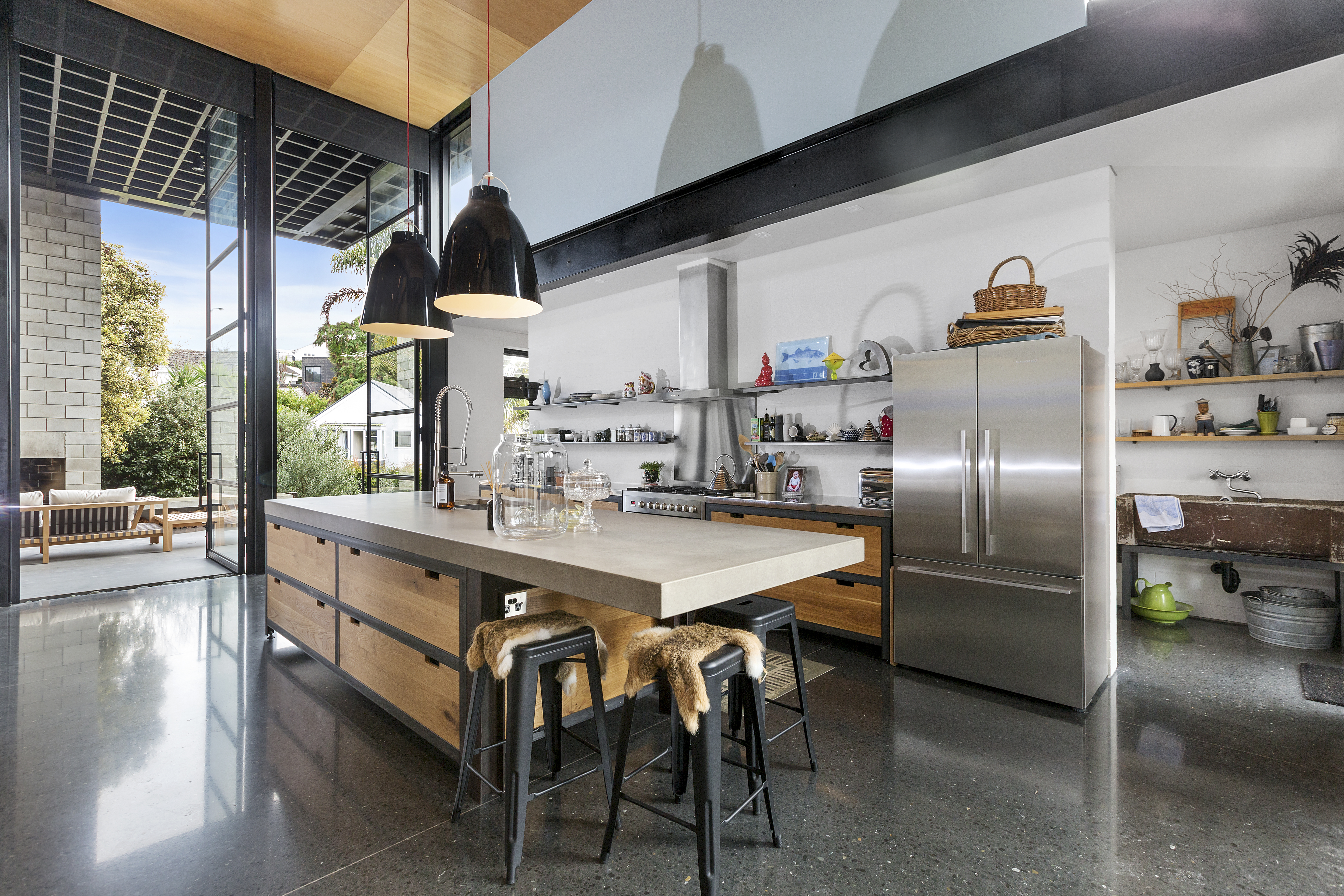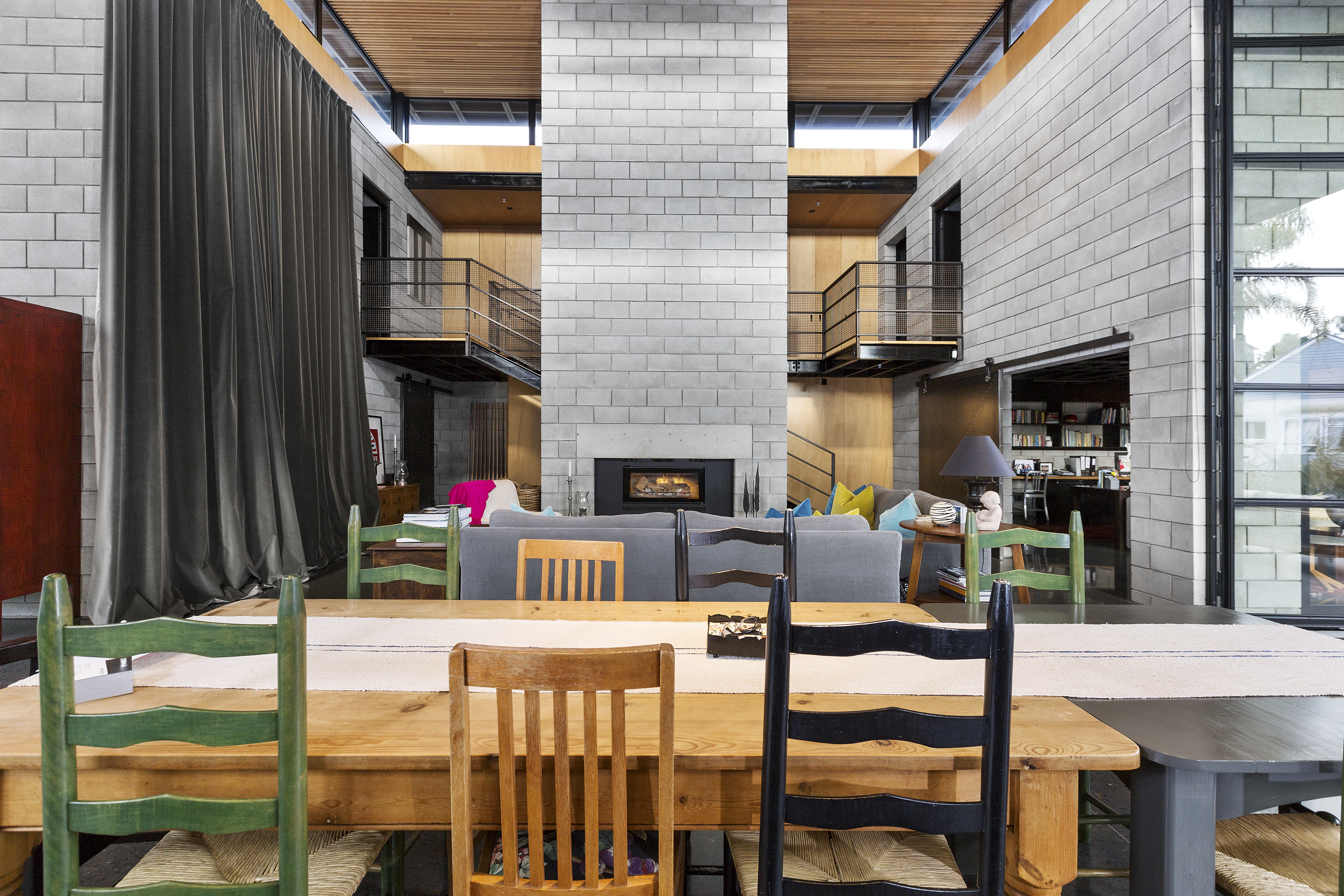 Entrance through the grand double-height steel-framed doors into the cavernous open-plan kitchen/dining/living space is dramatic. This effect is amped up by a full-drop velvet curtain which aids acoustics as do the cedar battened ceilings. Kauri ply linings and recycled wooden doors from the former State house on the site lend warmth and character.