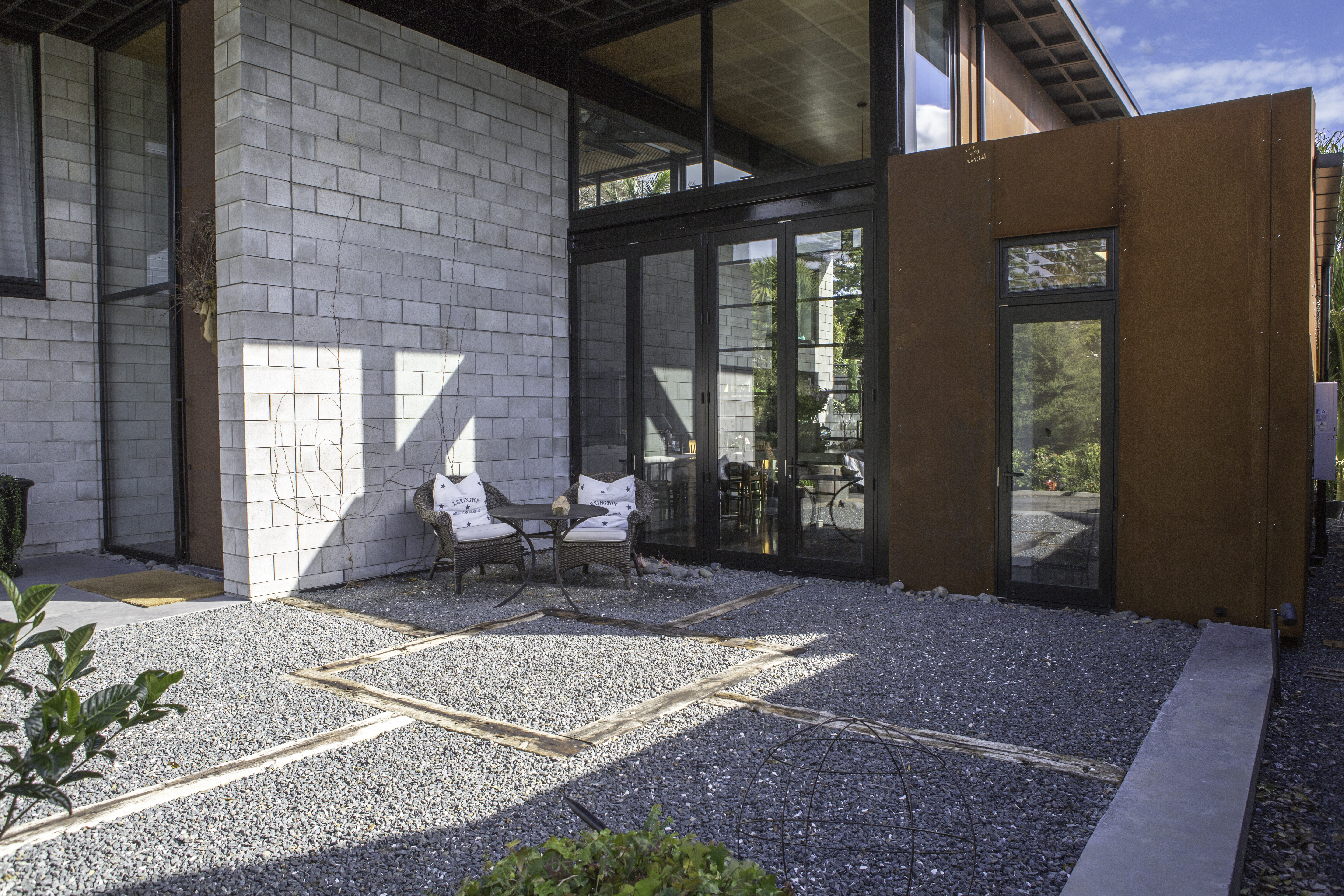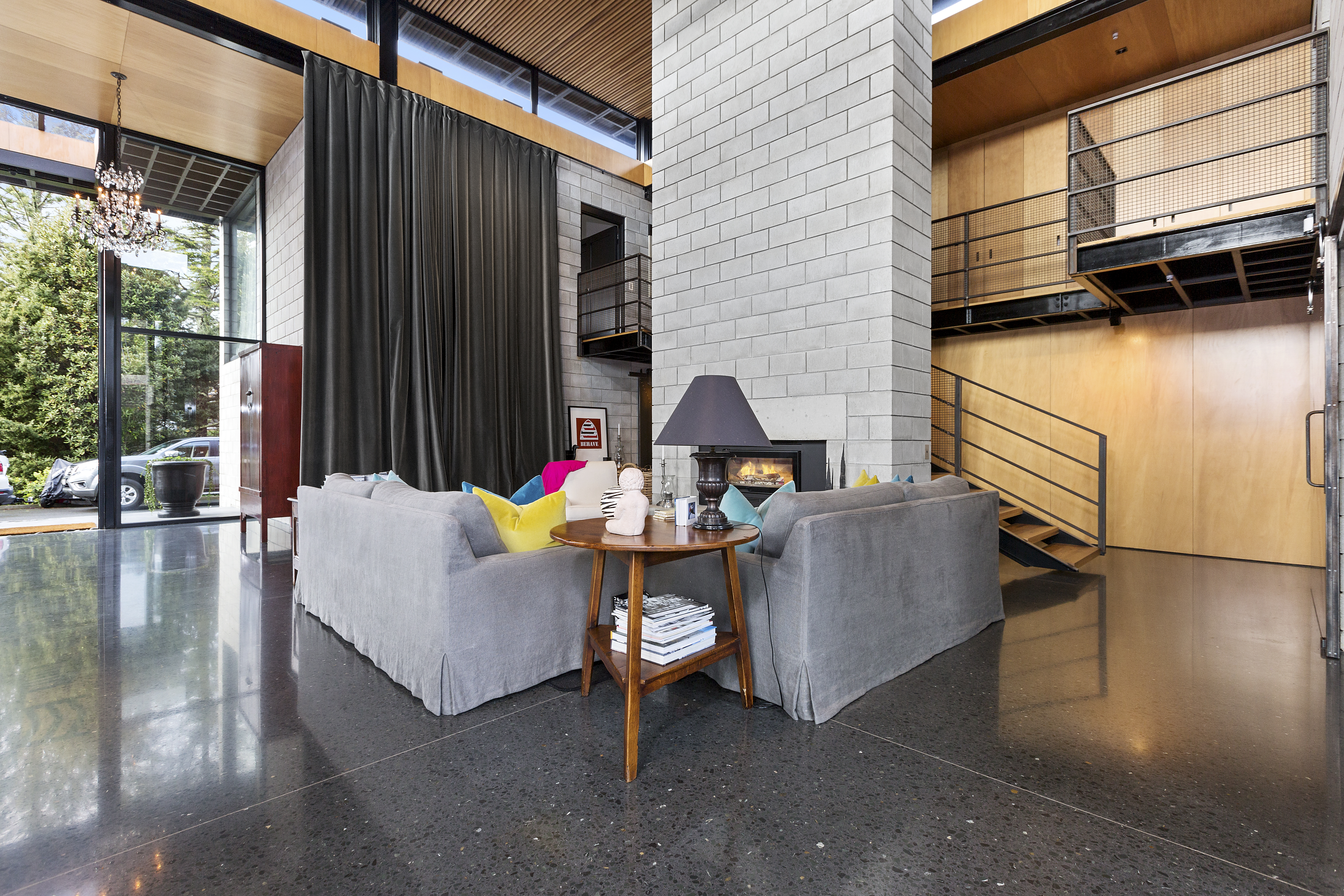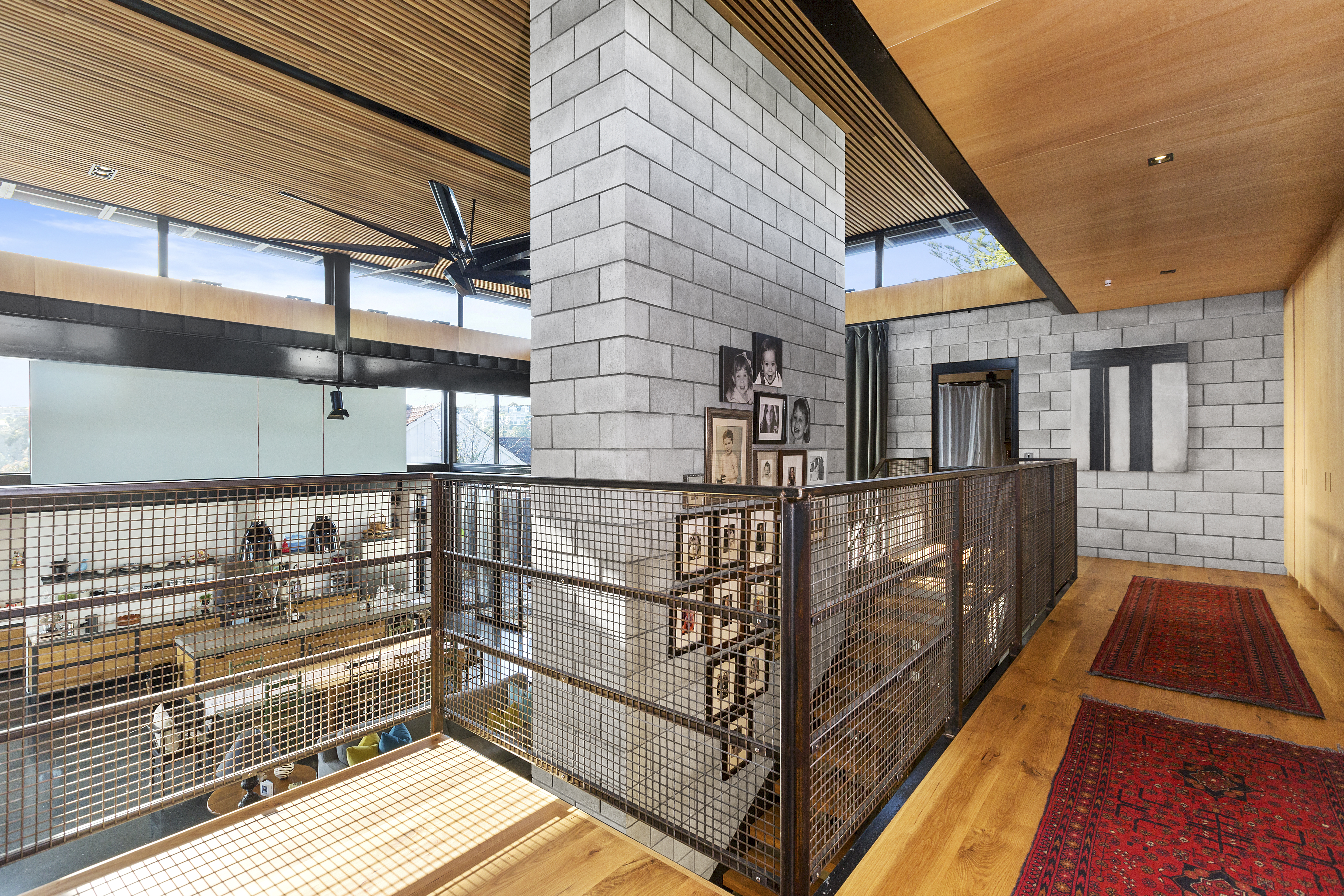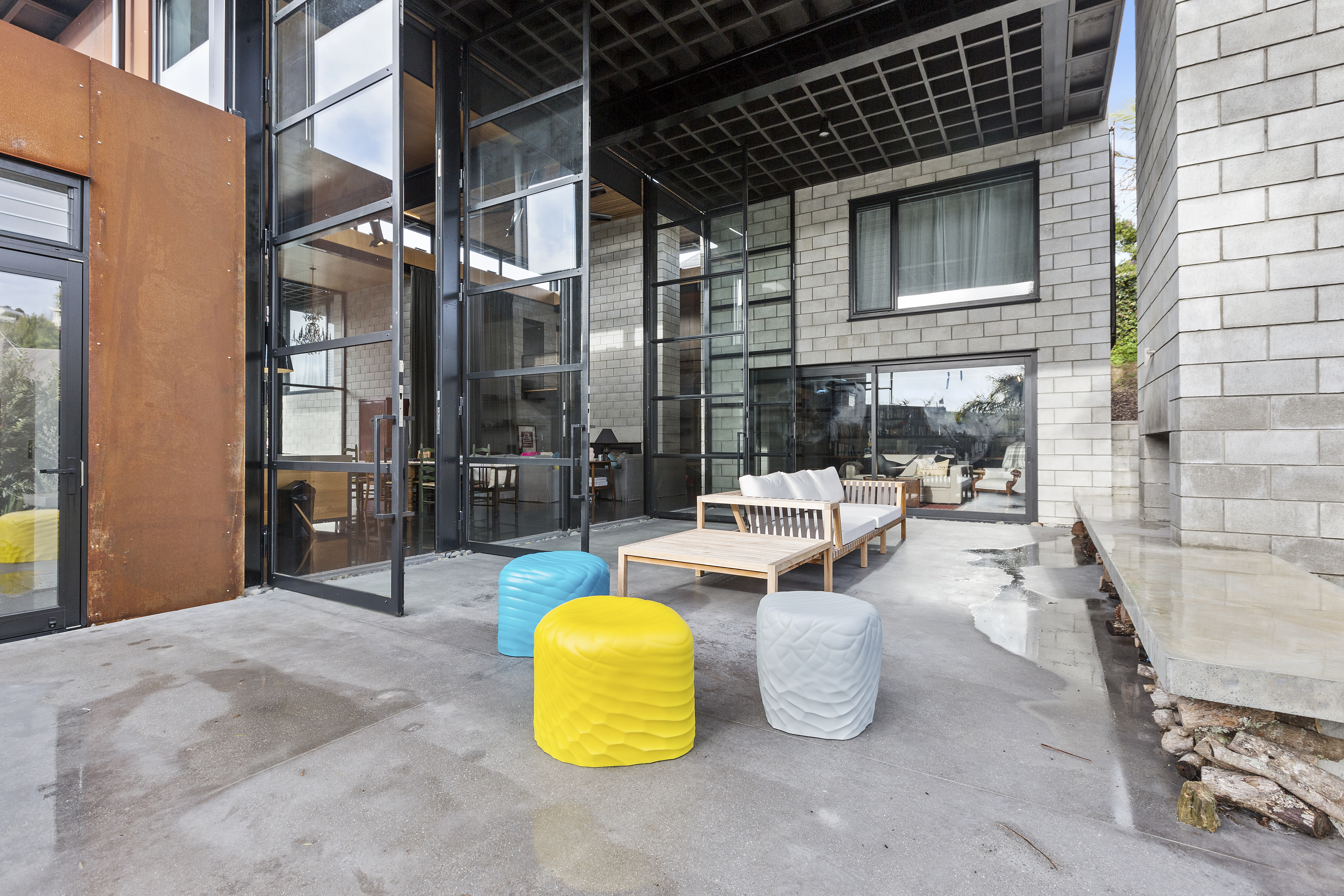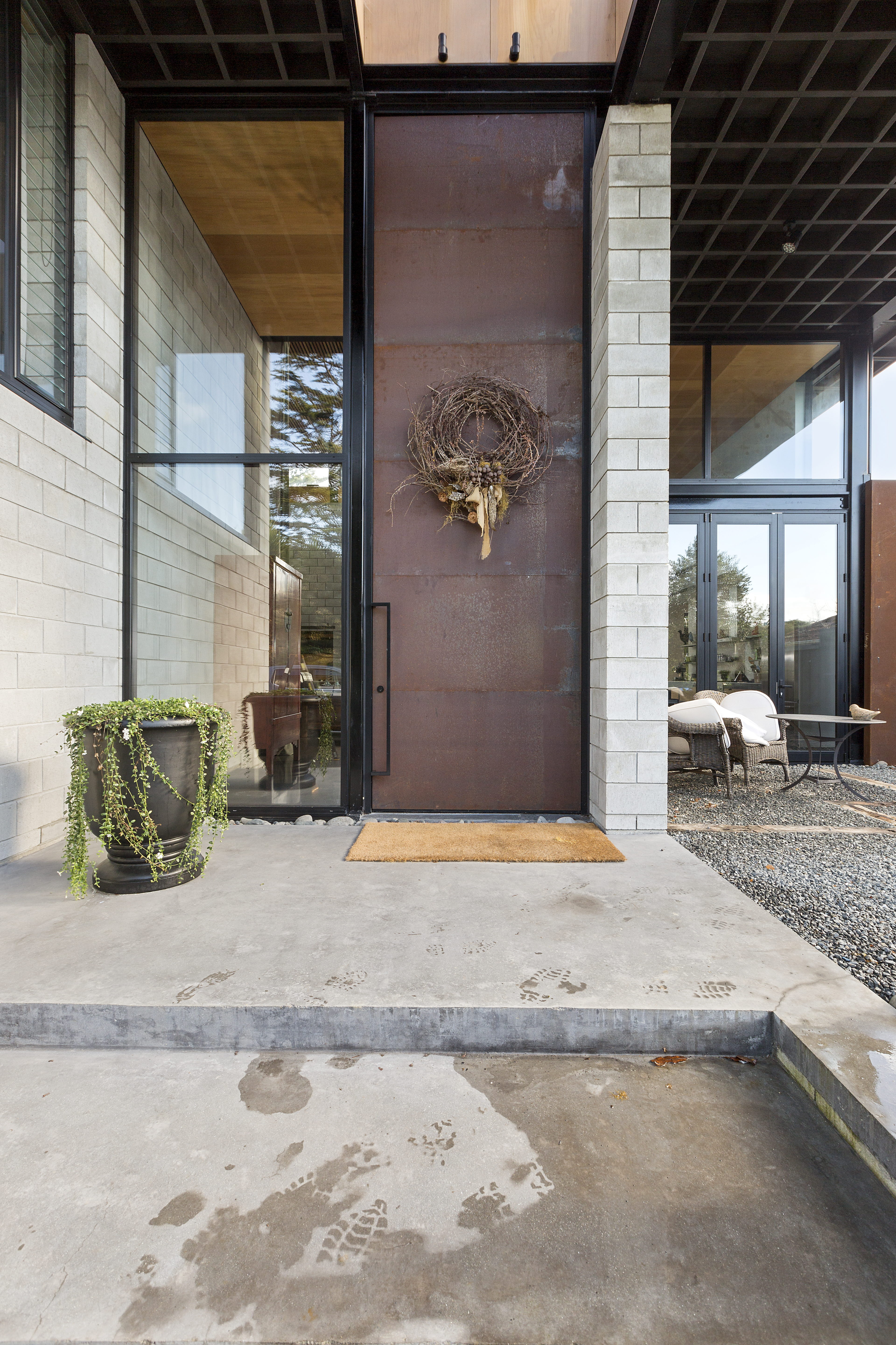 Entrance through the grand double-height steel-framed doors into the cavernous open-plan kitchen/dining/living space is dramatic. This effect is amped up by a full-drop velvet curtain which aids acoustics as do the cedar battened ceilings. Kauri ply linings and recycled wooden doors from the former State house on the site lend warmth and character.