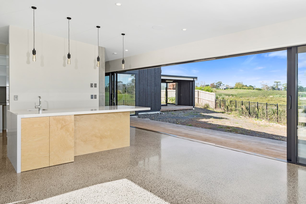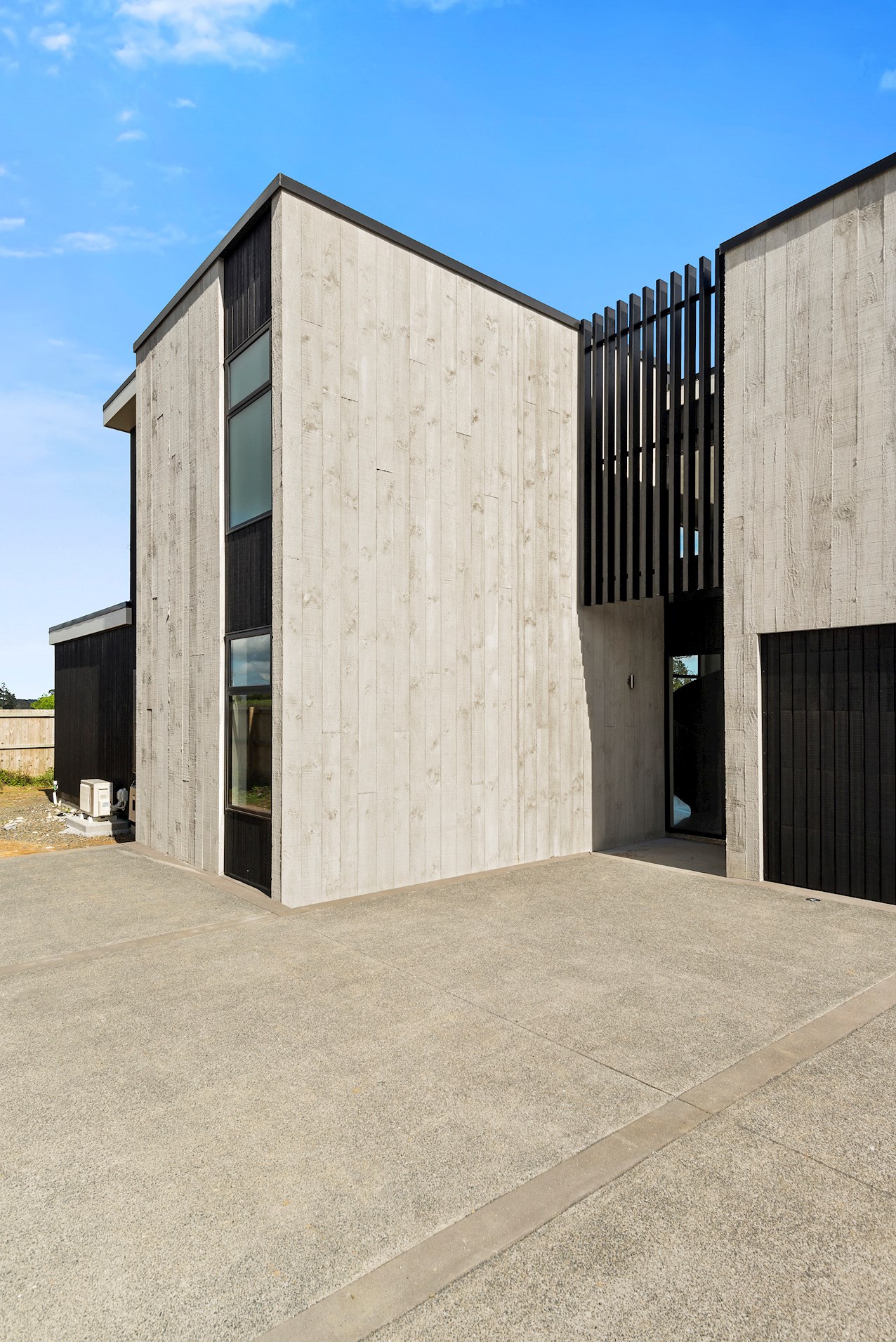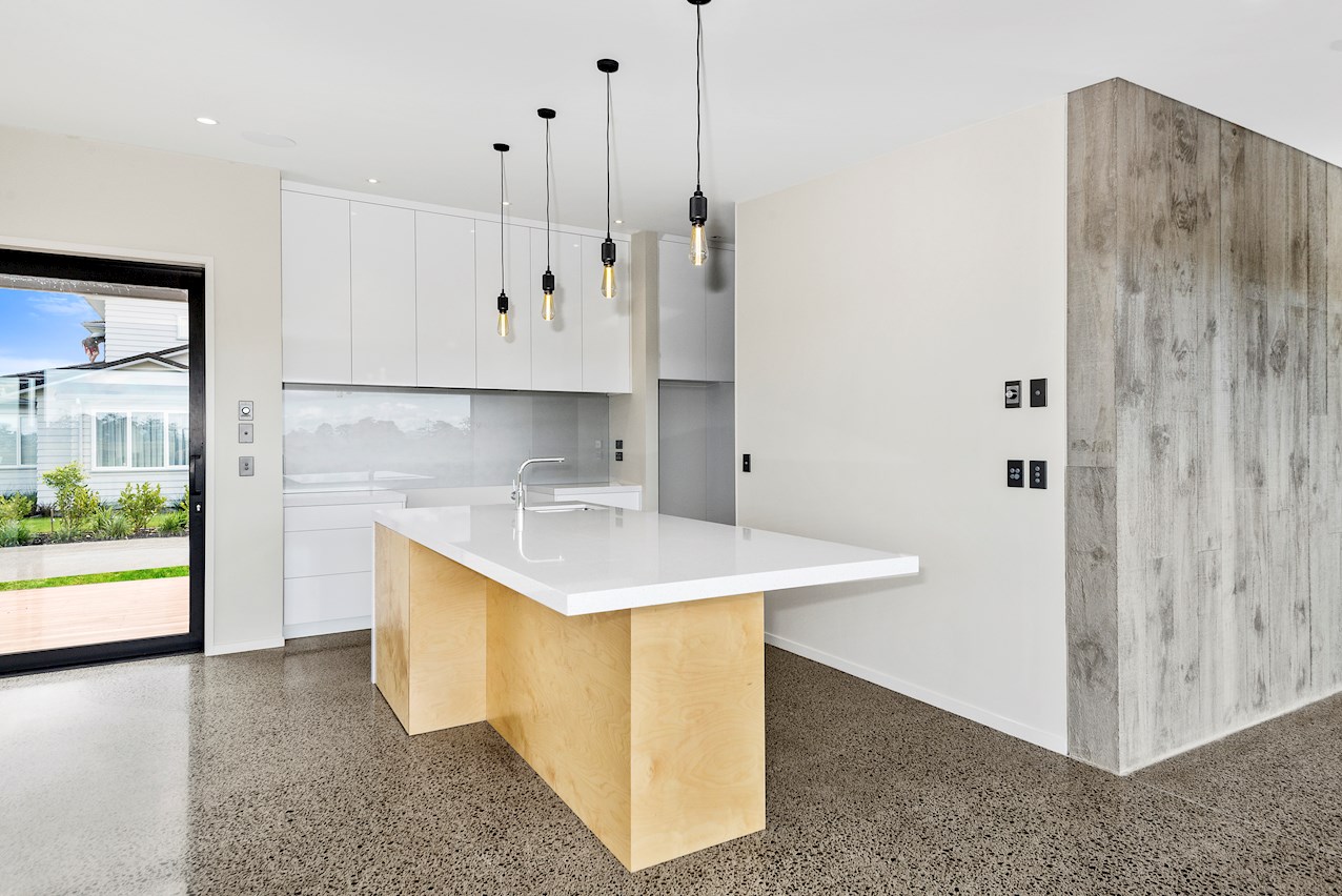Comprised of a set of strong inter-connecting volumes, this contemporary Karaka Lakes construction exudes quality, class and effortless cool. Natural concrete provides a grounding force inside and out. Timber elements add warmth and natural charm to otherwise minimalist interiors.