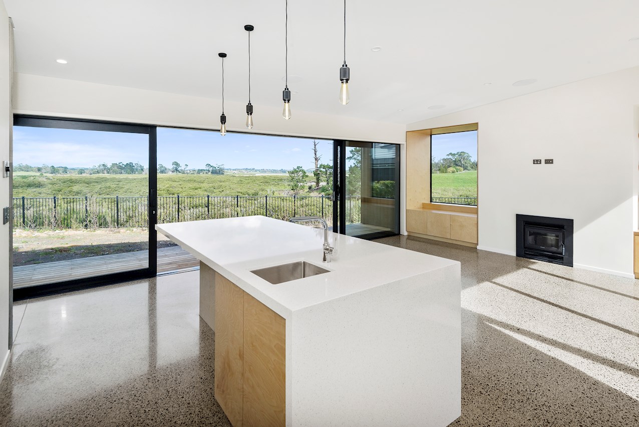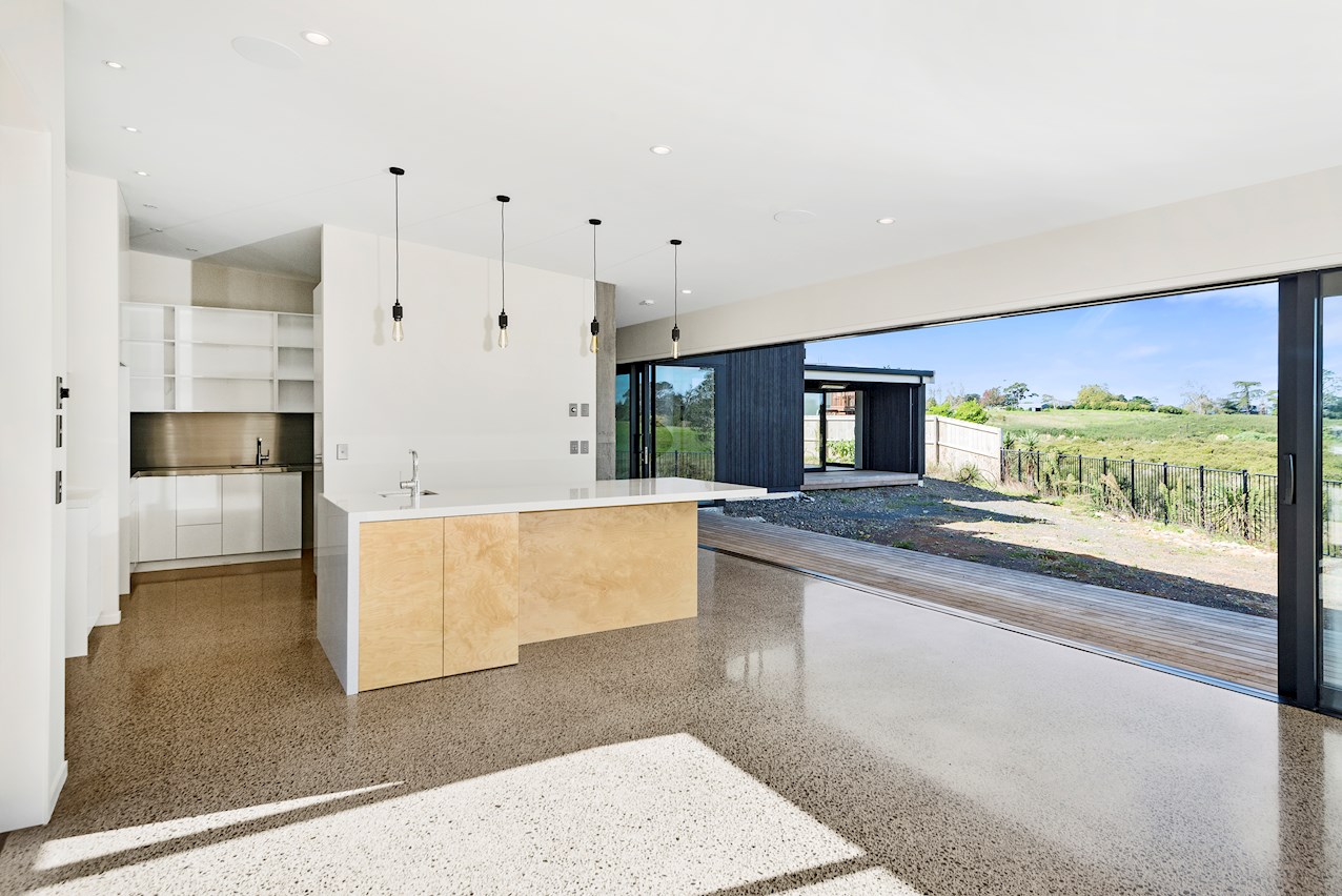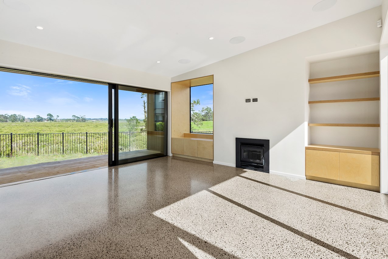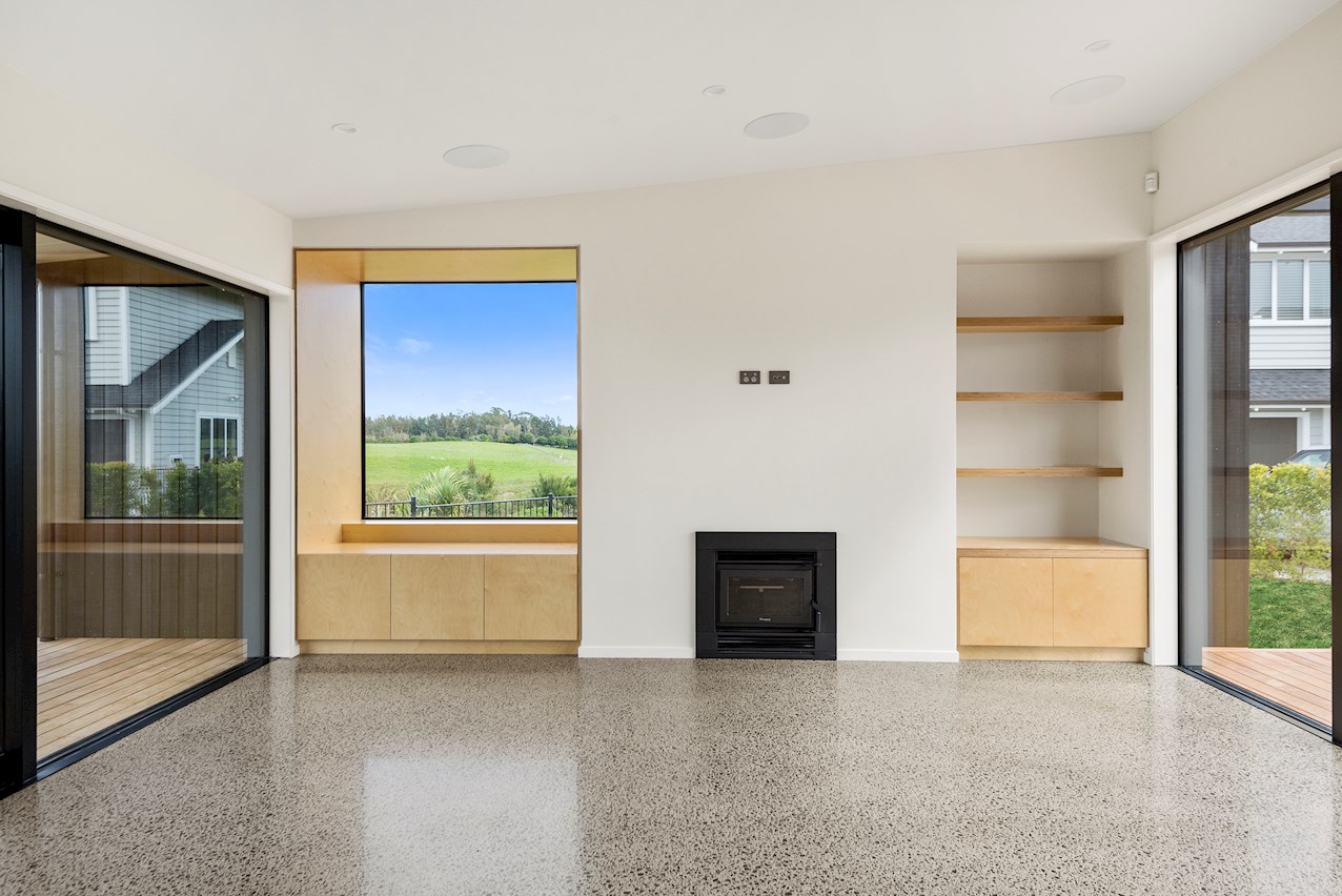 Polished concrete offers thermal mass for passive solar gain on the ground floor. Upstairs enjoys the added comfort of carpet in bedrooms, and sleek, stylish tiles in the bathrooms.