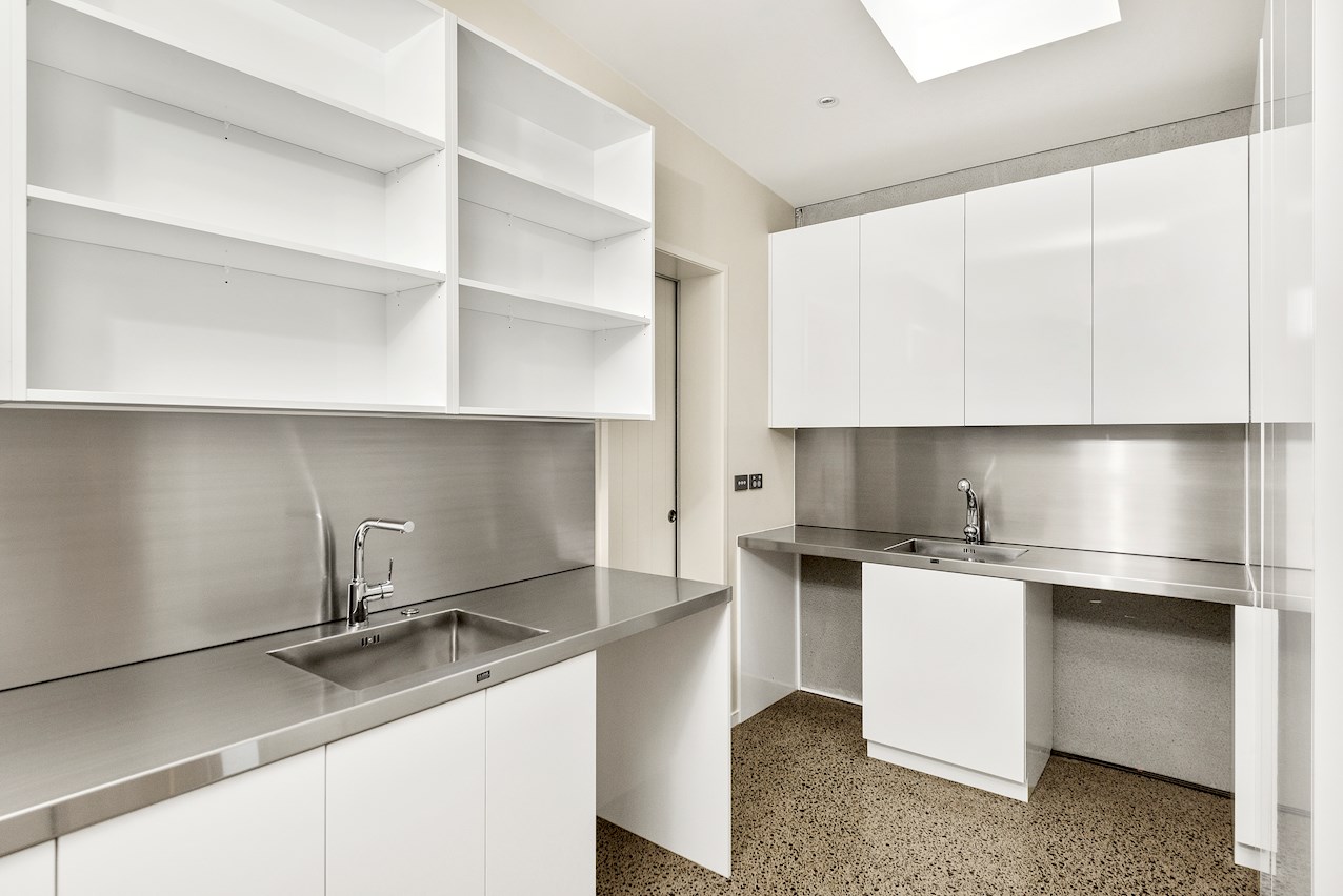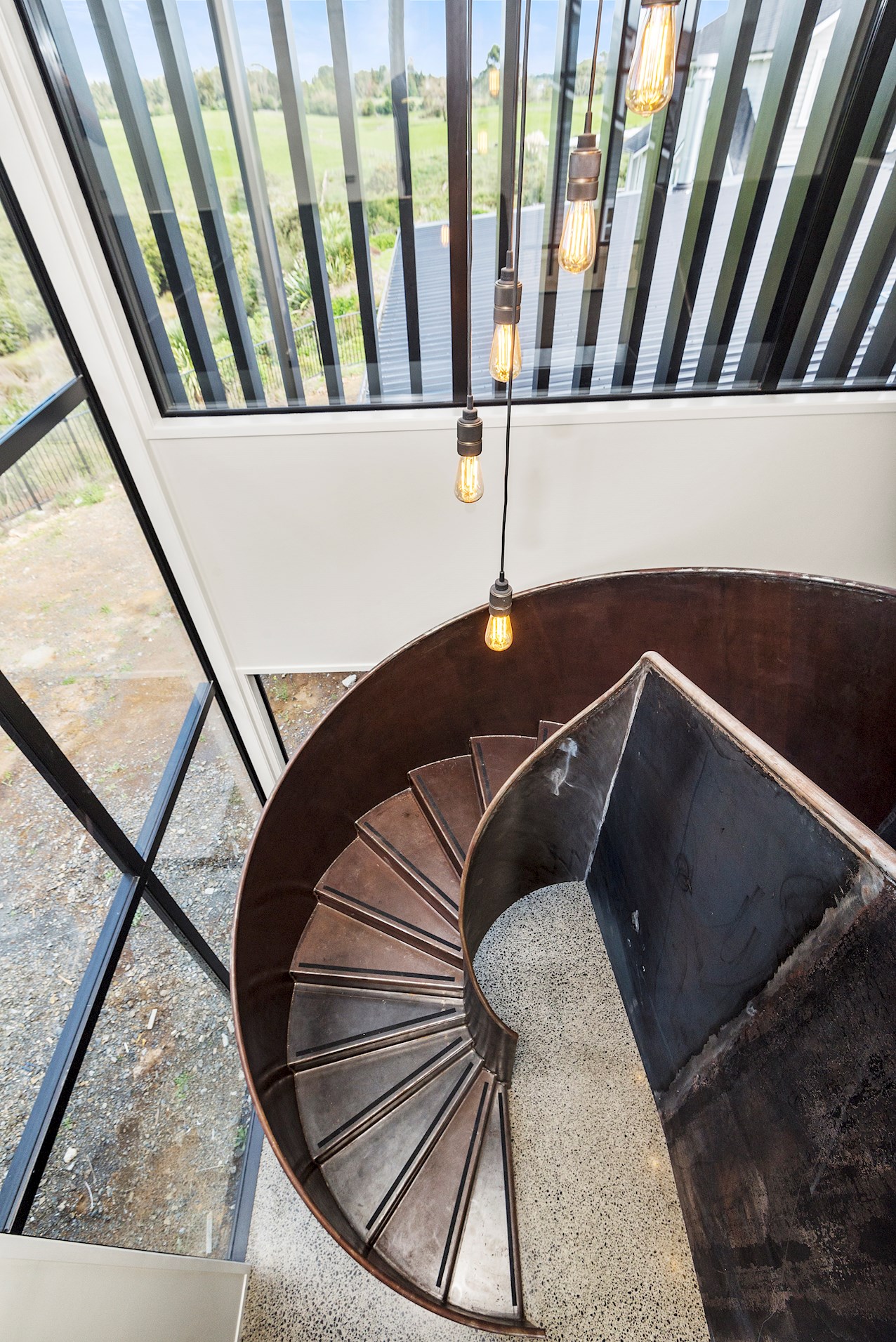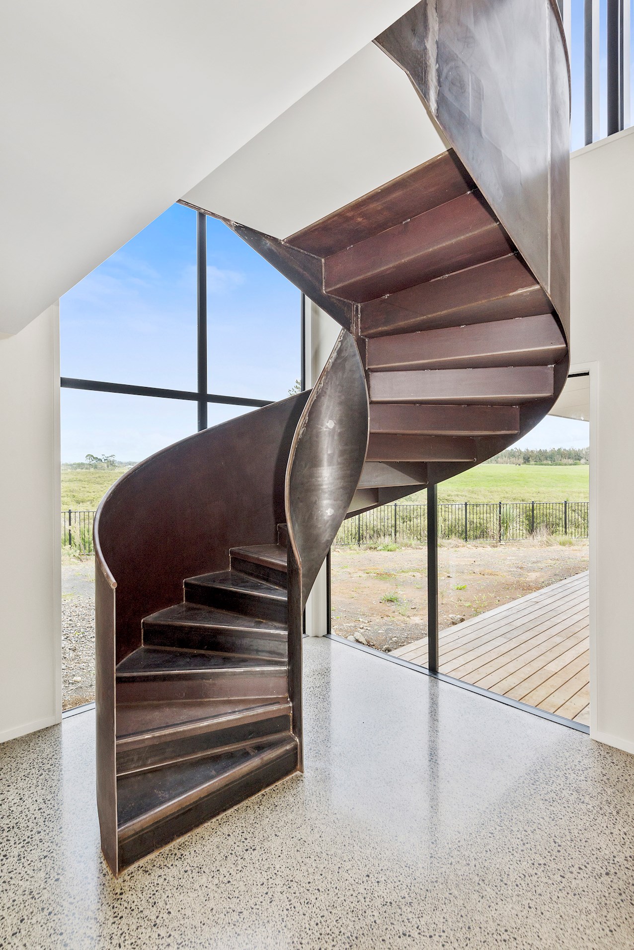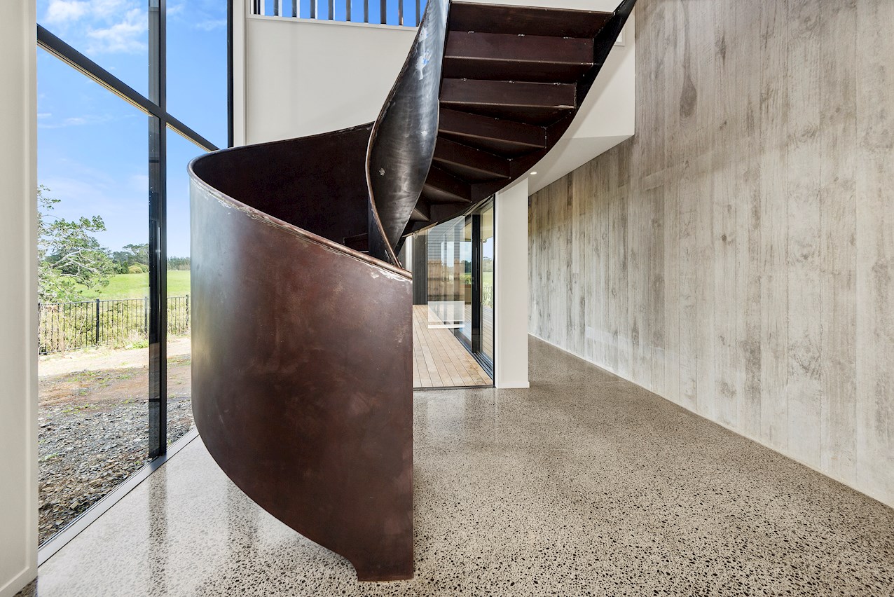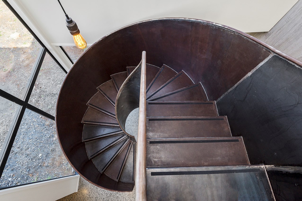 More than just a set of stairs, the stunning spiral staircase provides another twist. Corkscrewing elegantly from sweeping polished concrete floors, it makes for a sophisticated transition between levels.