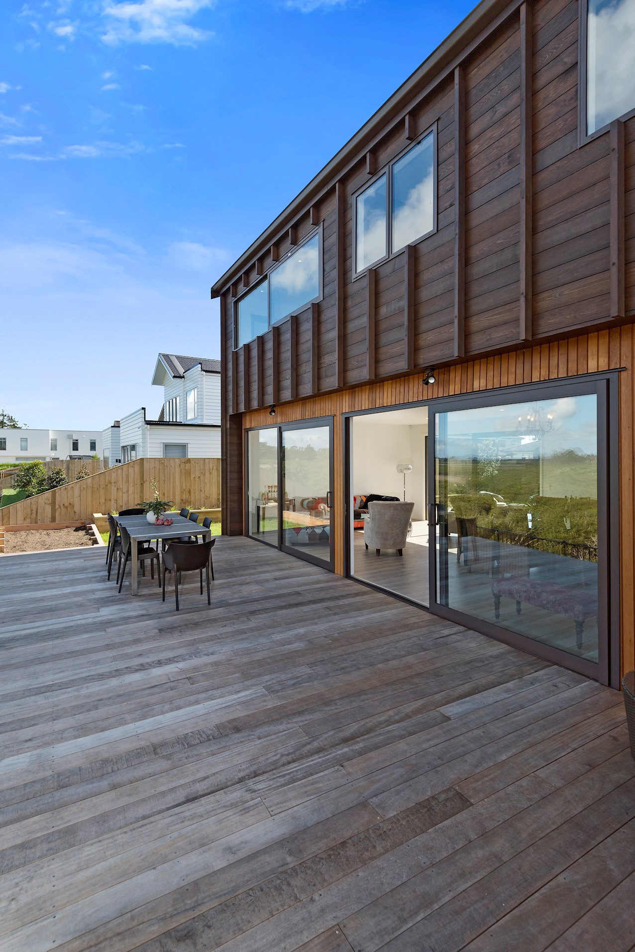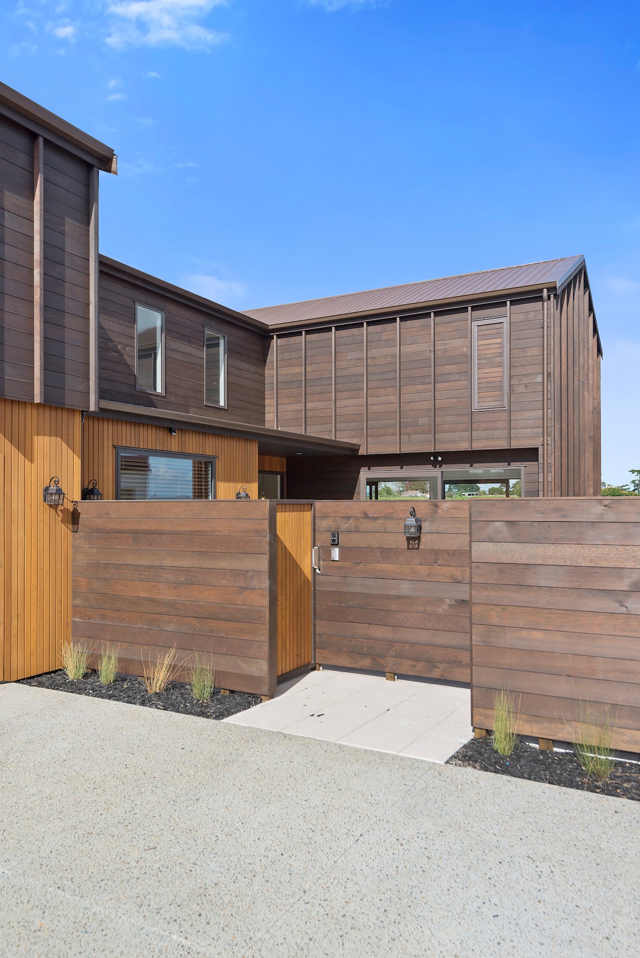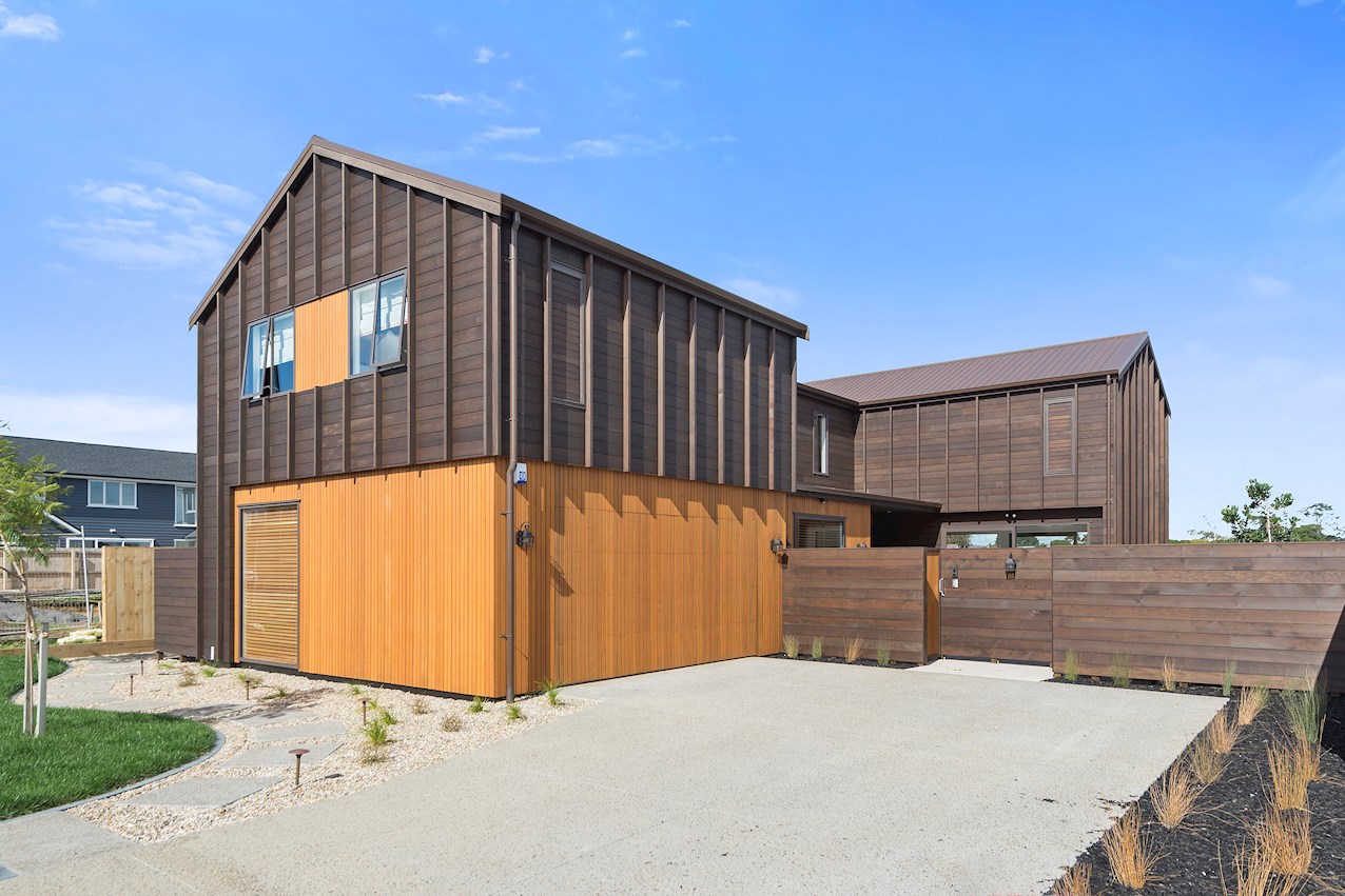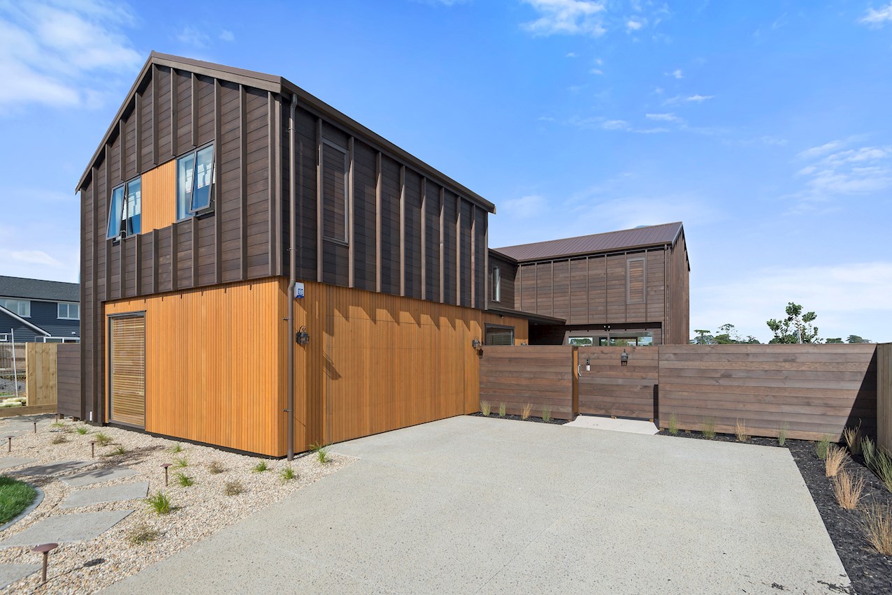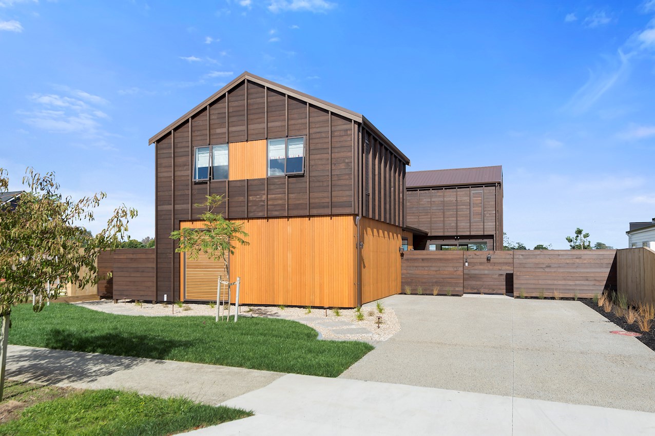 Encased in striking cedar, this Karaka Lakes home is in tune with the environment. Dark stained horizontal cladding covers the bulk of the building. The double garage and entry is expressed in golden hues – its wide door seamlessly integrated into the whole.