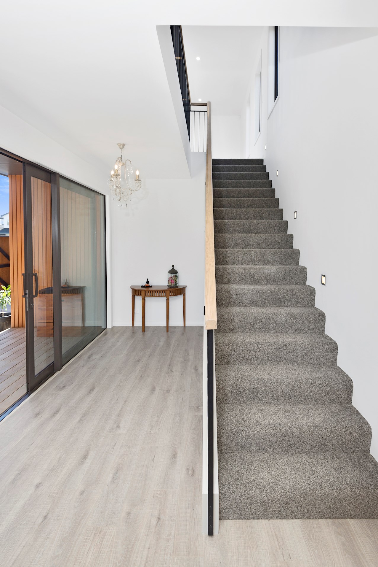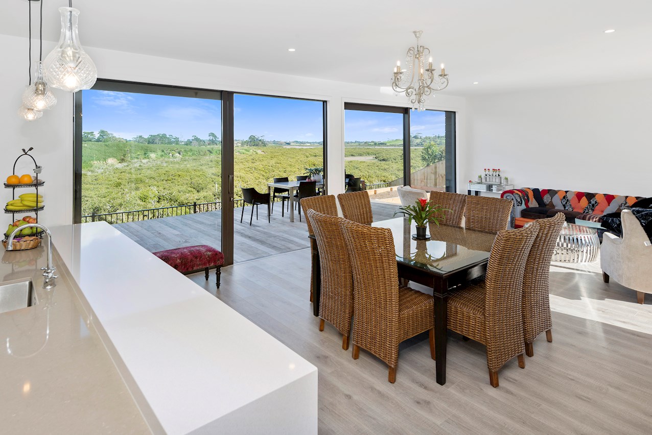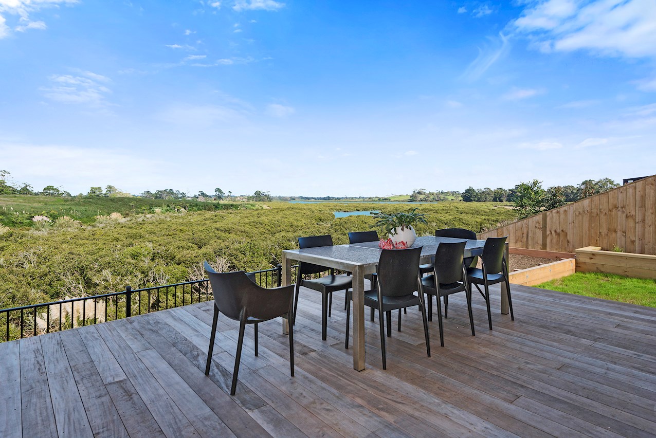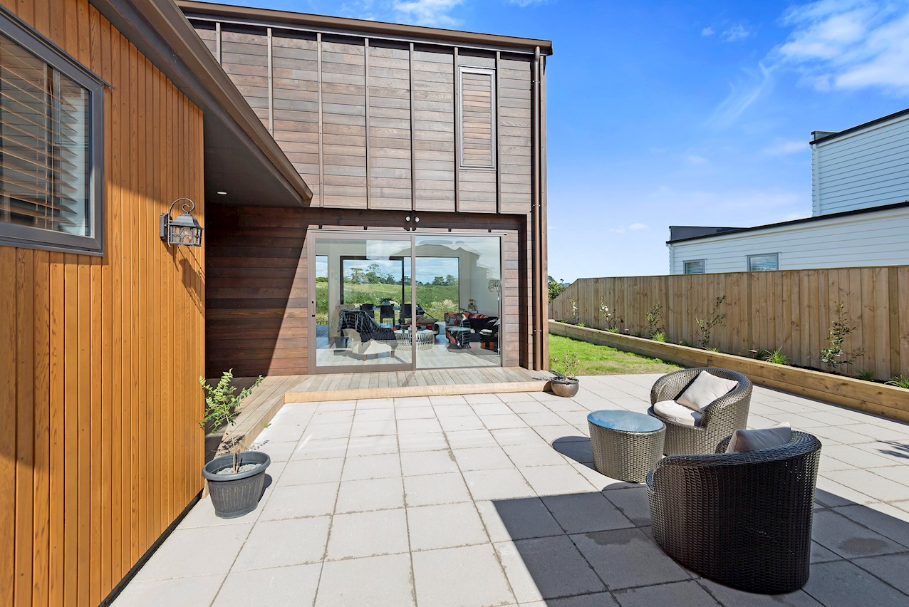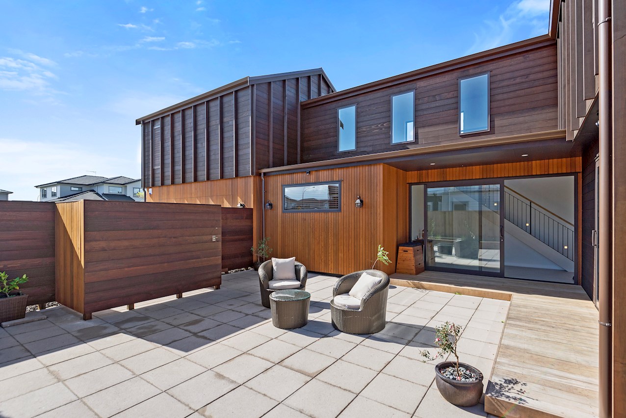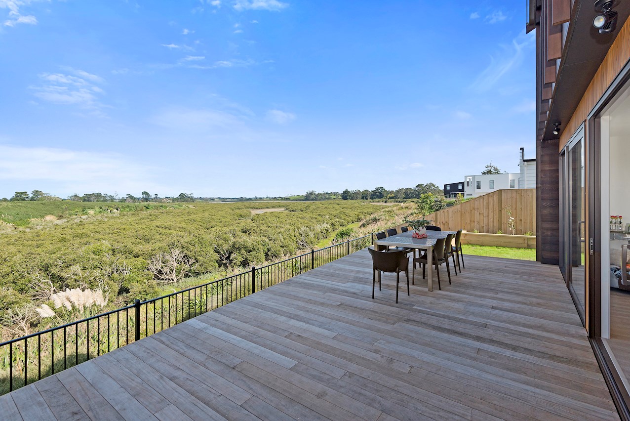 Encased in striking cedar, this Karaka Lakes home is in tune with the environment. Dark stained horizontal cladding covers the bulk of the building. The double garage and entry is expressed in golden hues – its wide door seamlessly integrated into the whole.