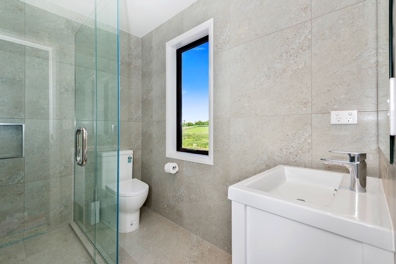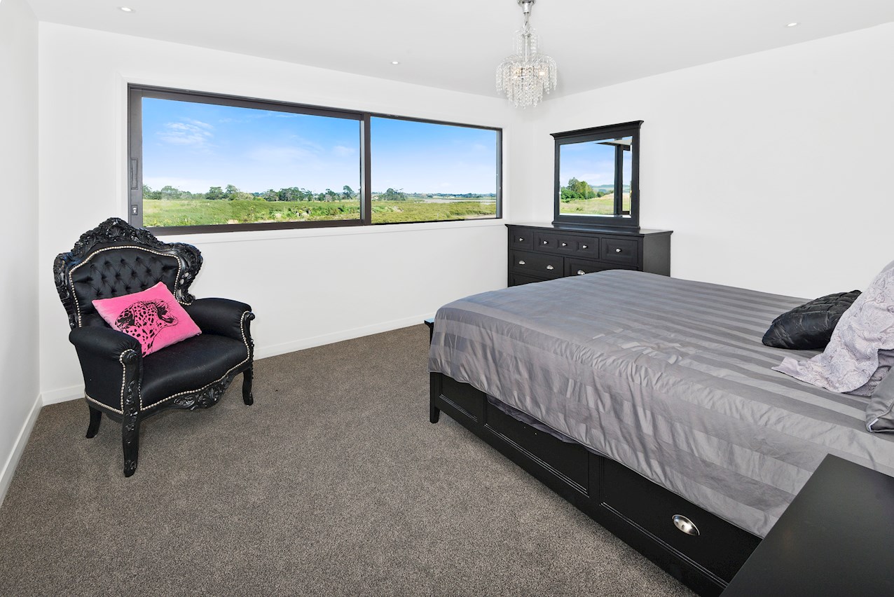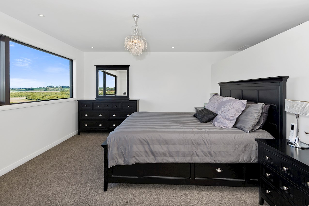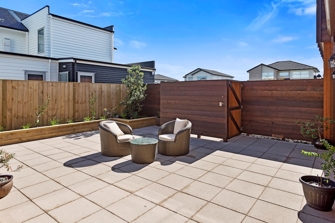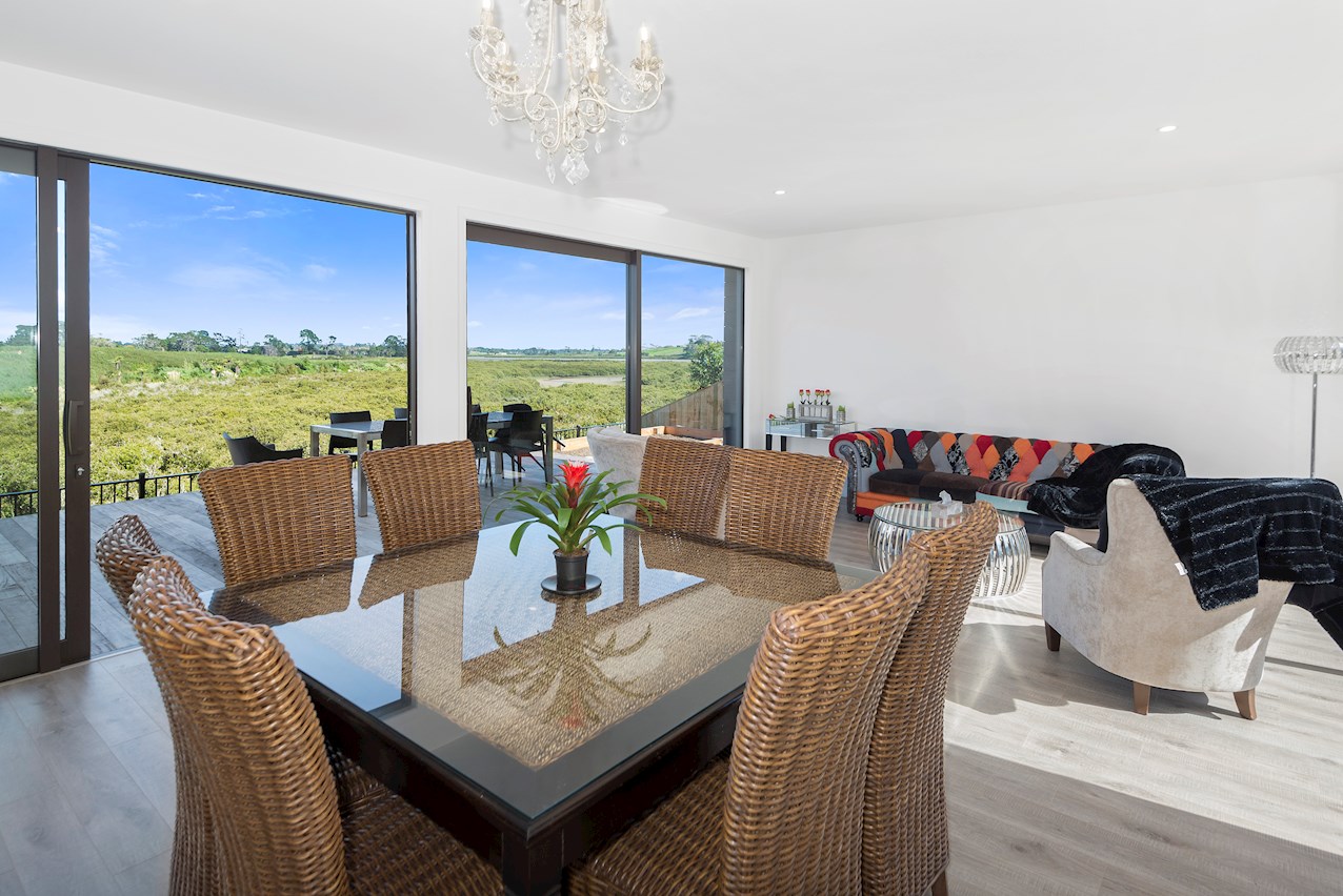 Encased in striking cedar, this Karaka Lakes home is in tune with the environment. Dark stained horizontal cladding covers the bulk of the building. The double garage and entry is expressed in golden hues – its wide door seamlessly integrated into the whole.