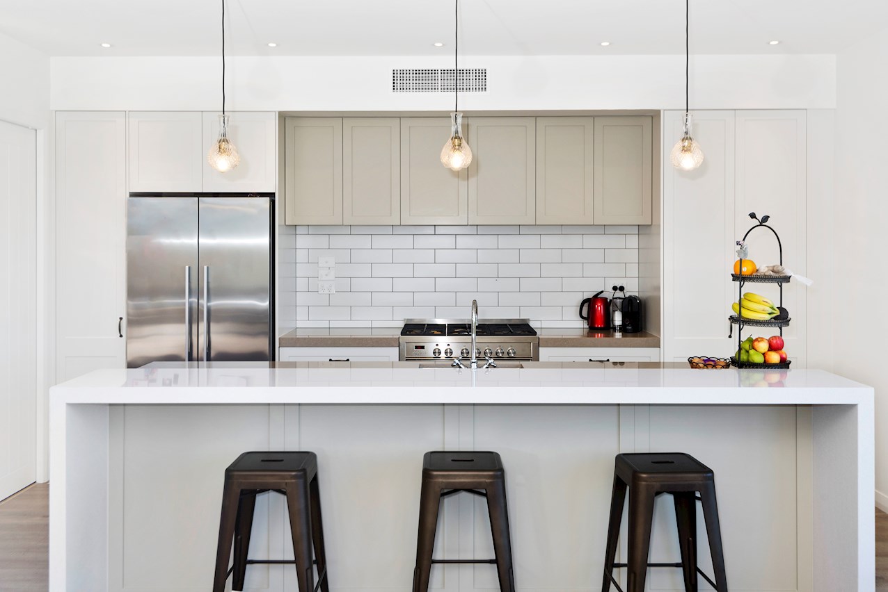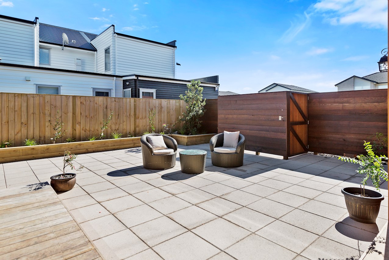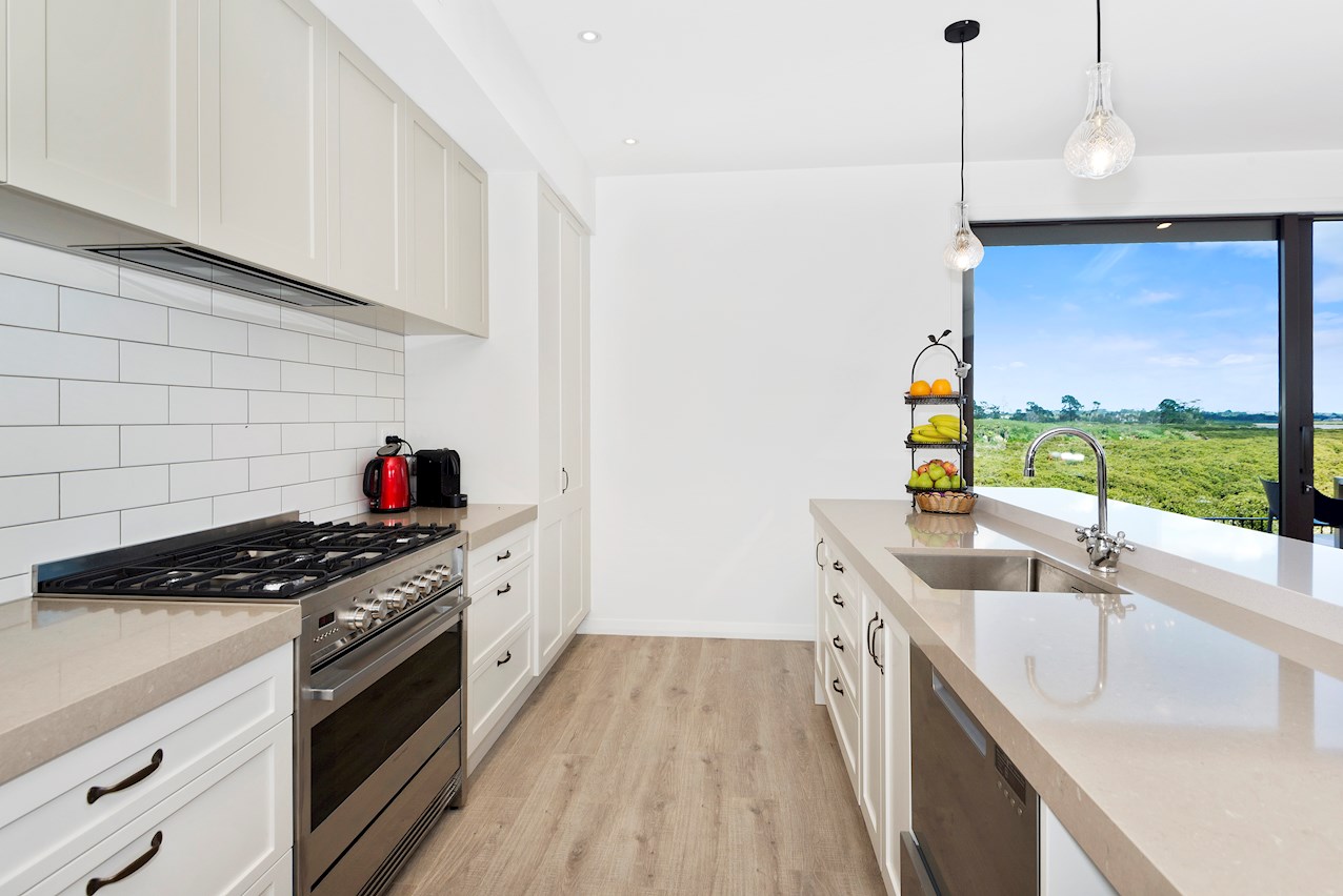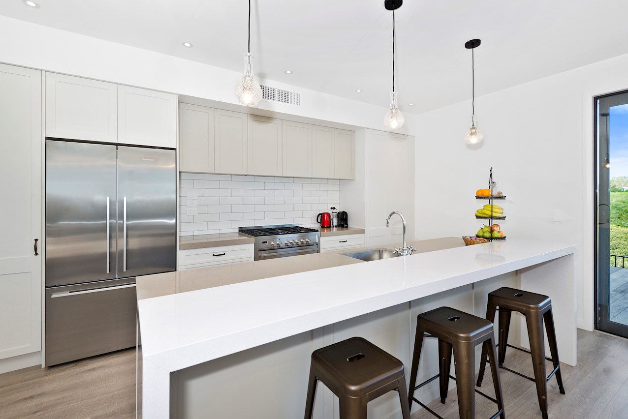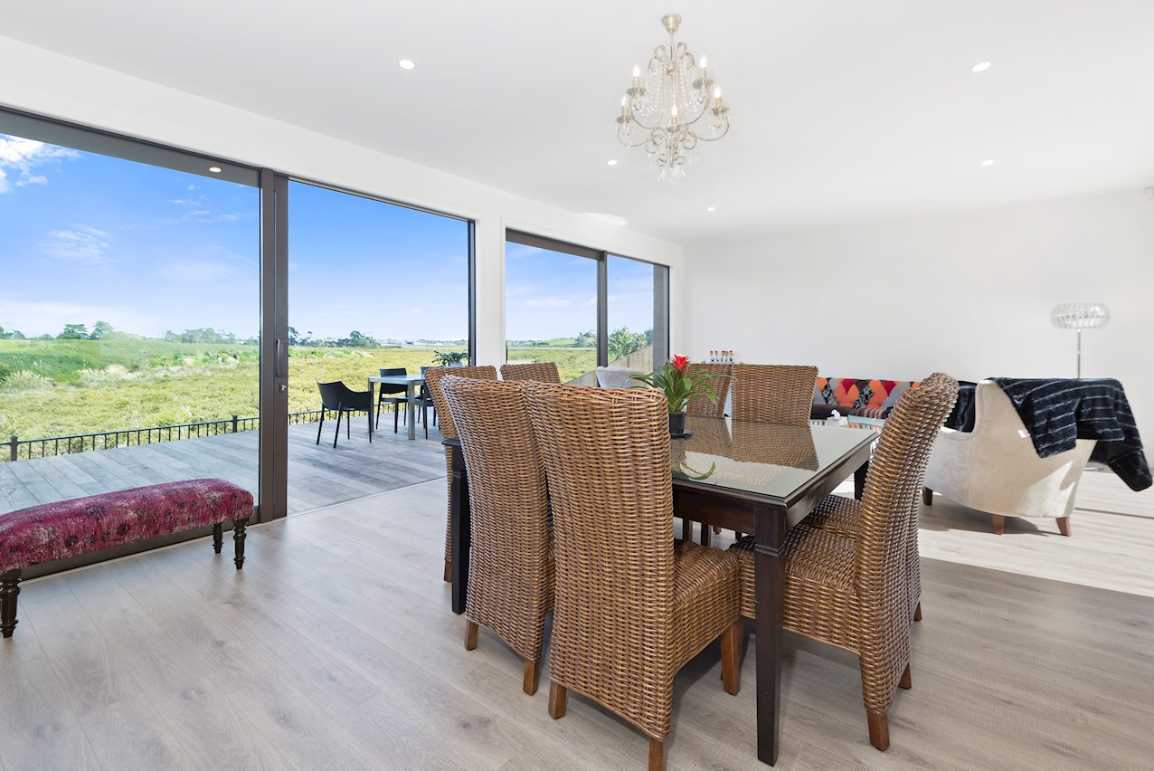 A pleasant departure from the dark facade, the interior palette is light and bright. A spacious 295sqm floor plan serves up four bedrooms, three bathrooms and three living spaces. Ideal for entertaining, the open-plan domain flows from kitchen to dining to outdoors in one fluid movement. A huge deck spans the length of the building, gazing over endless greenery with glimpses of water. Back inside, the sitting area is open to views to the south and a sun-soaked courtyard to the north. Extensive fencing makes for a lovely private spot for entertaining.