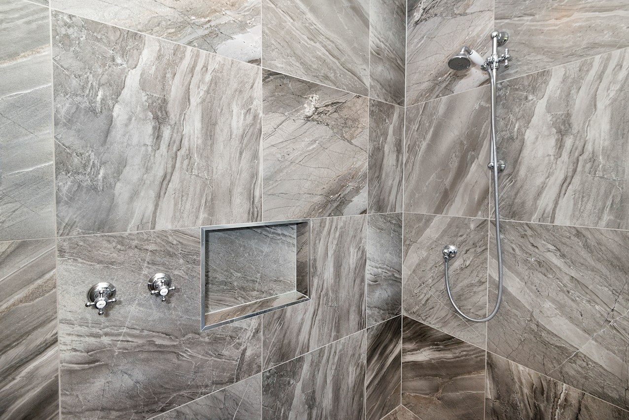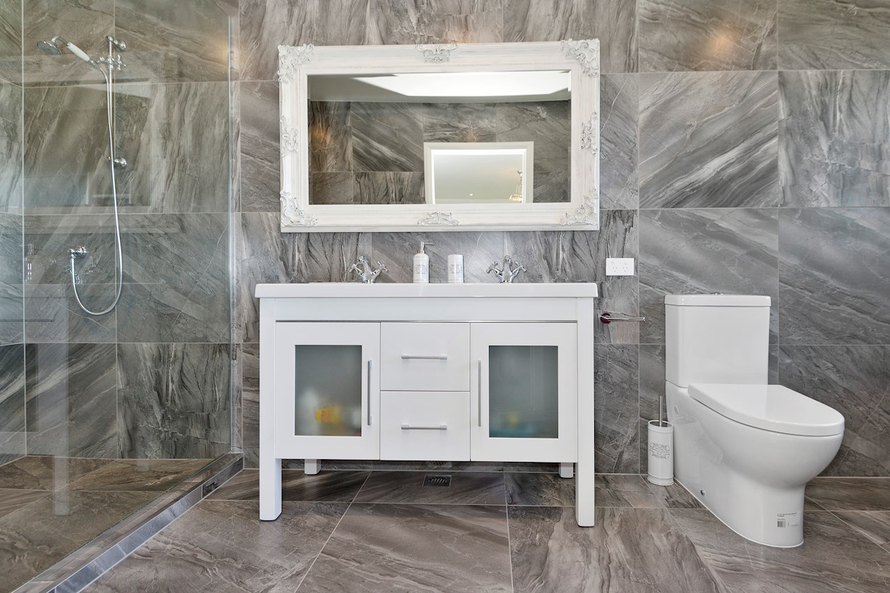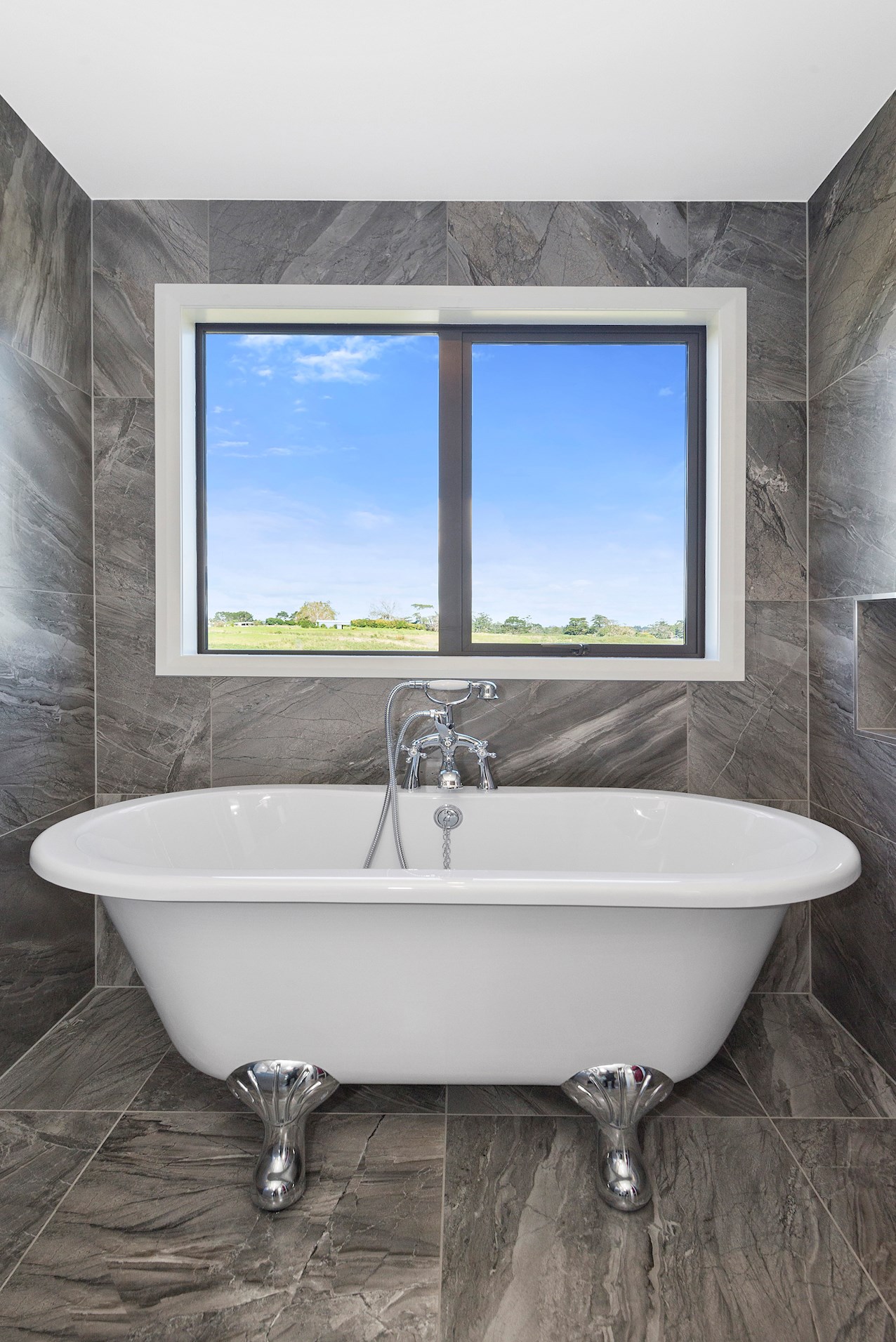 Chandeliers add a touch of class throughout this well-appointed home. Three bathrooms include a stunning silver-and-white affair with traditional clawfoot bathtub, freestanding double vanity and ornate wall-hung mirror. A reflection of fine tastes.