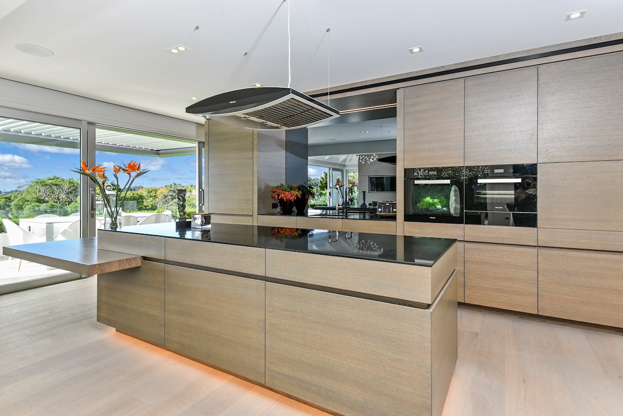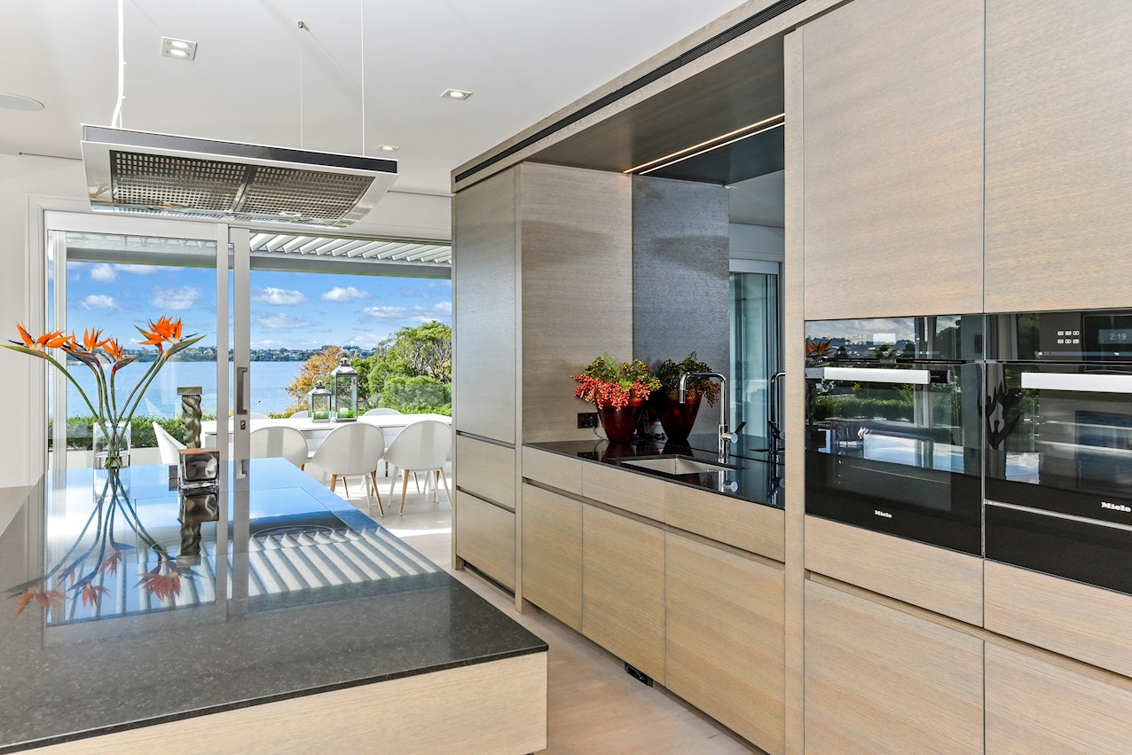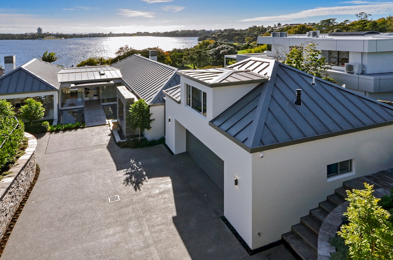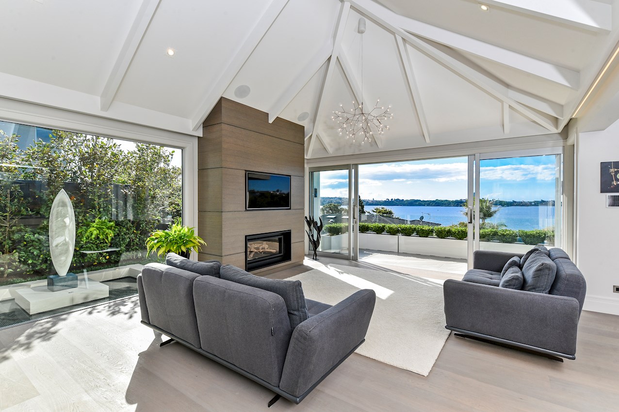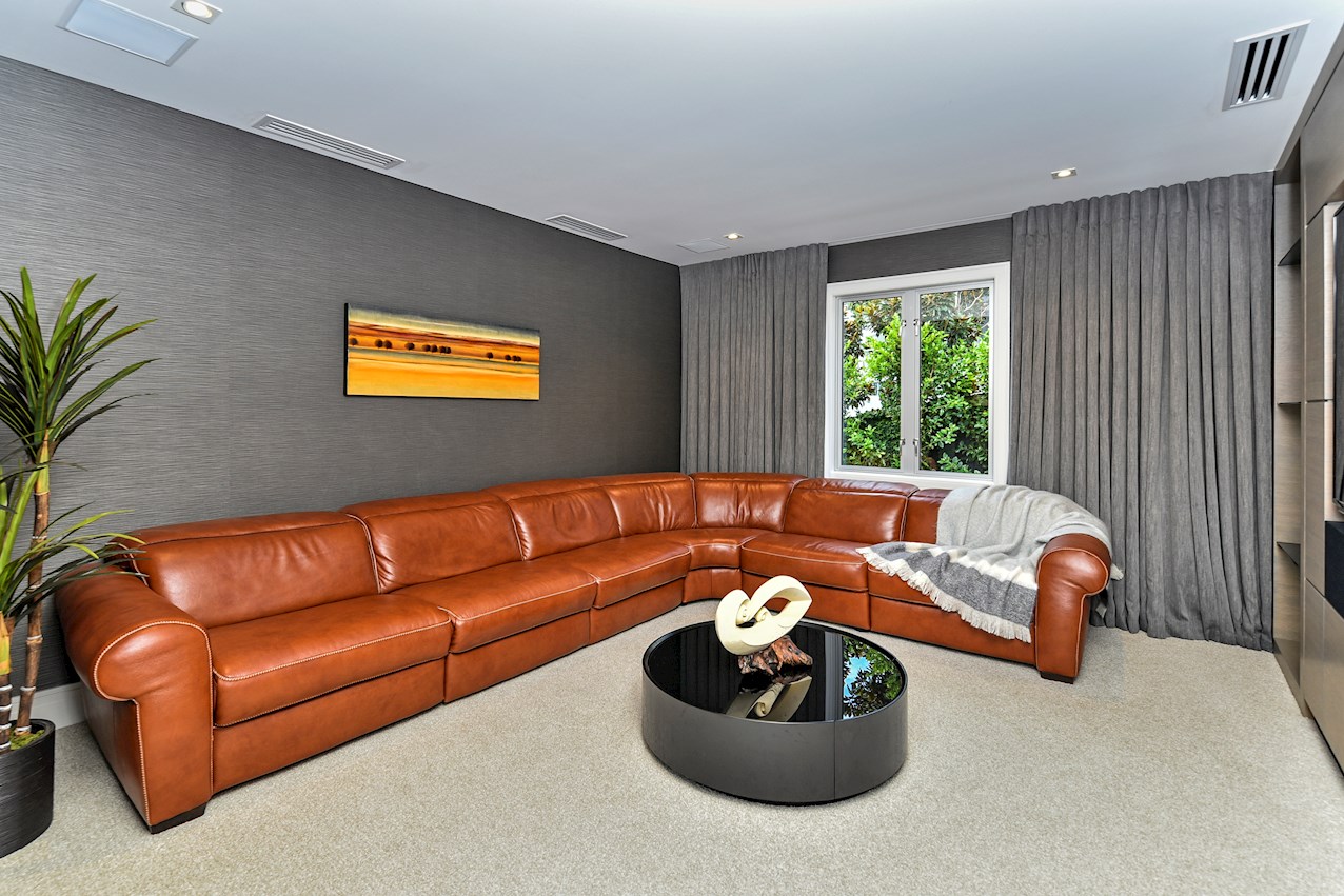 Oak flooring and feature ceilings add interest and enhance the interior spaces. Views of Lake Pupuke and the adjacent park are captured thanks to thoughtful planning. A home theatre provides a cinematic escape.