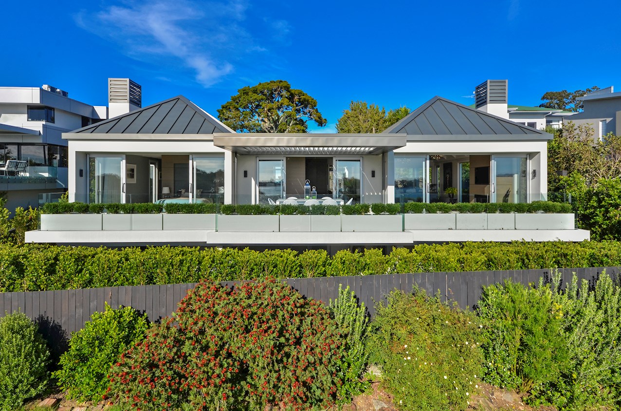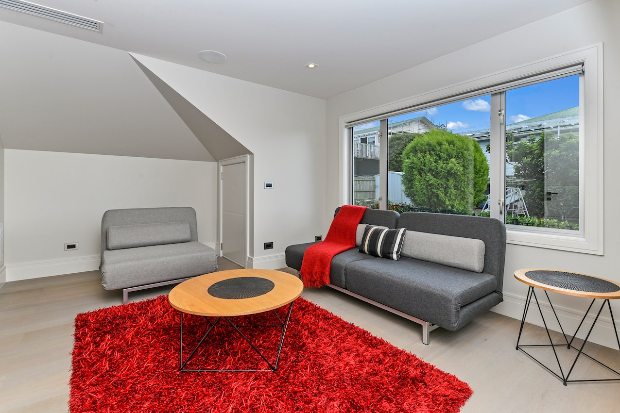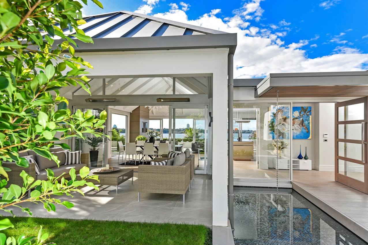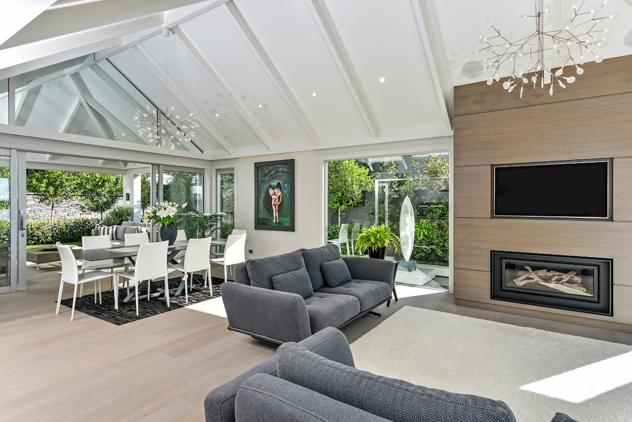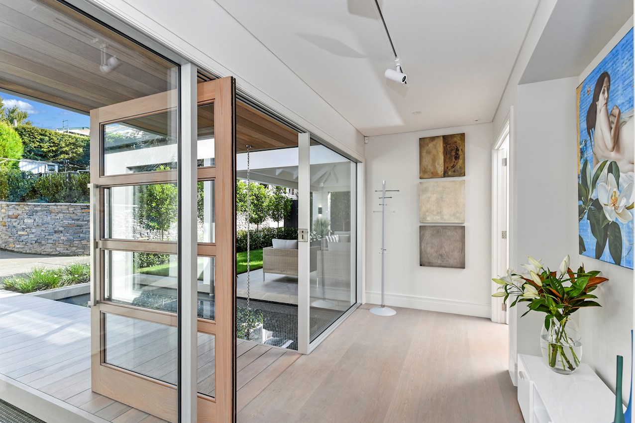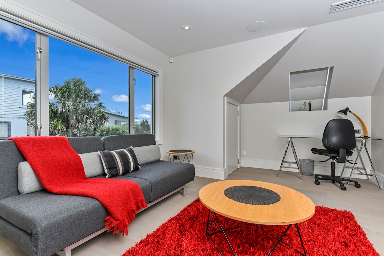 Oak flooring and feature ceilings add interest and enhance the interior spaces. Views of Lake Pupuke and the adjacent park are captured thanks to thoughtful planning. A home theatre provides a cinematic escape.