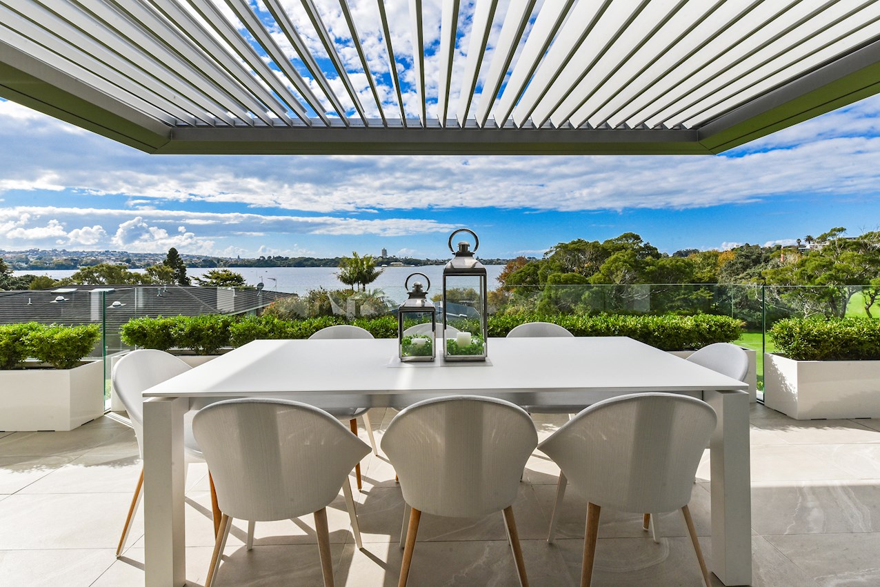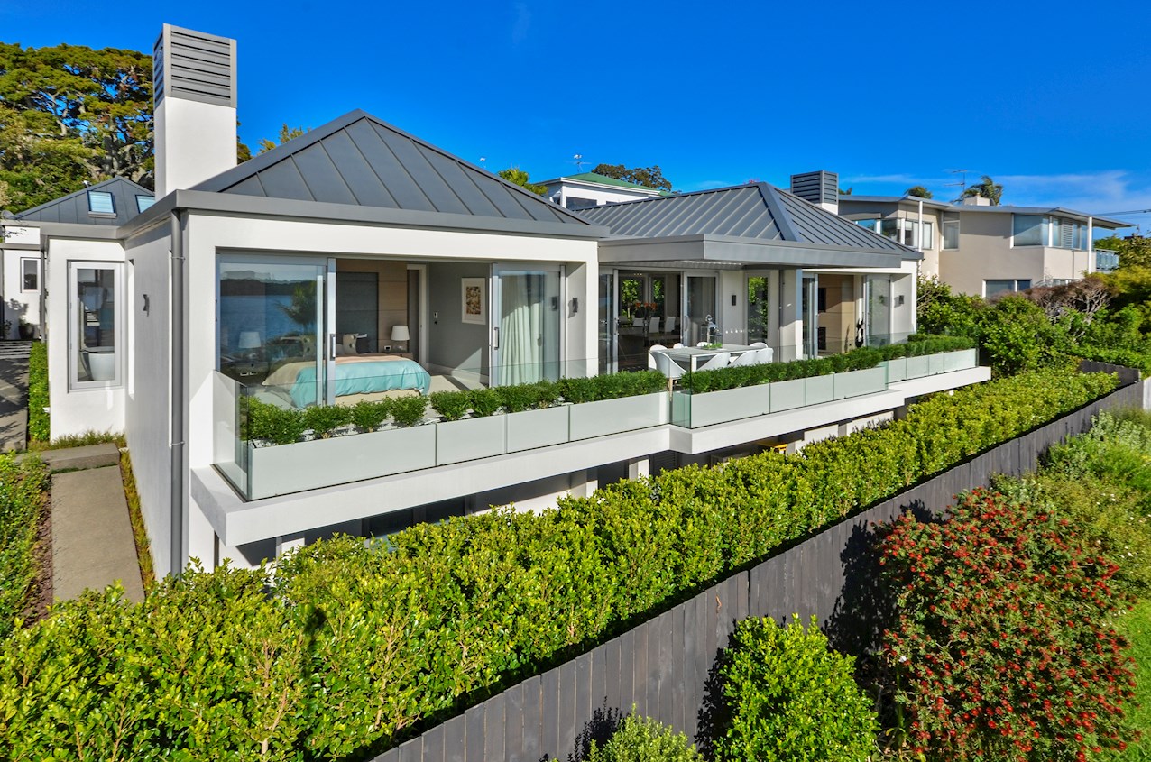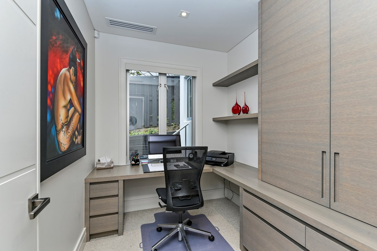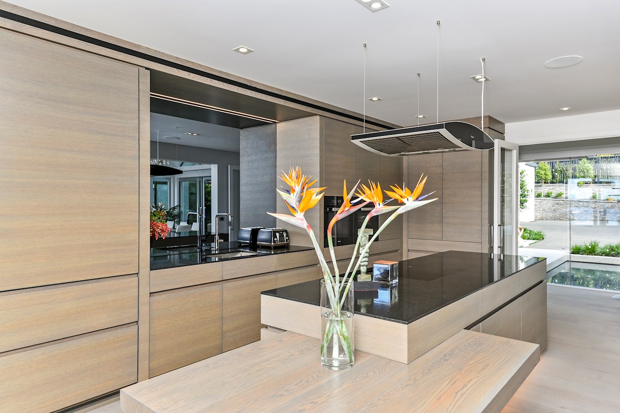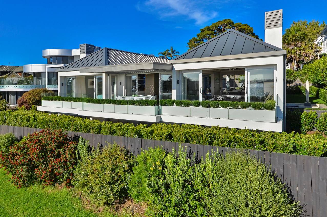 Oak flooring and feature ceilings add interest and enhance the interior spaces. Views of Lake Pupuke and the adjacent park are captured thanks to thoughtful planning. A home theatre provides a cinematic escape.