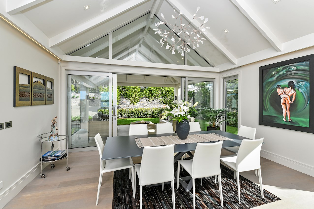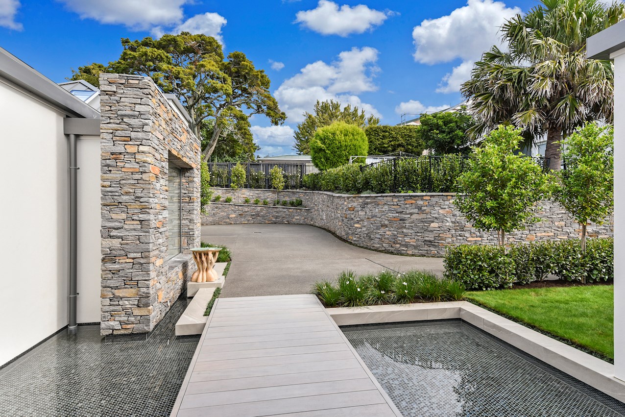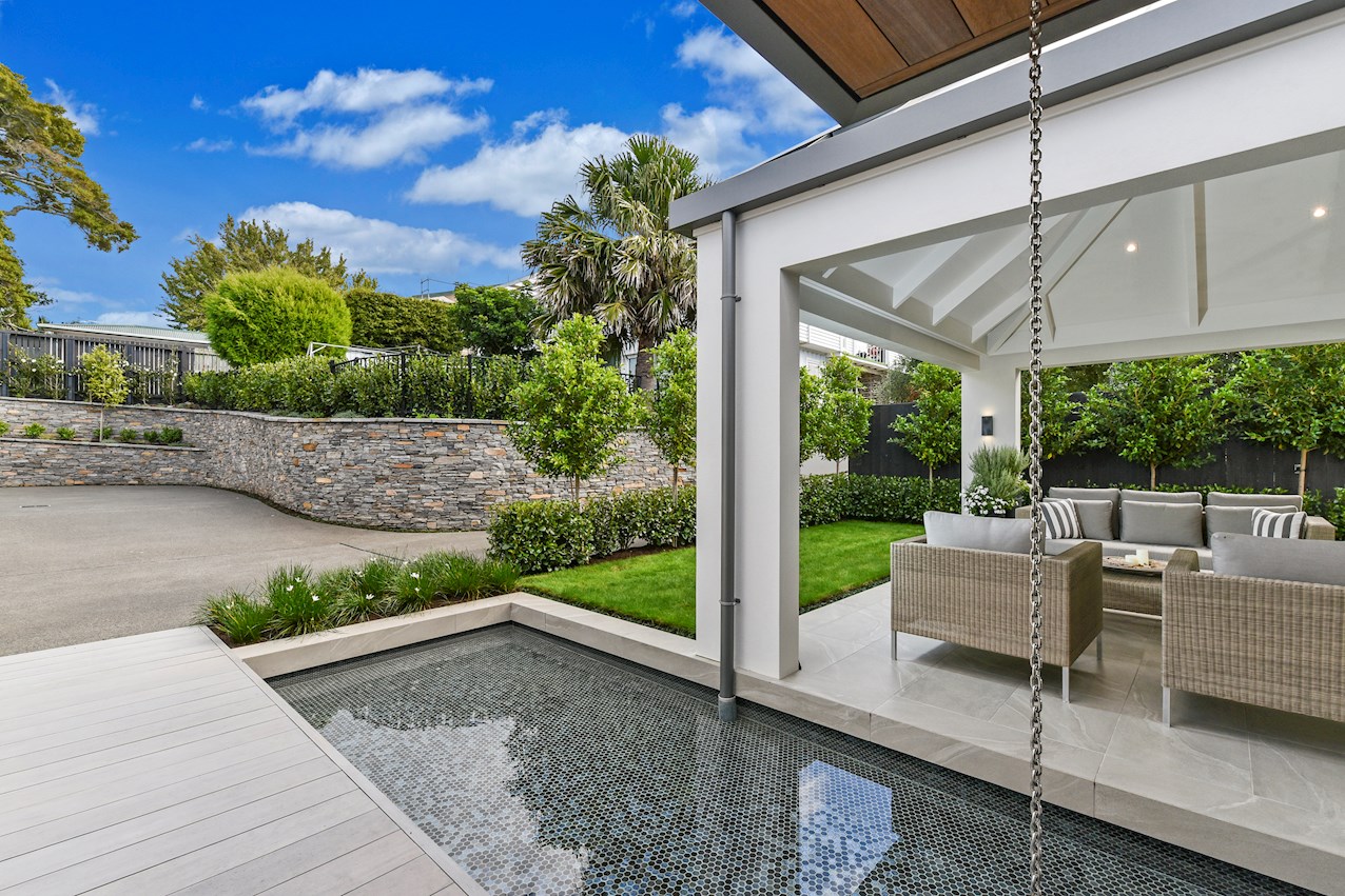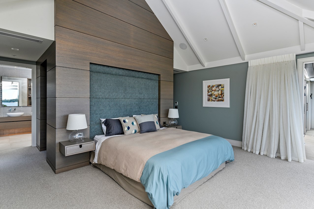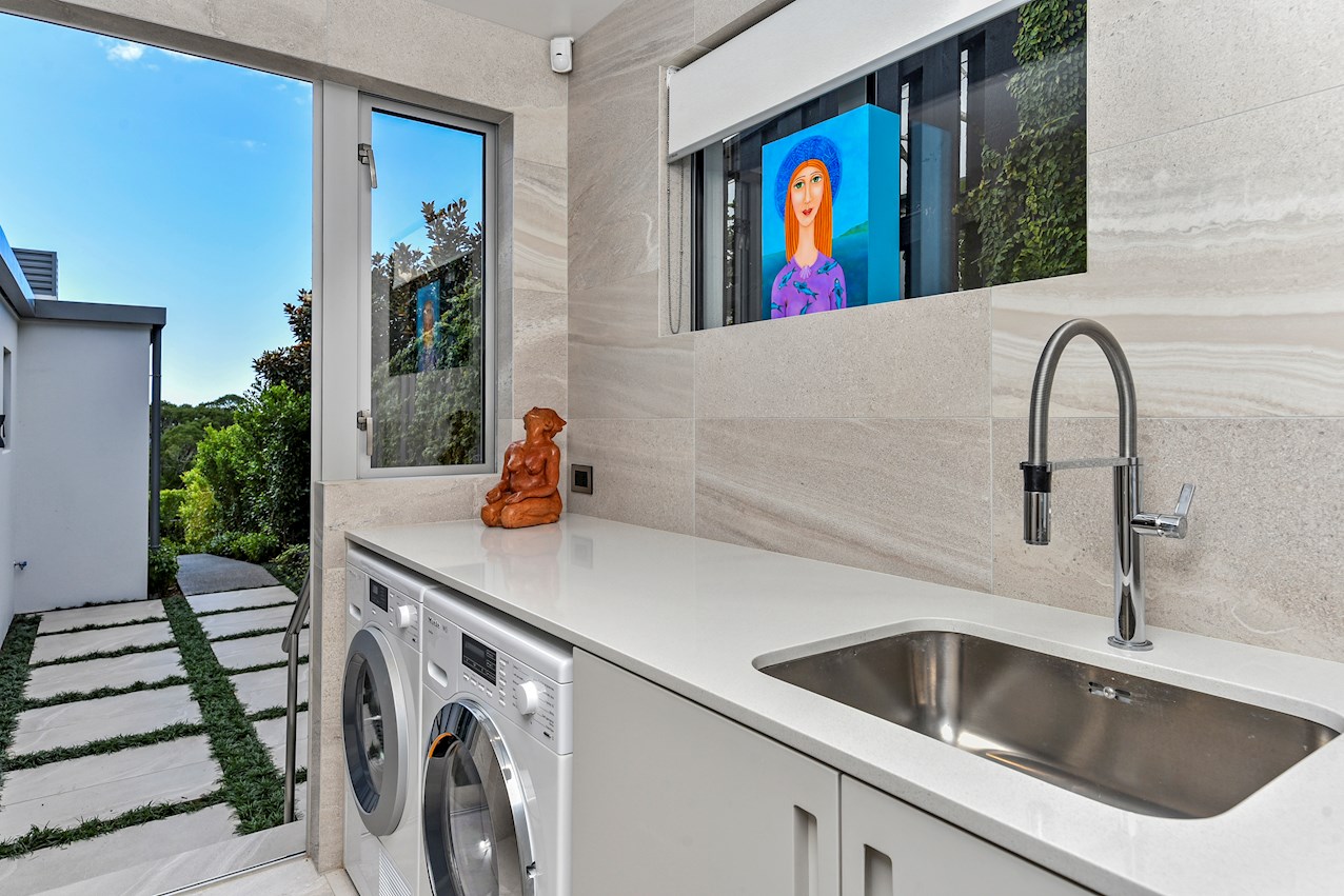 Oak flooring and feature ceilings add interest and enhance the interior spaces. Views of Lake Pupuke and the adjacent park are captured thanks to thoughtful planning. A home theatre provides a cinematic escape.
