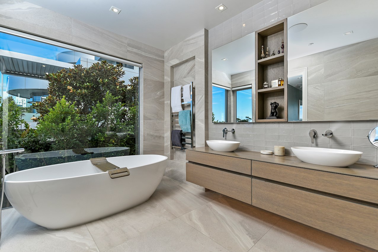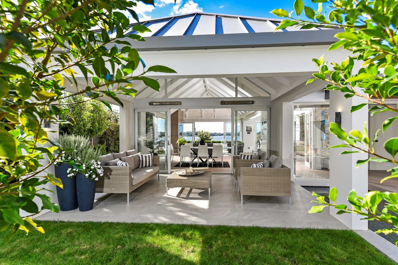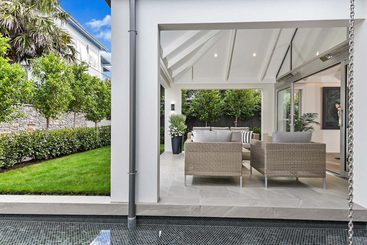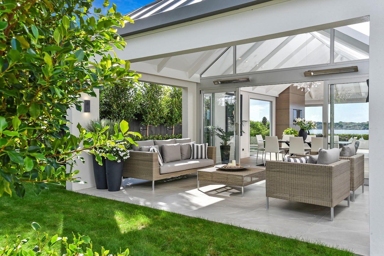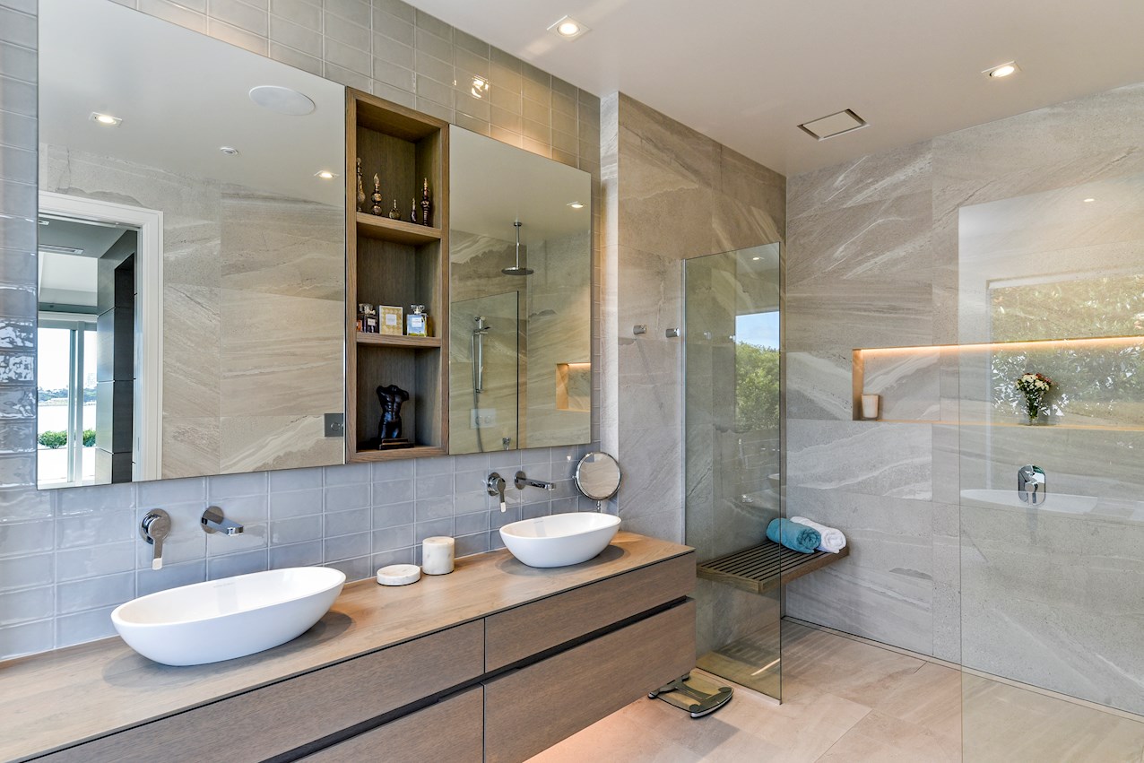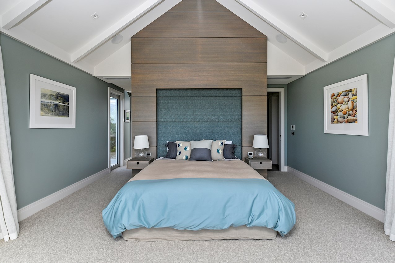 Oak flooring and feature ceilings add interest and enhance the interior spaces. Views of Lake Pupuke and the adjacent park are captured thanks to thoughtful planning. A home theatre provides a cinematic escape.