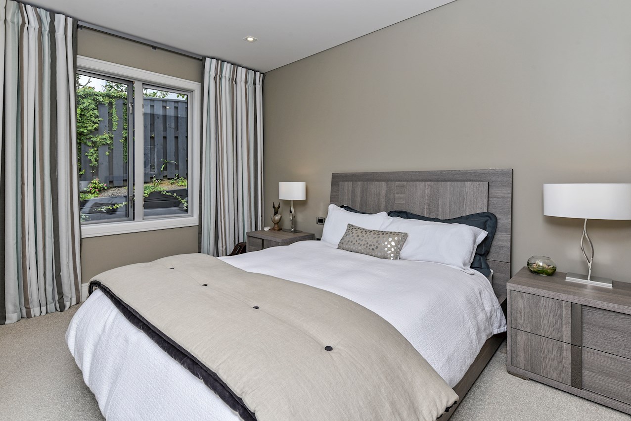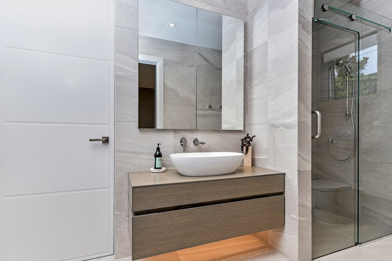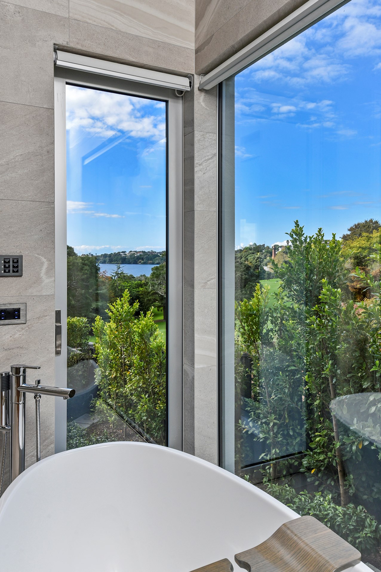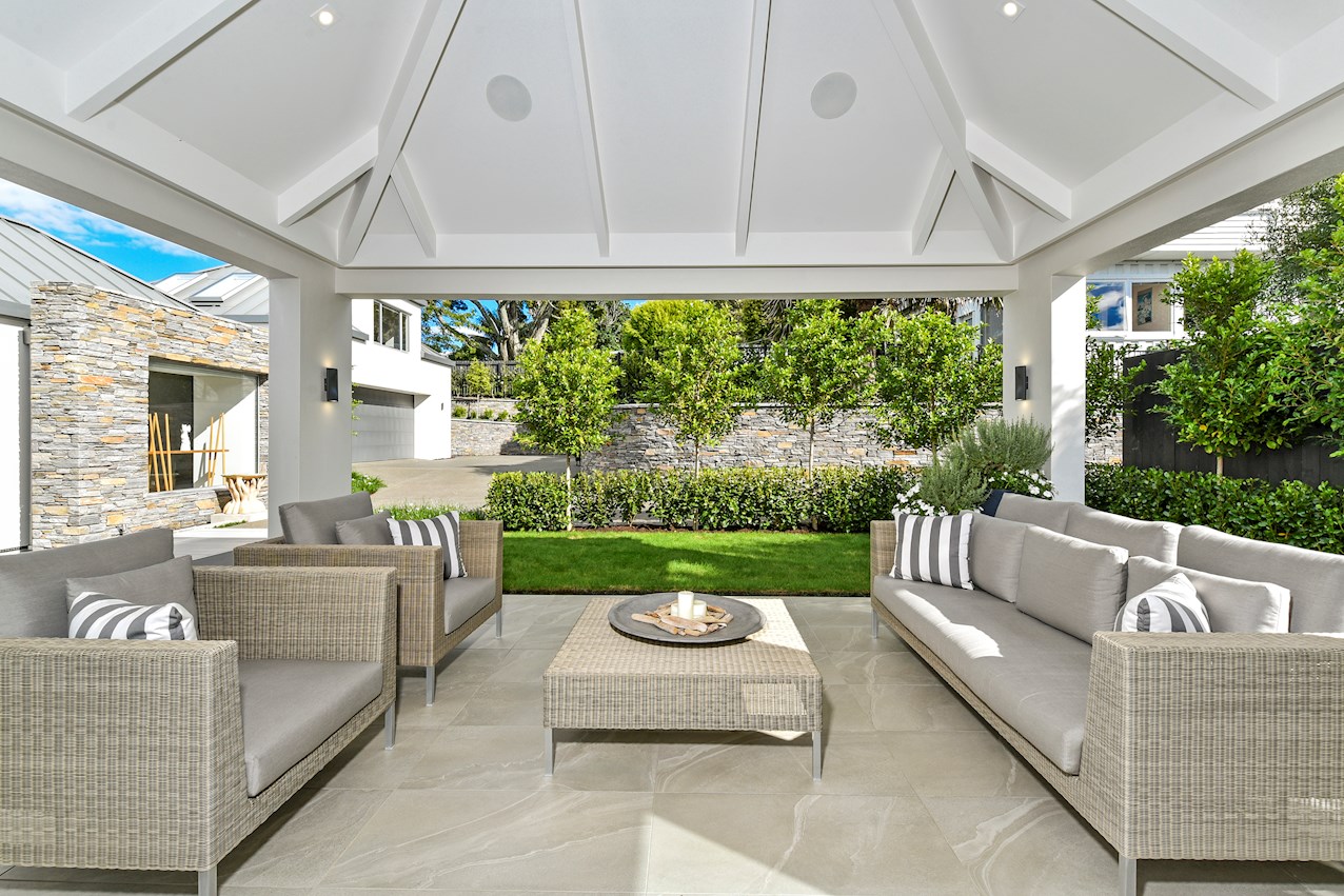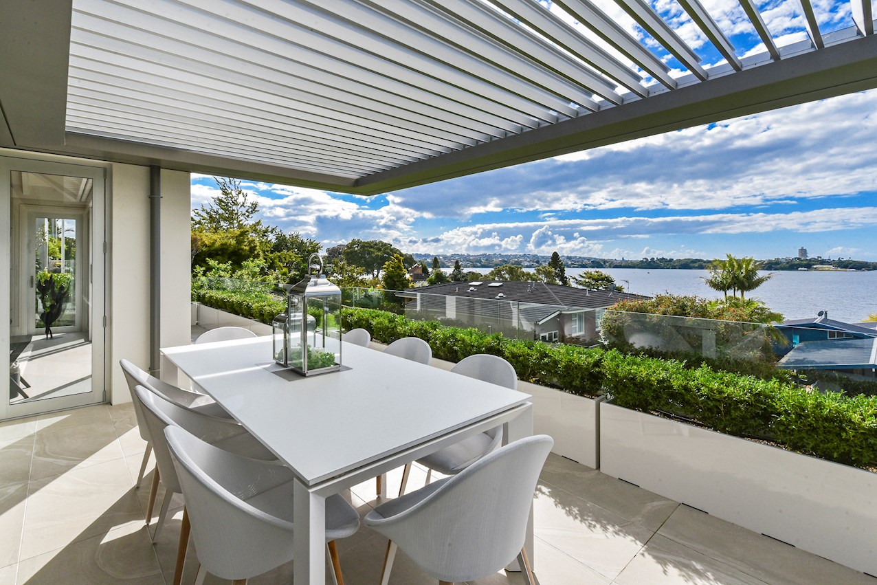 Oak flooring and feature ceilings add interest and enhance the interior spaces. Views of Lake Pupuke and the adjacent park are captured thanks to thoughtful planning. A home theatre provides a cinematic escape.
