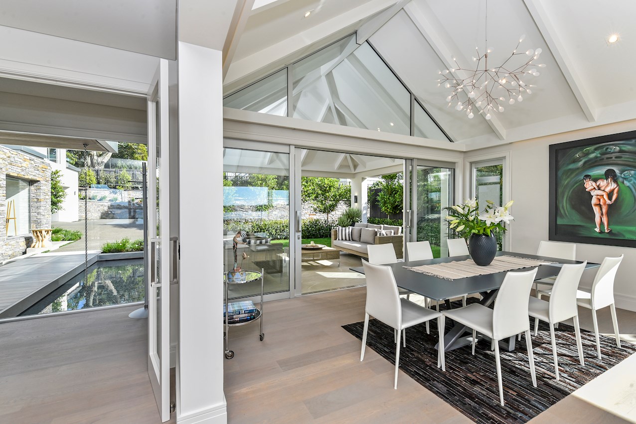 With light, glazed forms nestled into lush landscaping, this exceptional Auckland home behaves like an inverted greenhouse: plants look in, instead of out. Residents thrive on passive solar gain. Multiple outdoor living options include covered alfresco dining and an open-air conservatory-style space.