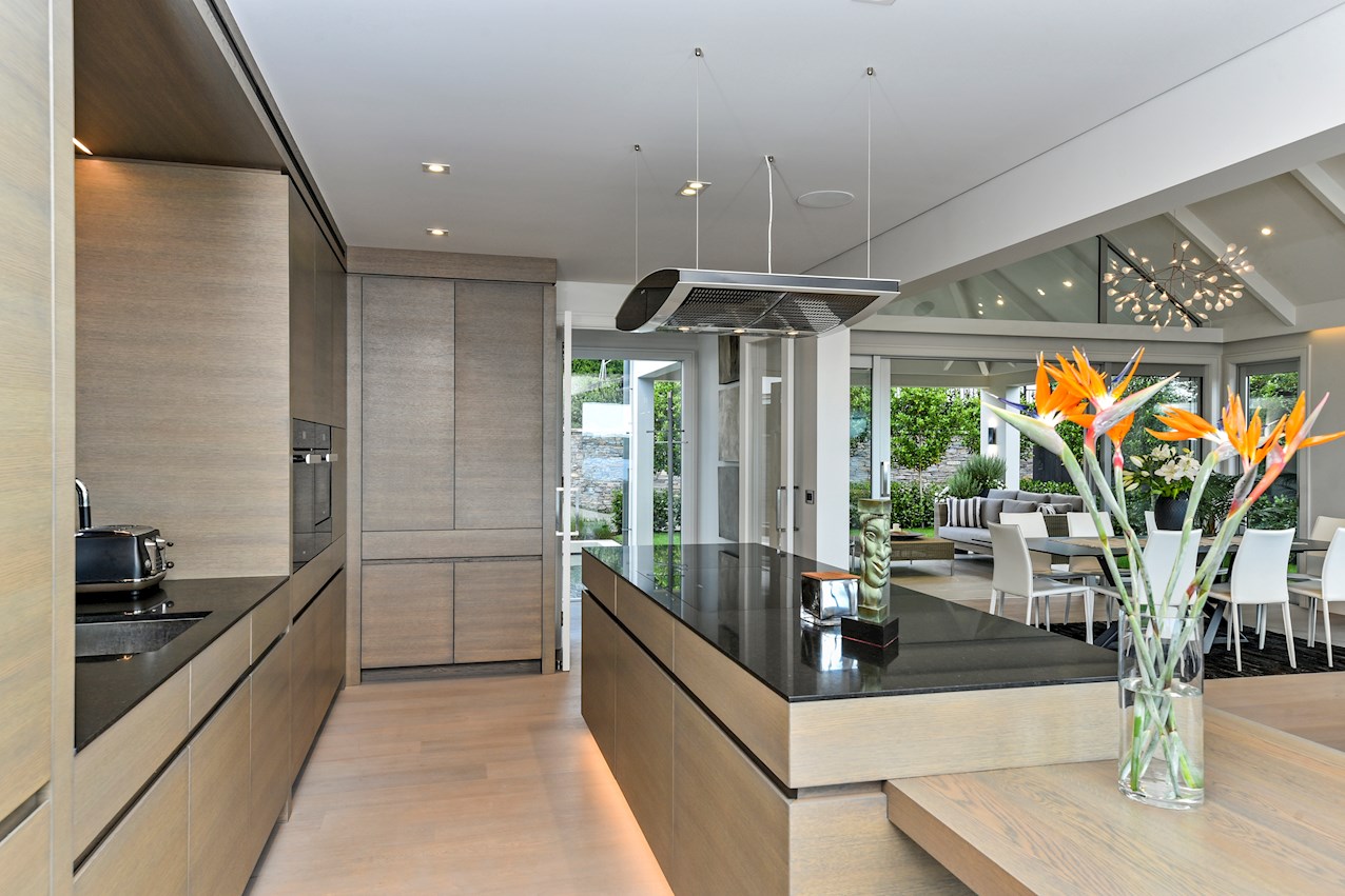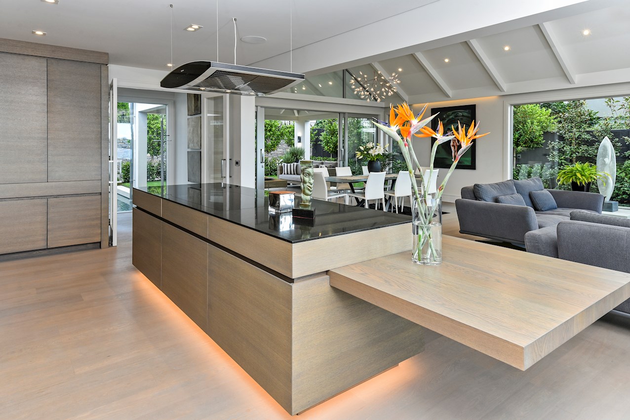 Contemporary design and detailed craftsmanship are evident at every turn, beginning with a timber walkway and large concrete pond that lead to the entrance. Cladding is solid plaster over masonry block. Anodised, double-glazed joinery, as well as zinc roofing, spouting, down pipes and garage door, show an emphasis on understated quality.