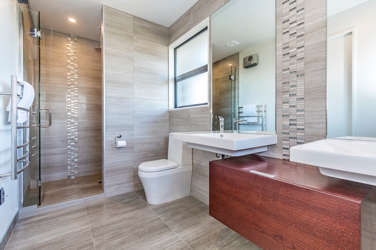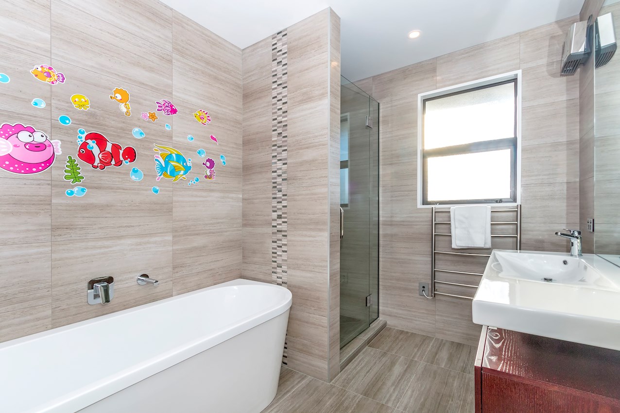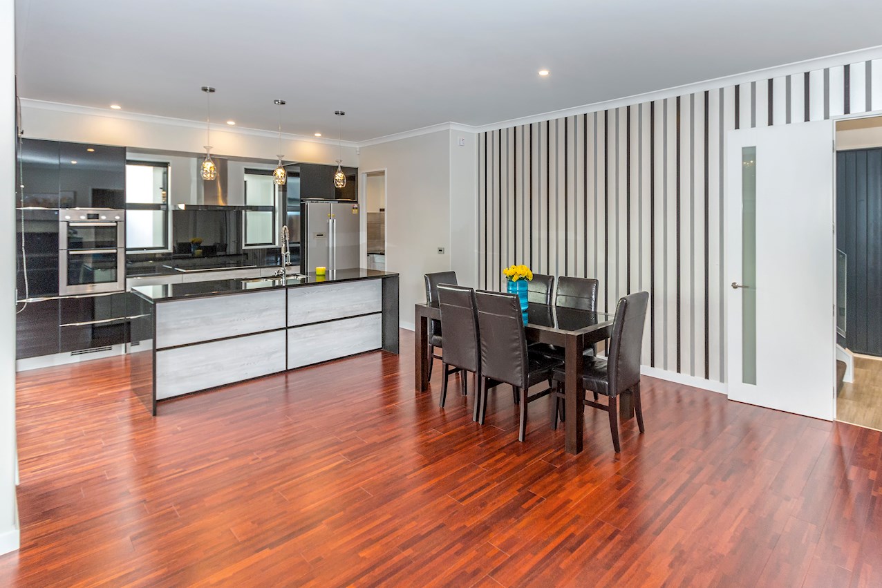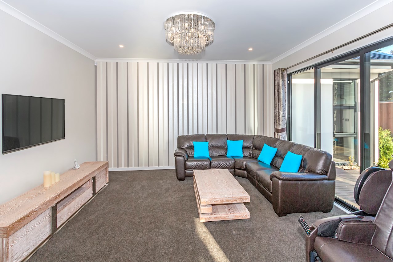 A huge stacking slider opens to an alfresco dining deck. The sitting area and separate carpeted lounge meet on a second sunny deck. Finishing finesse comes in the form of chandeliers and stylish striped wallpaper.