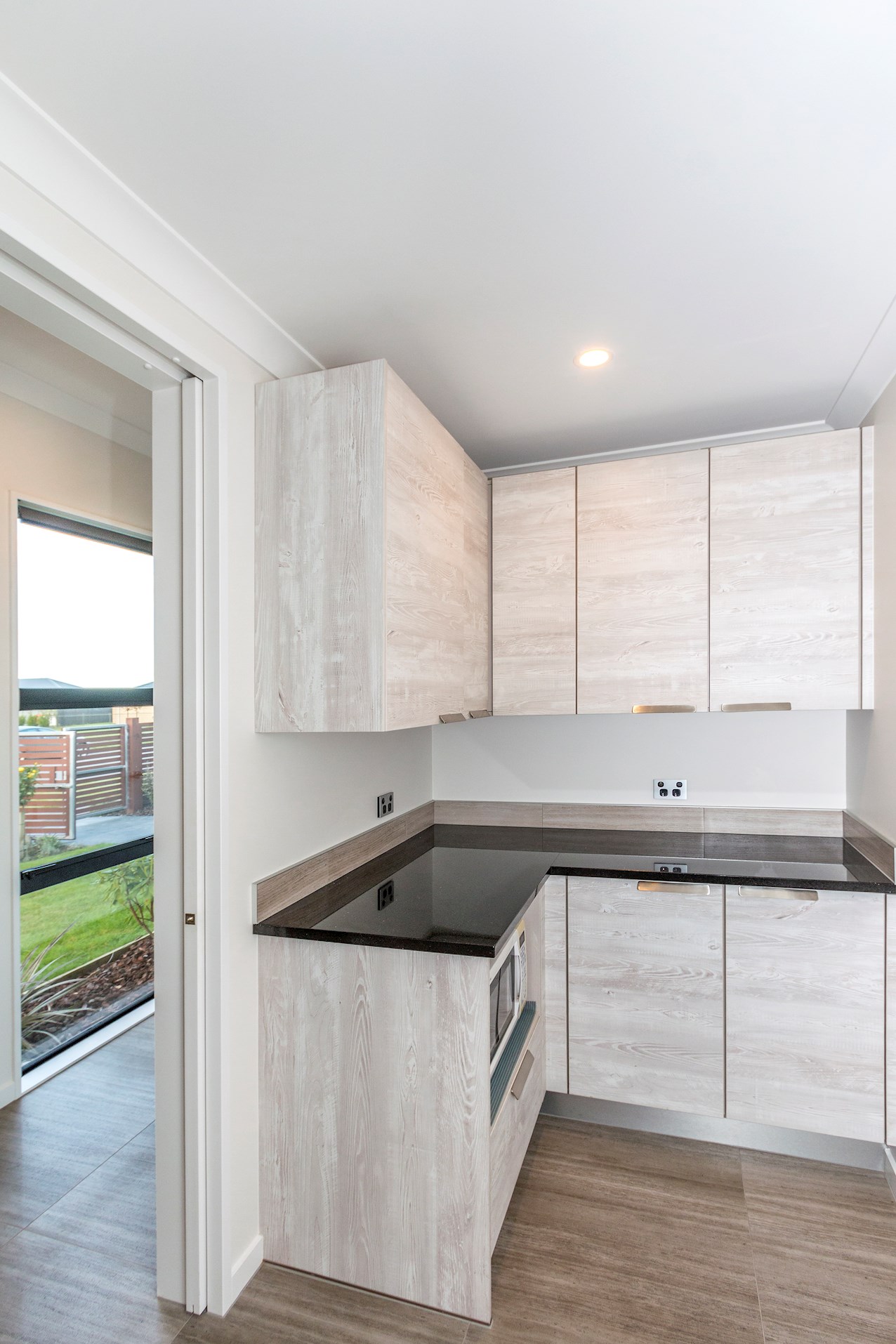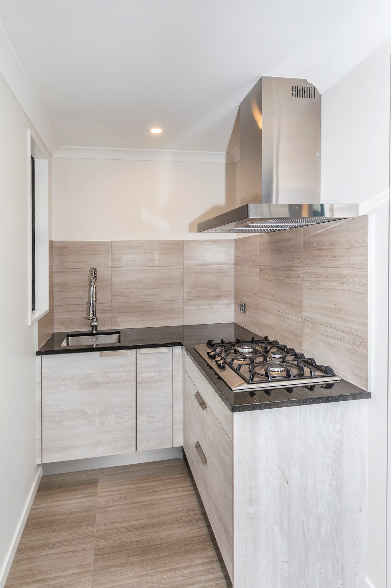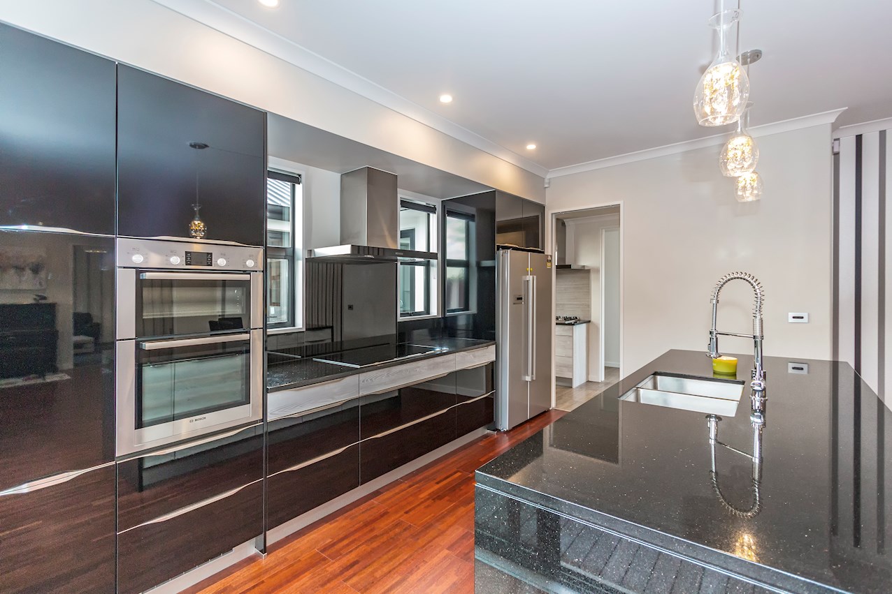 The kitchen is a true entertainer in the open-plan area. Sleek joinery shines, along with a trio of pendant lights, hovering like upturned wine glasses above the island bench. A scullery with separate sink, extractor fan and gas hob hides all manner of mess from guests.