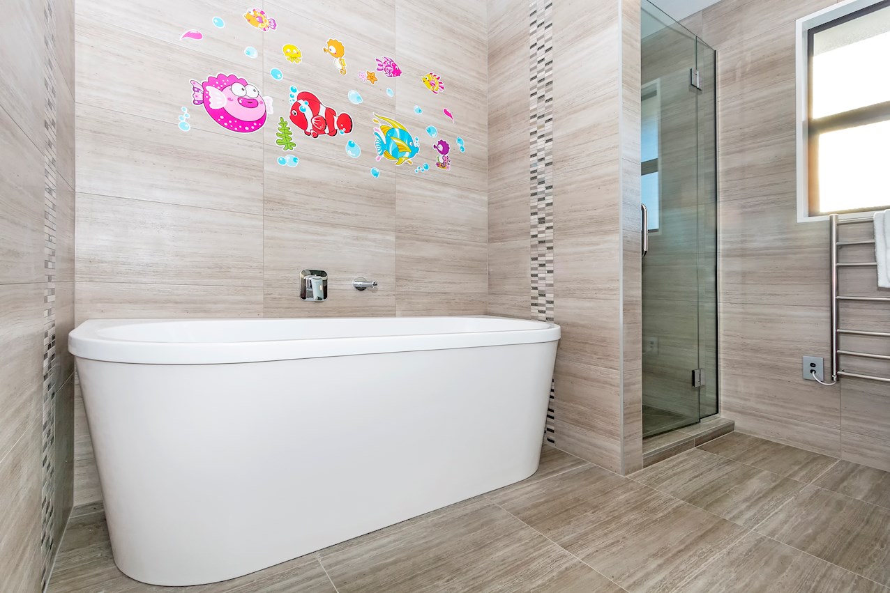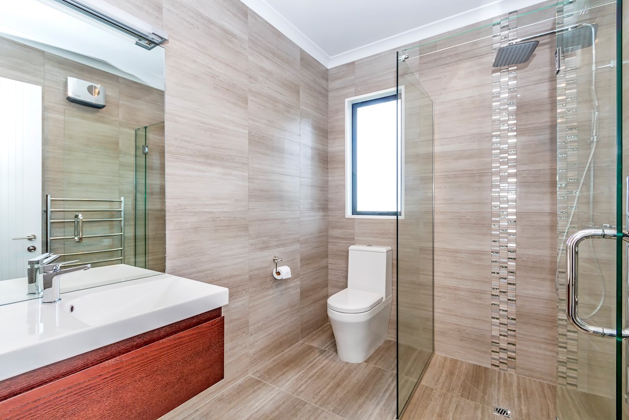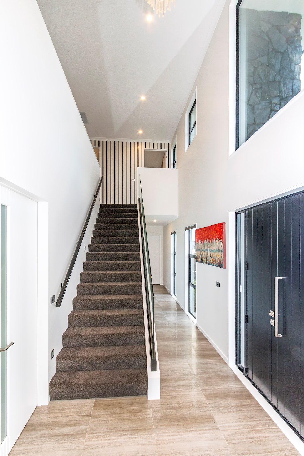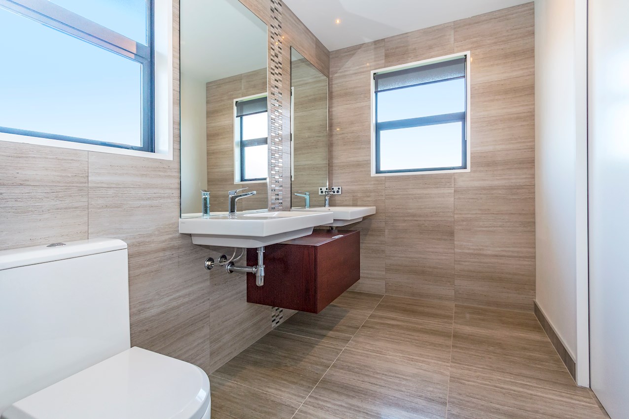 Double doors open to a light-filled double-height entry with carpeted stairs, leading to the cosy sleeping quarters above. The master retreat boasts a built-in wardrobe and his-and-hers ensuite. Extensive tiling and double vanities deliver everyday luxury. Two further bathrooms serve family life and guests.