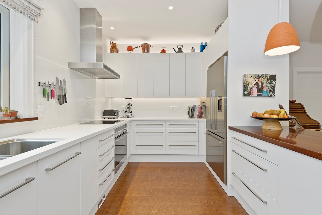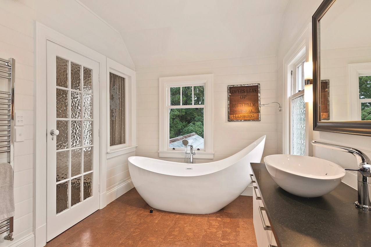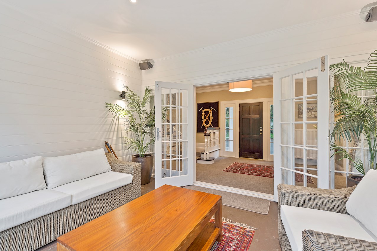 The updated design brings inside and out together, offering a cohesive, flowing living space that makes the most of established gardens, including protected trees. New French doors and a large picture window enhance the effect. Decks, verandas, pergolas and a mudroom cater to the owners’ love of the great outdoors.