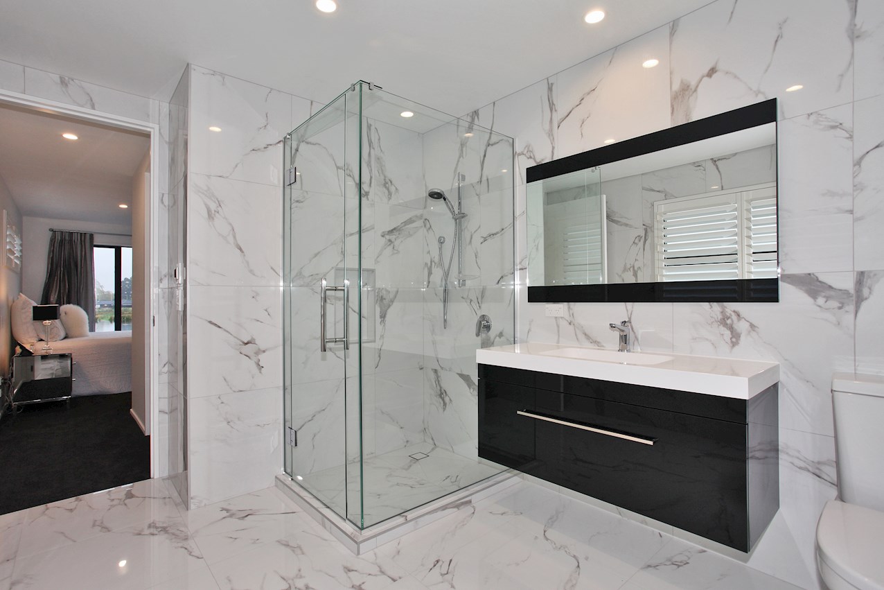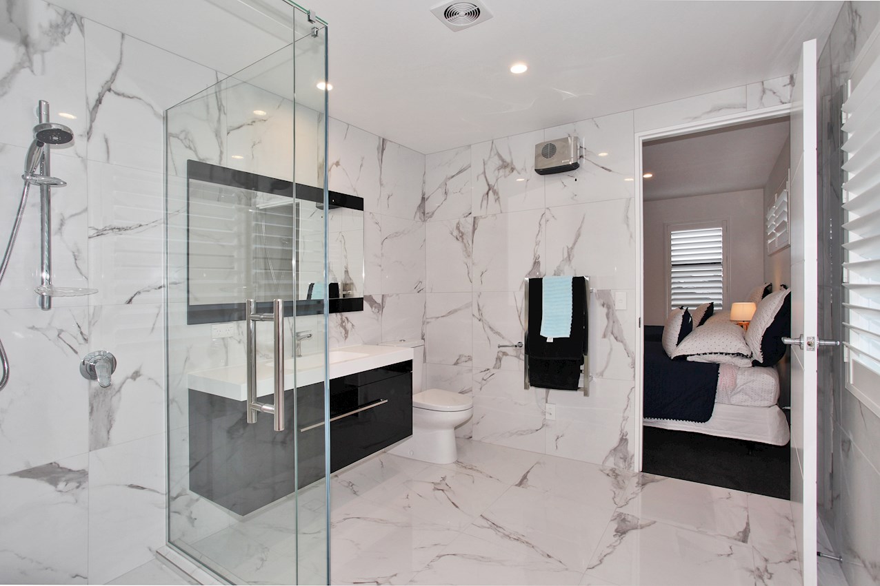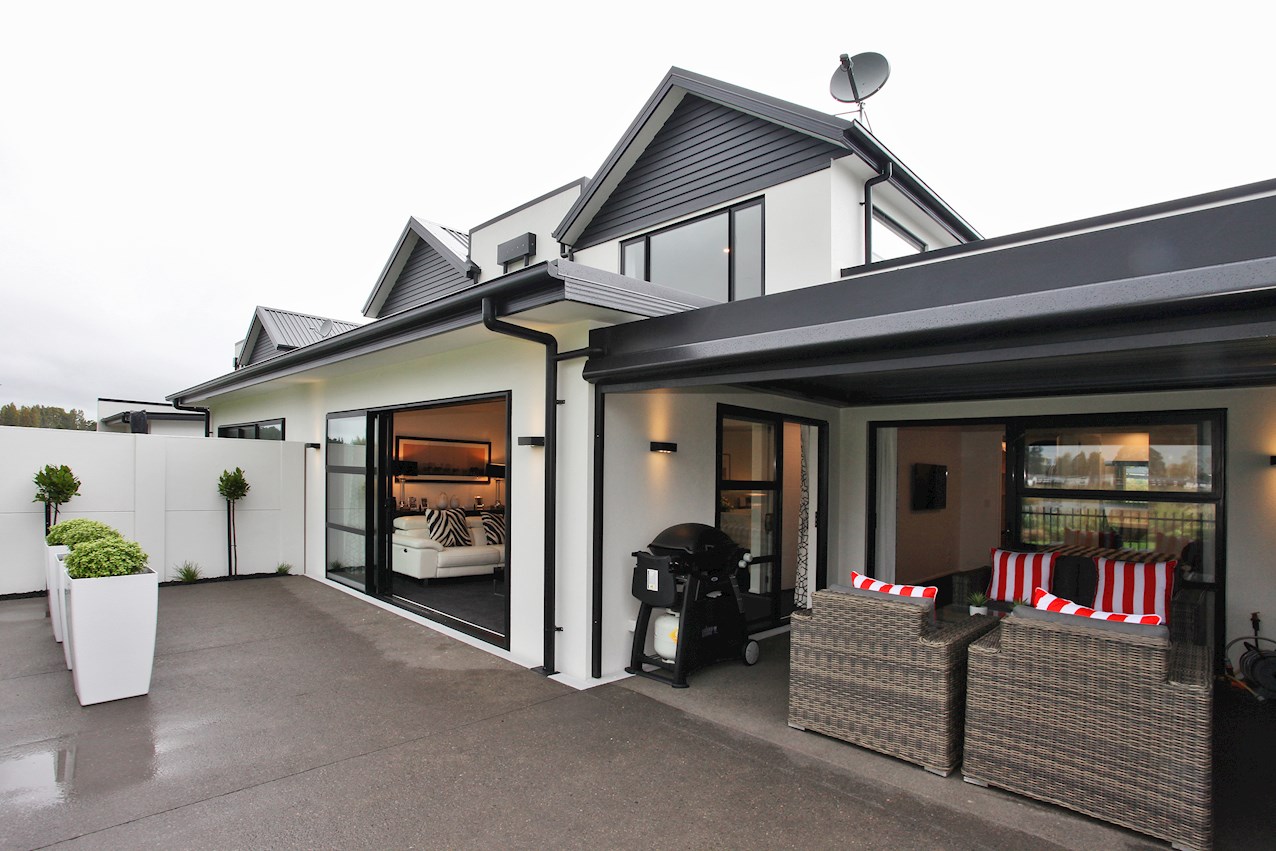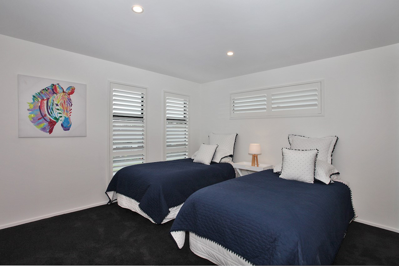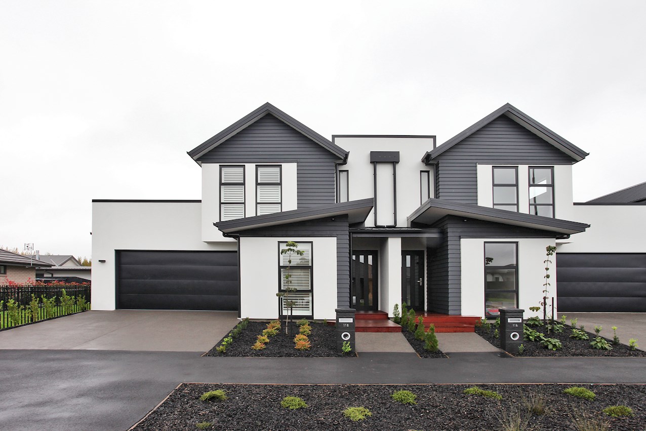 Lightweight concrete plastered panels and dark painted weatherboards make for a high-impact, low-maintenance exterior. The crisp and sharply contrasting white and black theme carries inside with carpets, tiles and joinery. A very spacious marble bathroom services the two upstairs bedrooms. A bedroom with ensuite awaits downstairs.