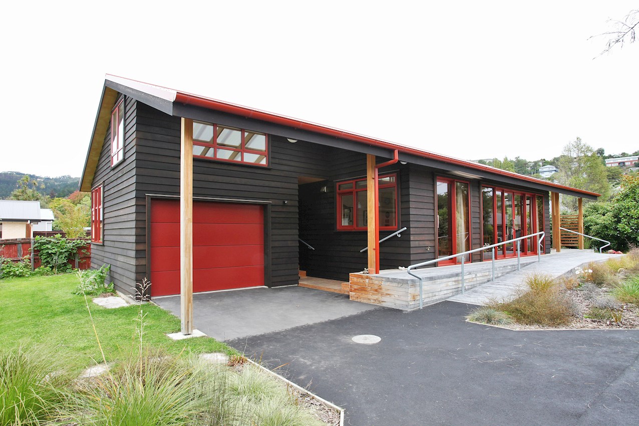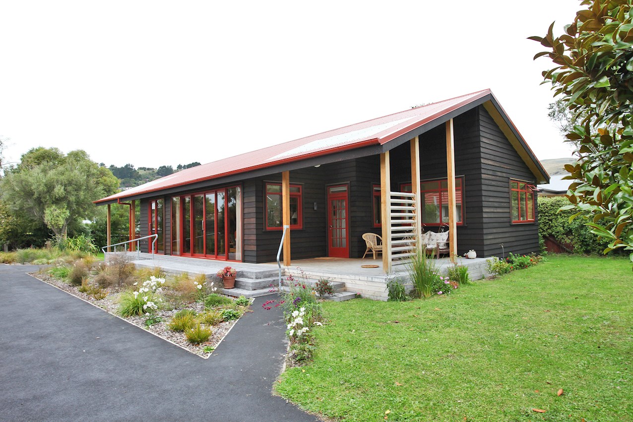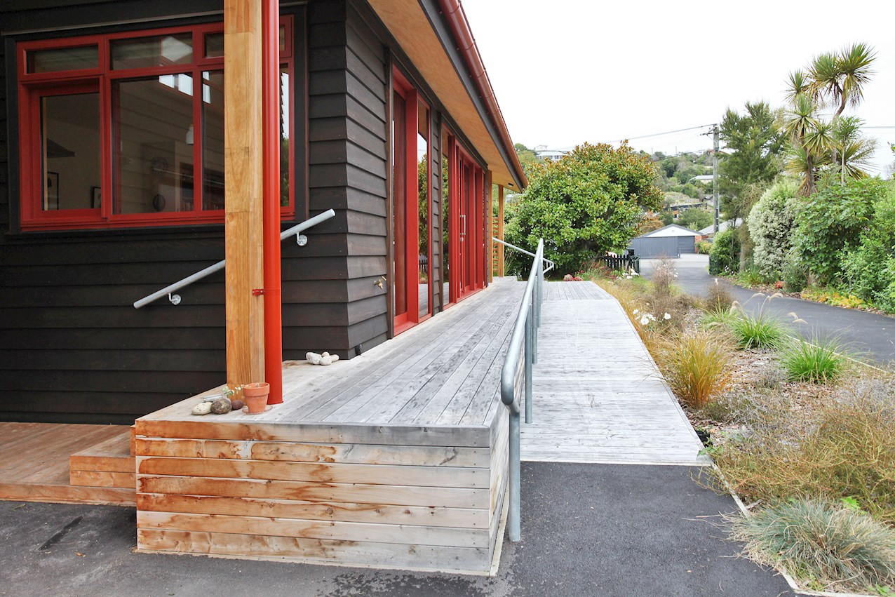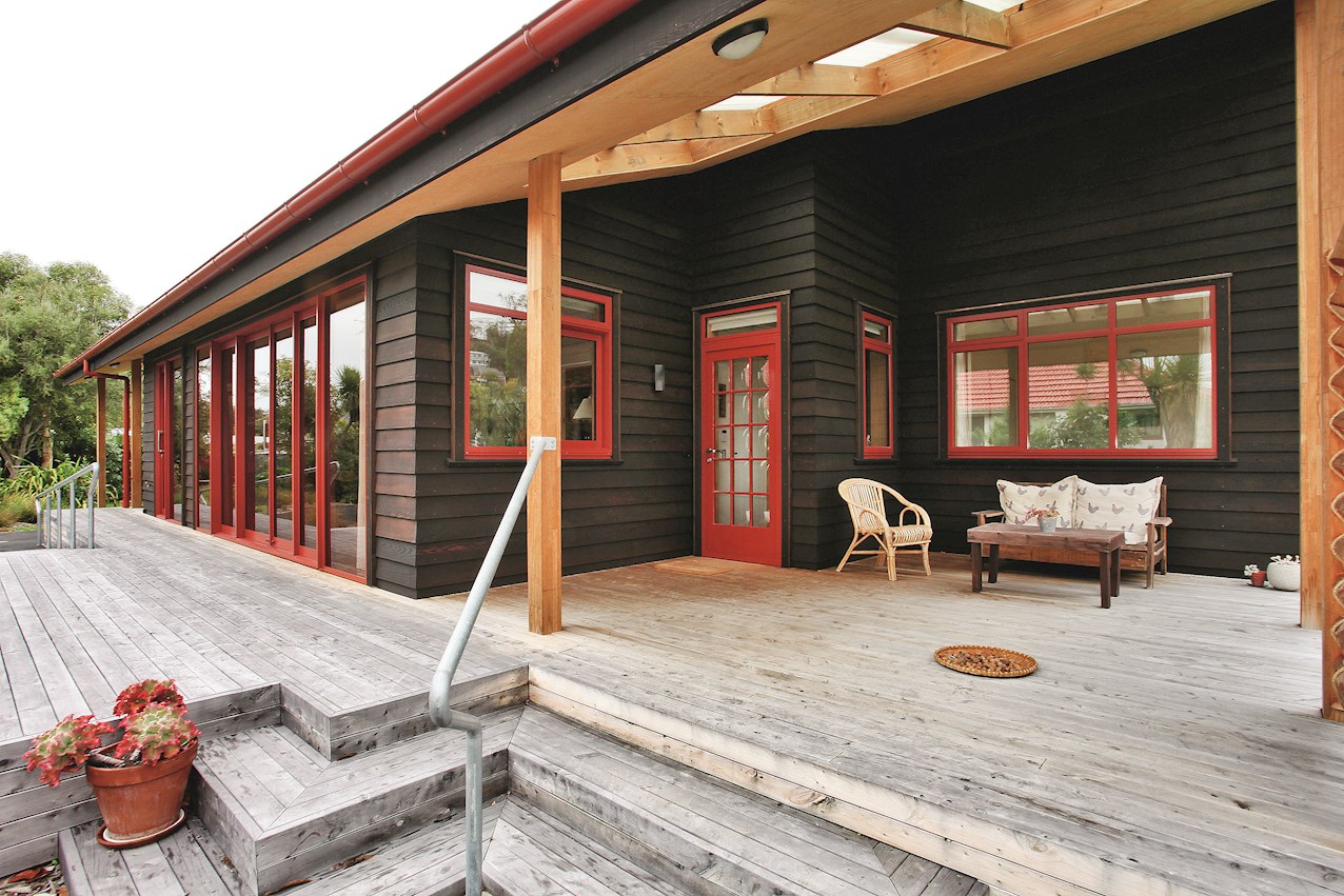 Let the gathering spill onto the macrocarpa decking outside. From here you can admire the oiled cedar bevel-back cladding and textured plywood soffits. The simple gable roof lends shelter from harsh rays or showers in the alfresco spaces. A ramp provides easy access to the deck and front door.