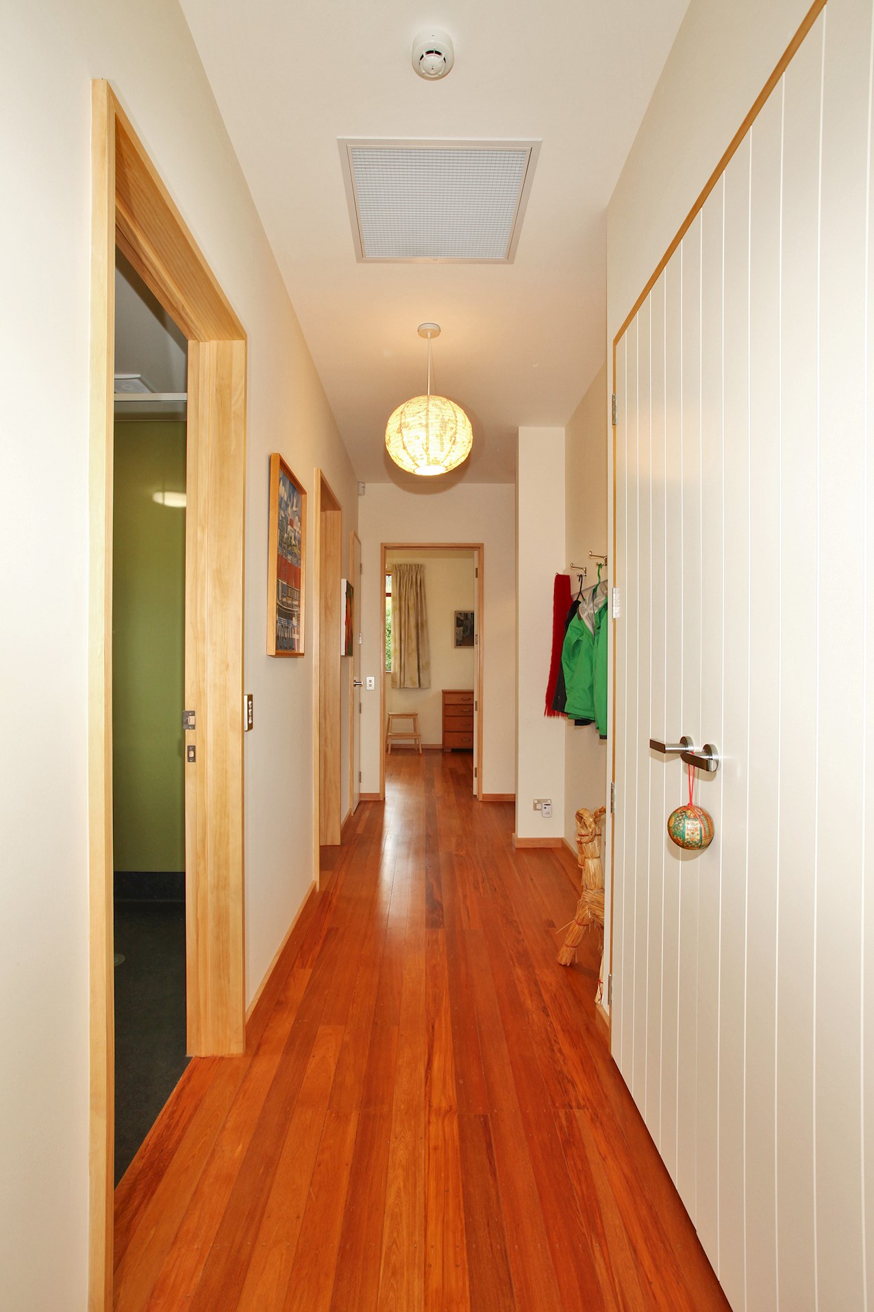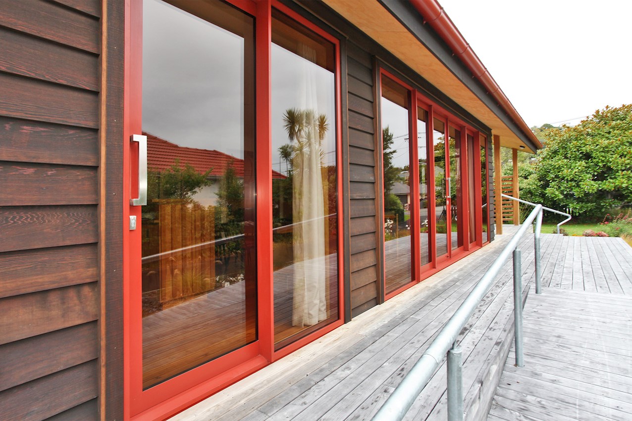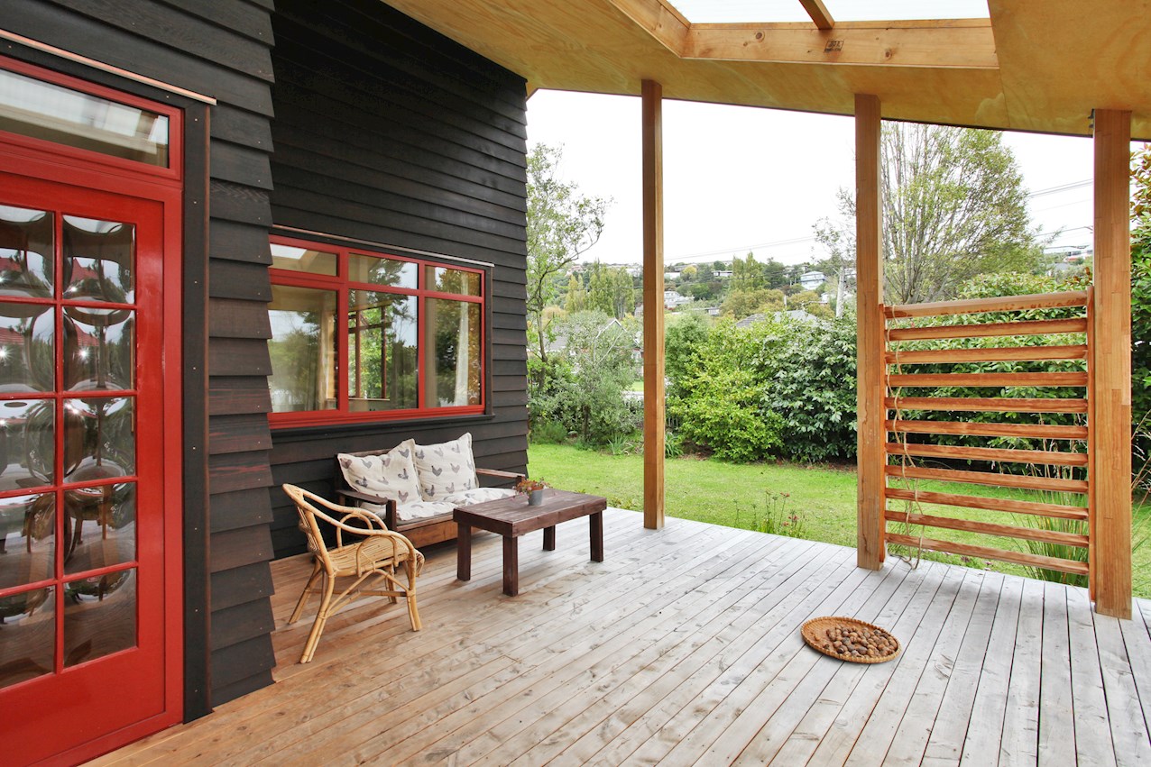 Let the gathering spill onto the macrocarpa decking outside. From here you can admire the oiled cedar bevel-back cladding and textured plywood soffits. The simple gable roof lends shelter from harsh rays or showers in the alfresco spaces. A ramp provides easy access to the deck and front door.