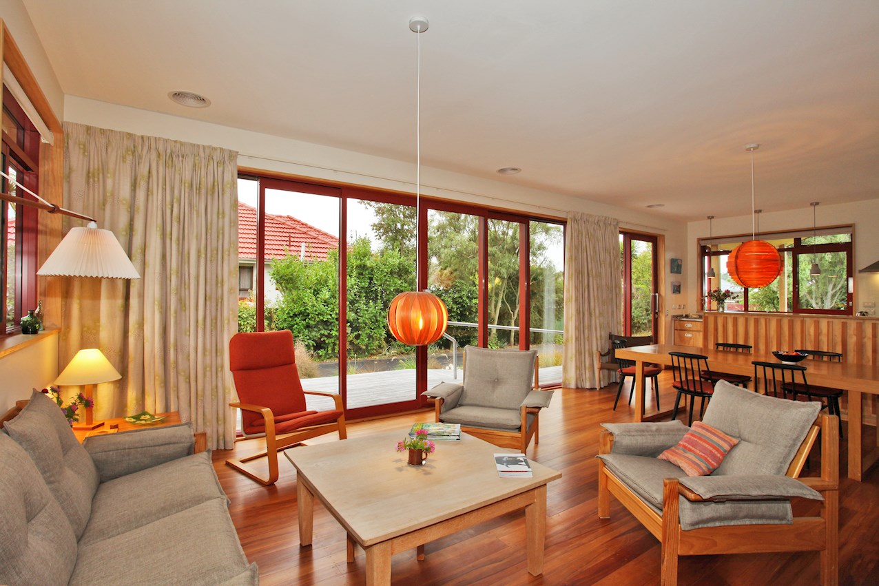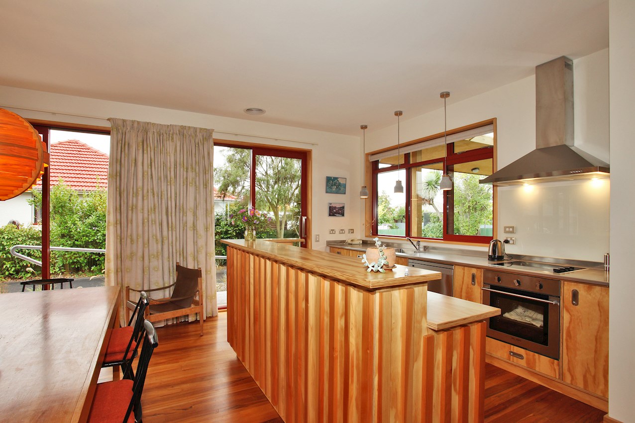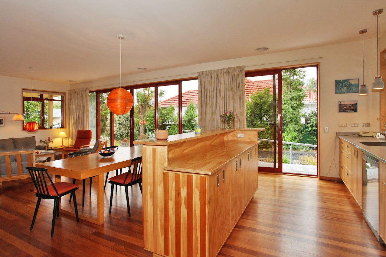 Timber features prominently throughout this two-bedroom post-quake rebuild in St Martins – a nod to the client’s Danish childhood. Rimu tongue-and-groove flooring salvaged from the original dwelling lends the open-plan living space a golden glow. The front door was rescued and recycled too.