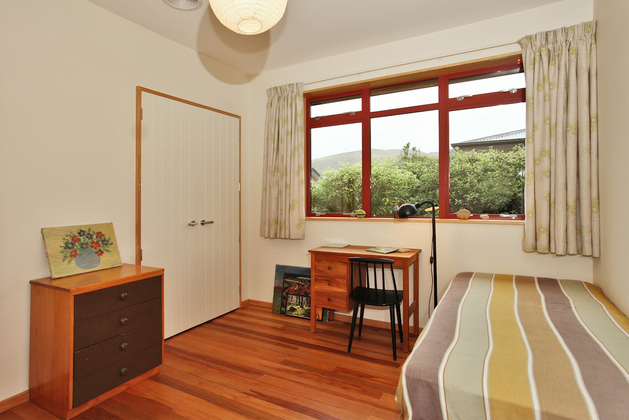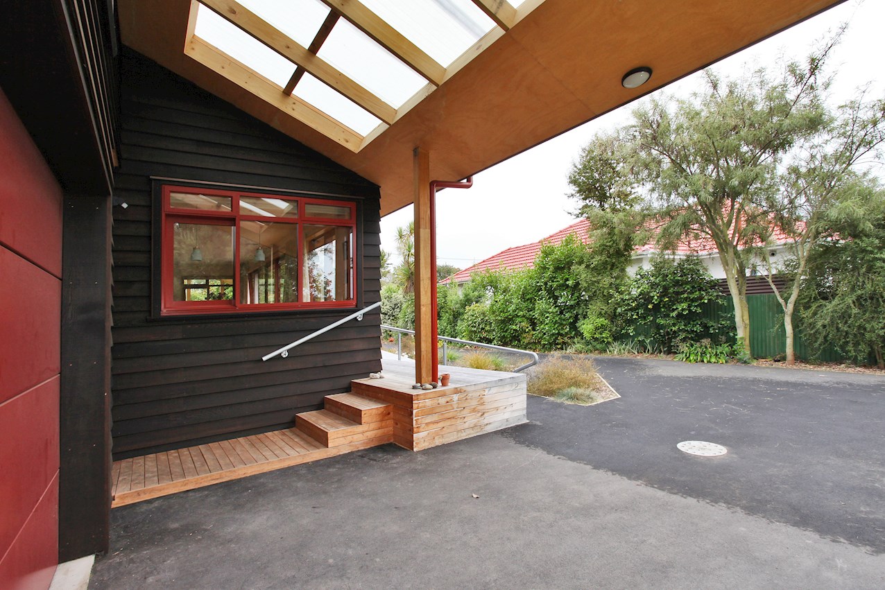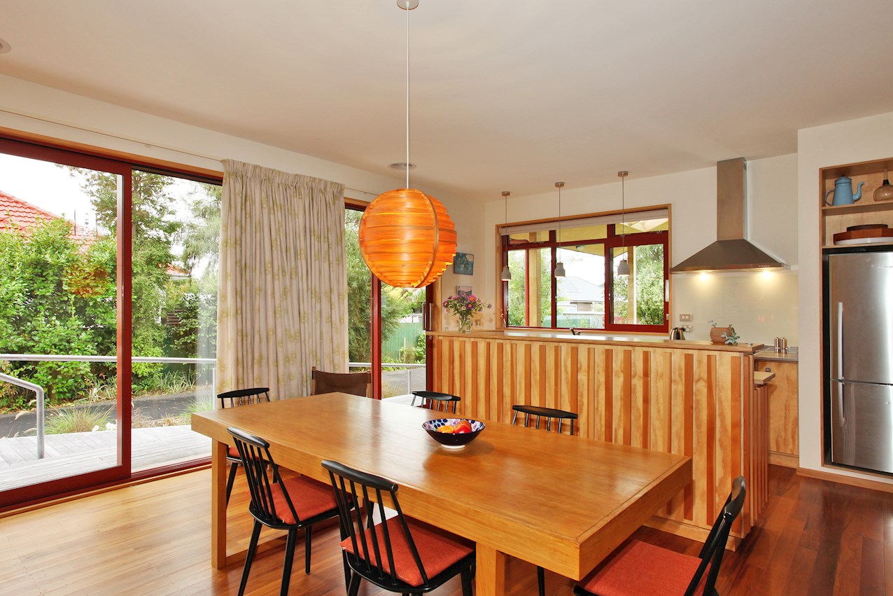 Timber features prominently throughout this two-bedroom post-quake rebuild in St Martins – a nod to the client’s Danish childhood. Rimu tongue-and-groove flooring salvaged from the original dwelling lends the open-plan living space a golden glow. The front door was rescued and recycled too.