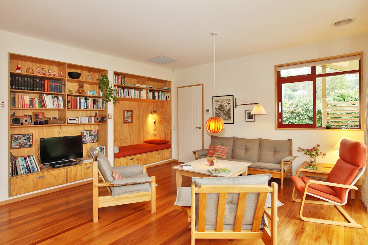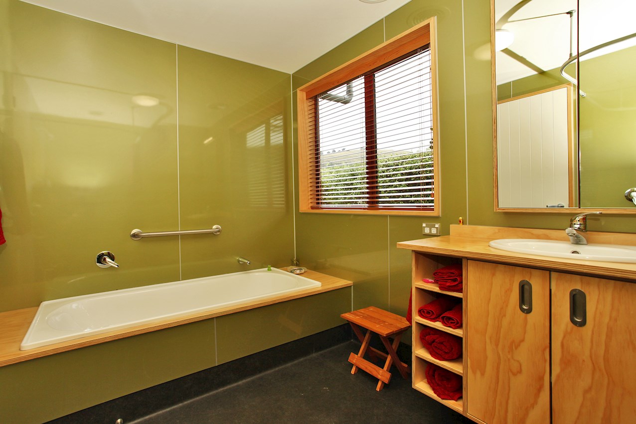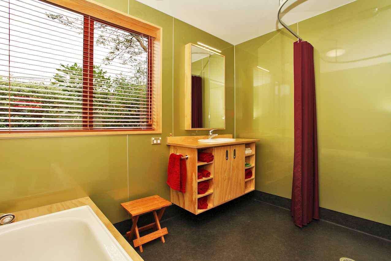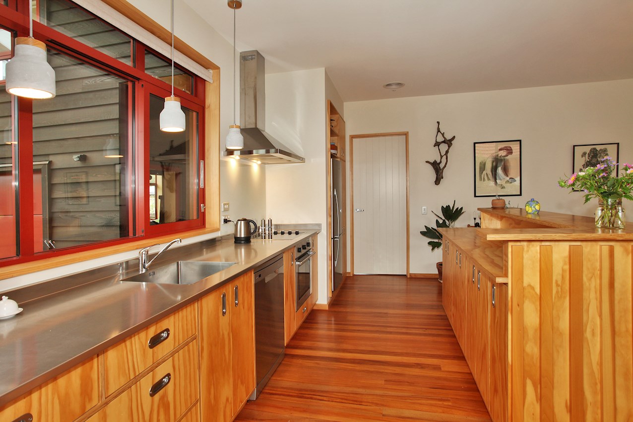 Macrocarpa skirting, stairs and trim, and deep timber sills sit happily alongside plywood joinery in the bathroom, living space and kitchen. The stepped, central bench unit is a thoughtful addition in the entertainer’s space, allowing the cook to converse with guests while keeping clutter concealed.