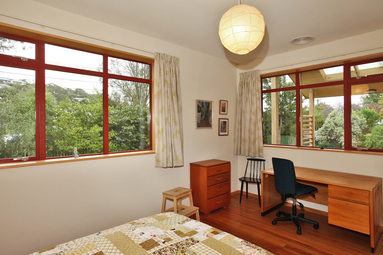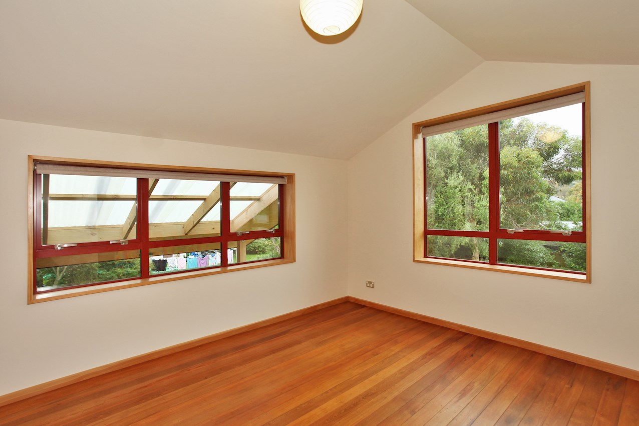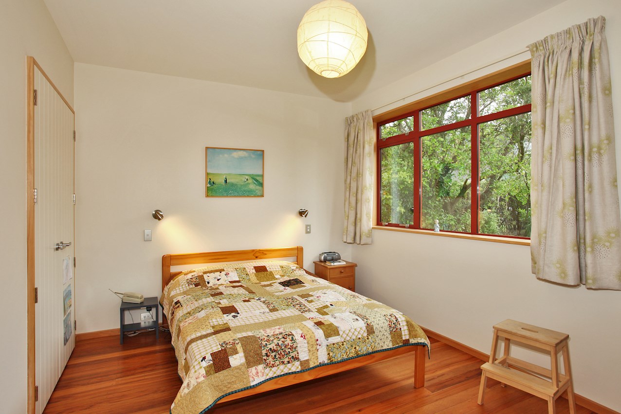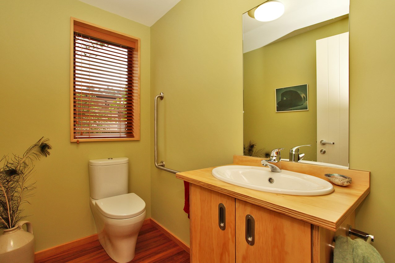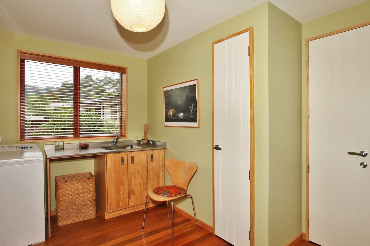 Macrocarpa skirting, stairs and trim, and deep timber sills sit happily alongside plywood joinery in the bathroom, living space and kitchen. The stepped, central bench unit is a thoughtful addition in the entertainer’s space, allowing the cook to converse with guests while keeping clutter concealed.