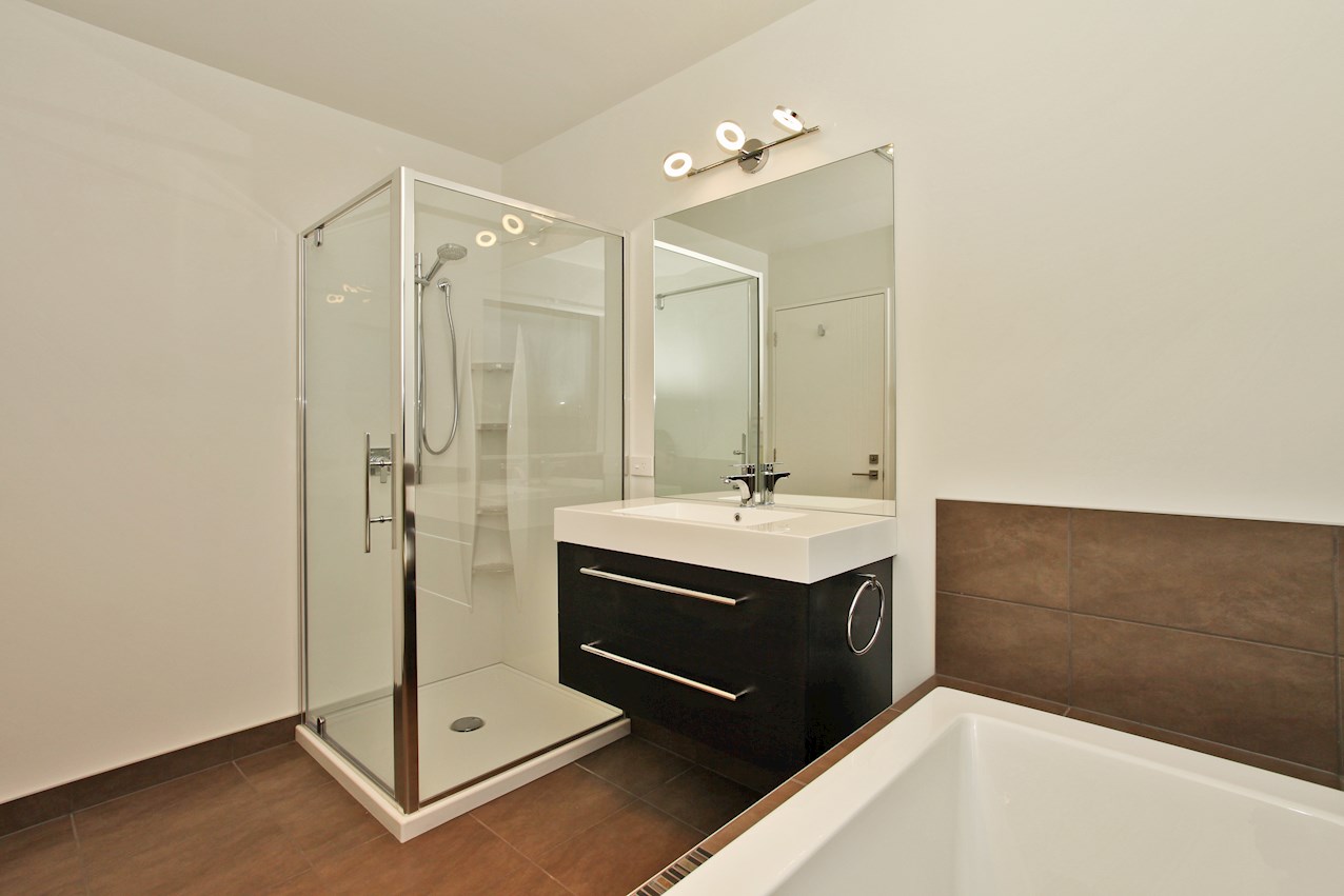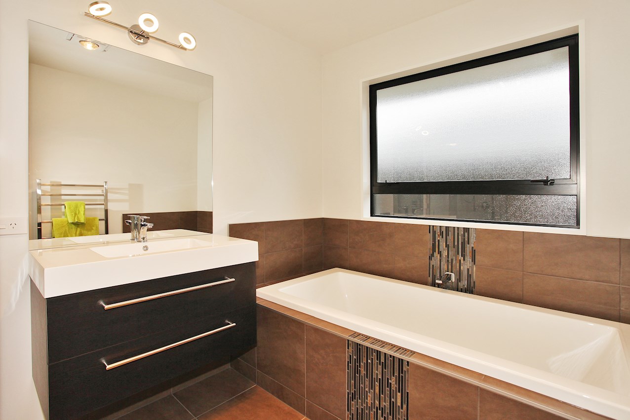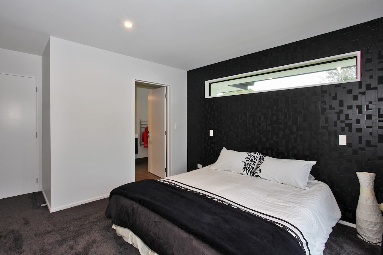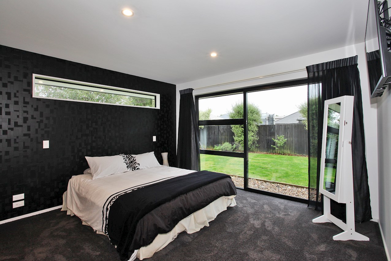 The master bedroom is the owners’ sanctuary in vivid black and white. Their ensuite features a level-entry tiled shower. The family bathroom and three further bedrooms serve children and guests. A double garage completes this enviable package.