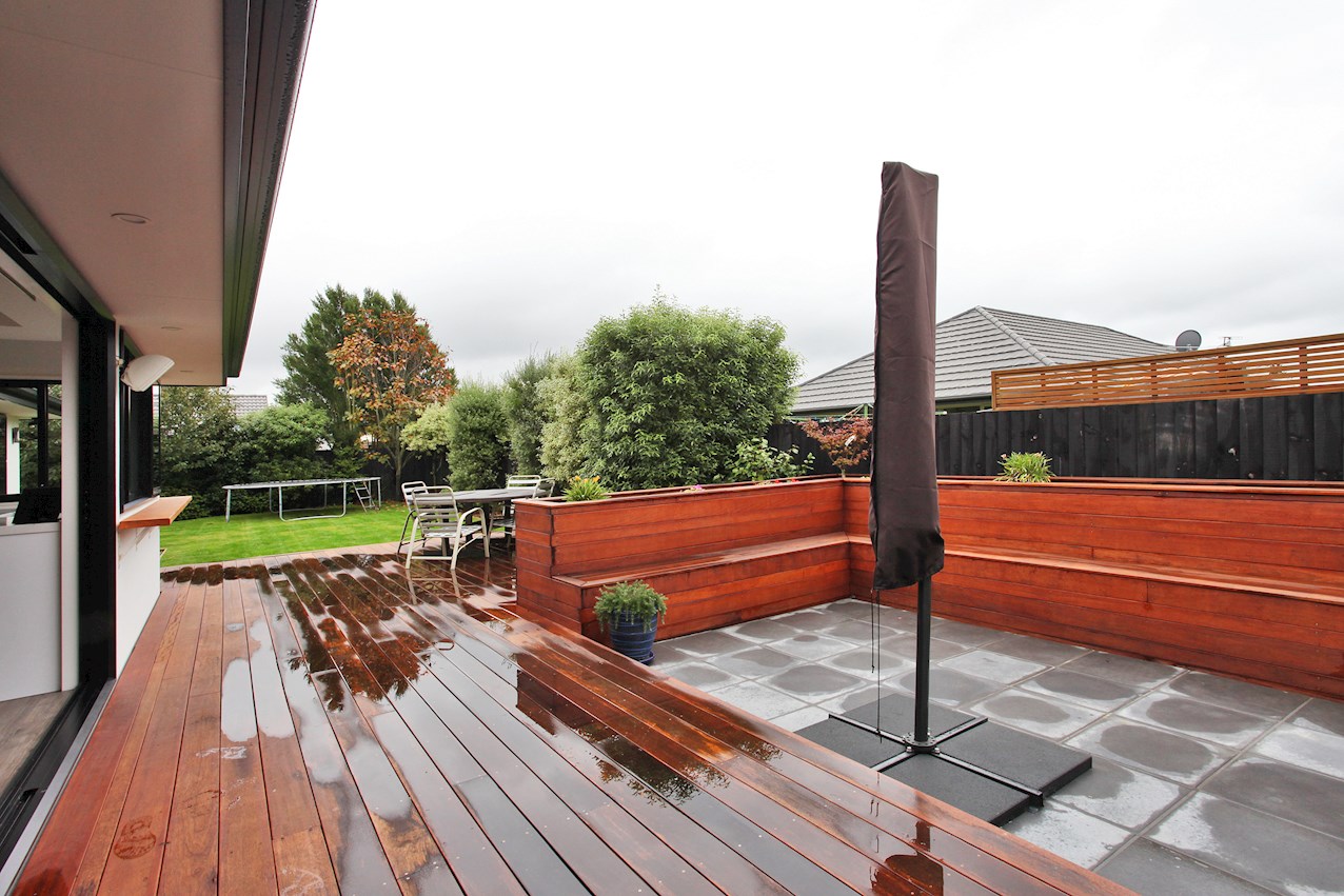 Living spaces flow out through glass doors to a large deck, patio and lawn. The design incorporates built-in seating, box gardens and a barbecue space.