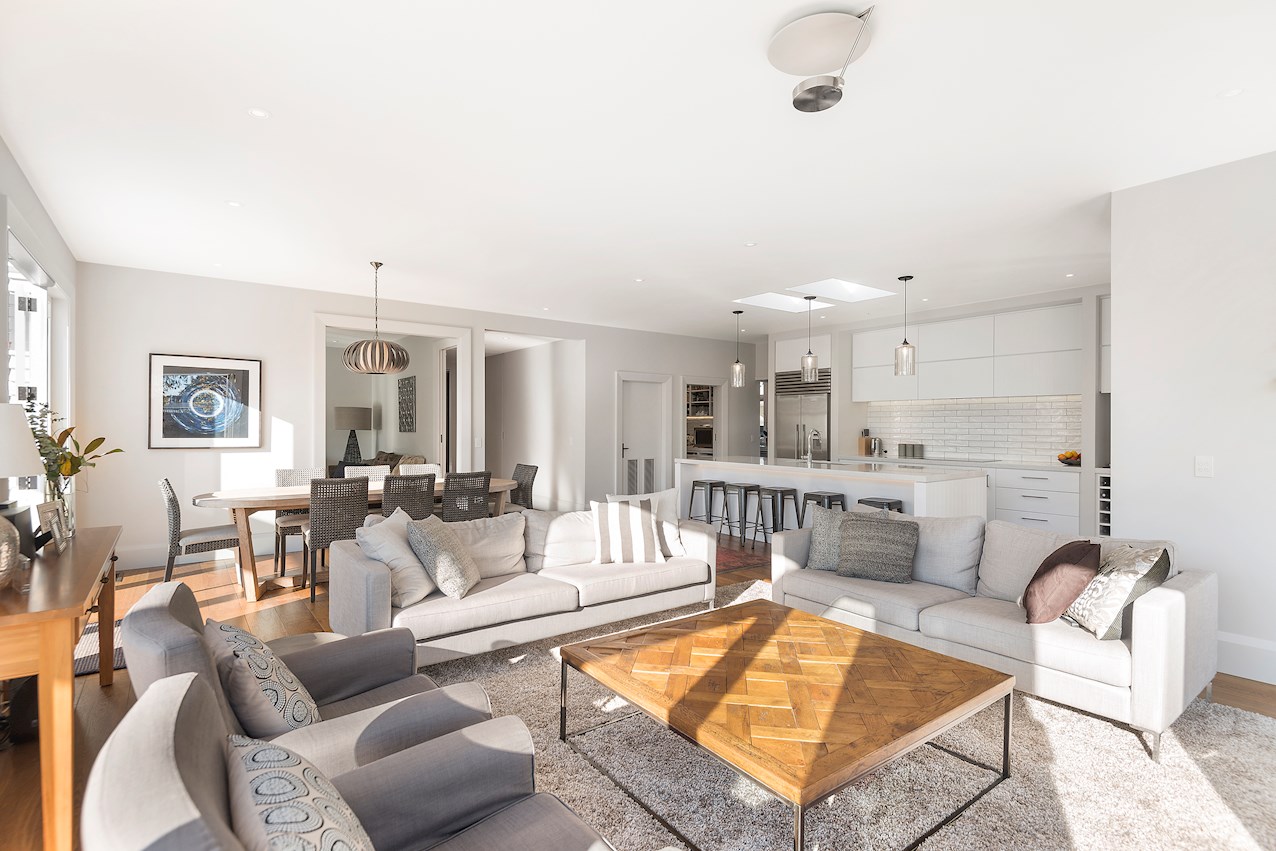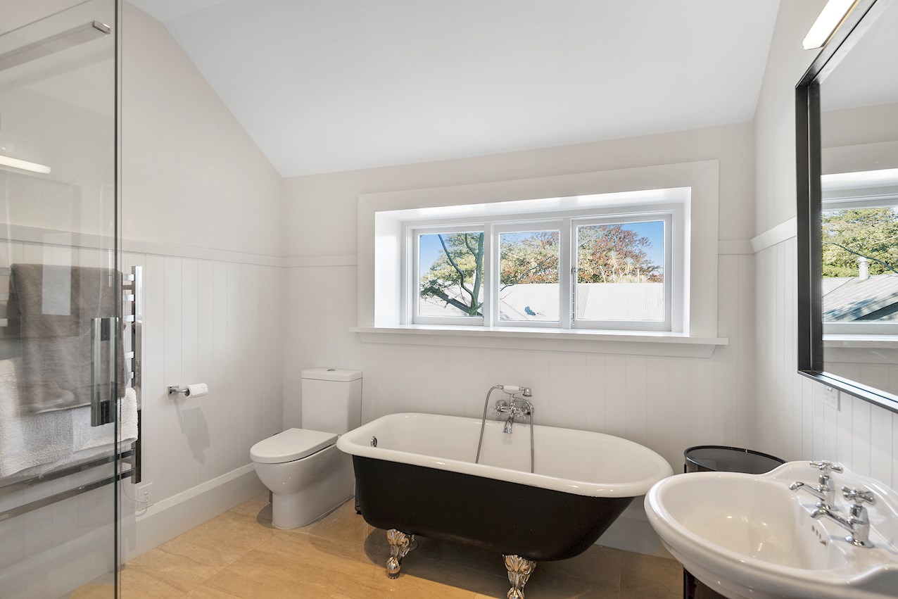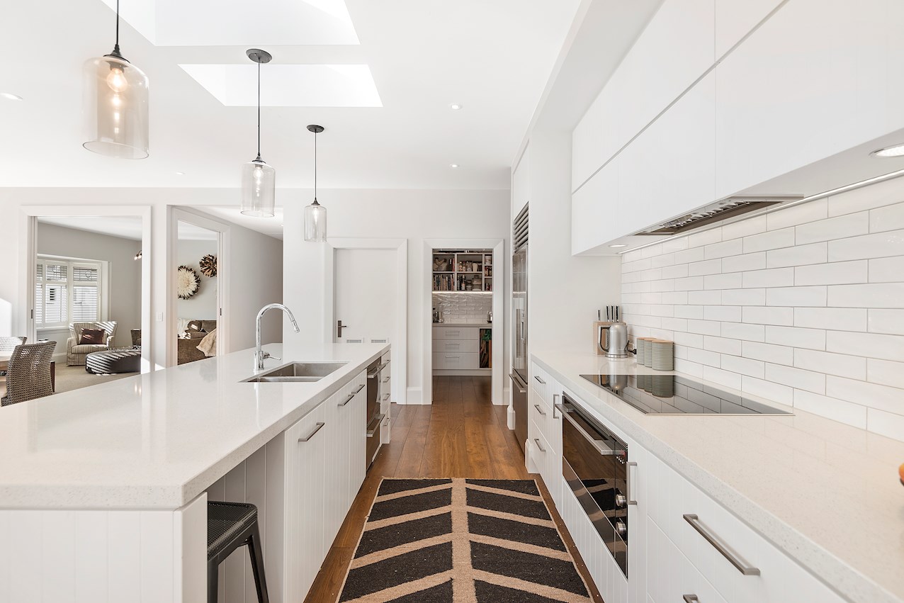 The classic white kitchen is all clean lines, sleek style and mod cons and has a scullery. Skylights, subway tiles, stone benchtops, an induction hob and wine fridge make this domain a pleasure to cook and entertain in. The space is beautifully open to the generous, sun-soaked living area. Deluxe furnishings are in keeping with the home’s opulent feel. Original details such as decorative windows have been beautifully preserved.