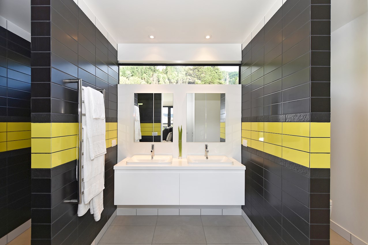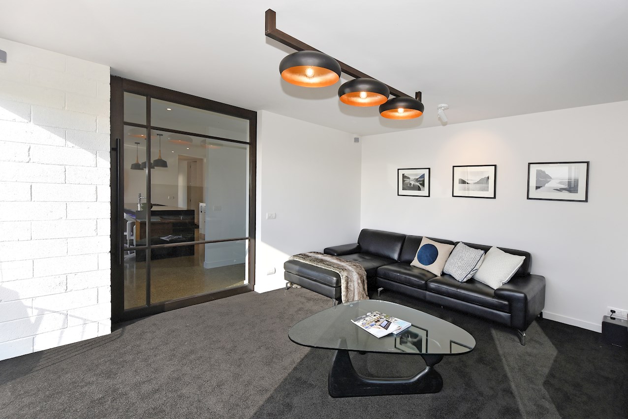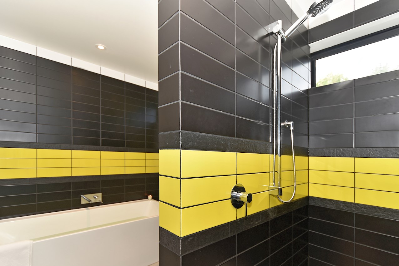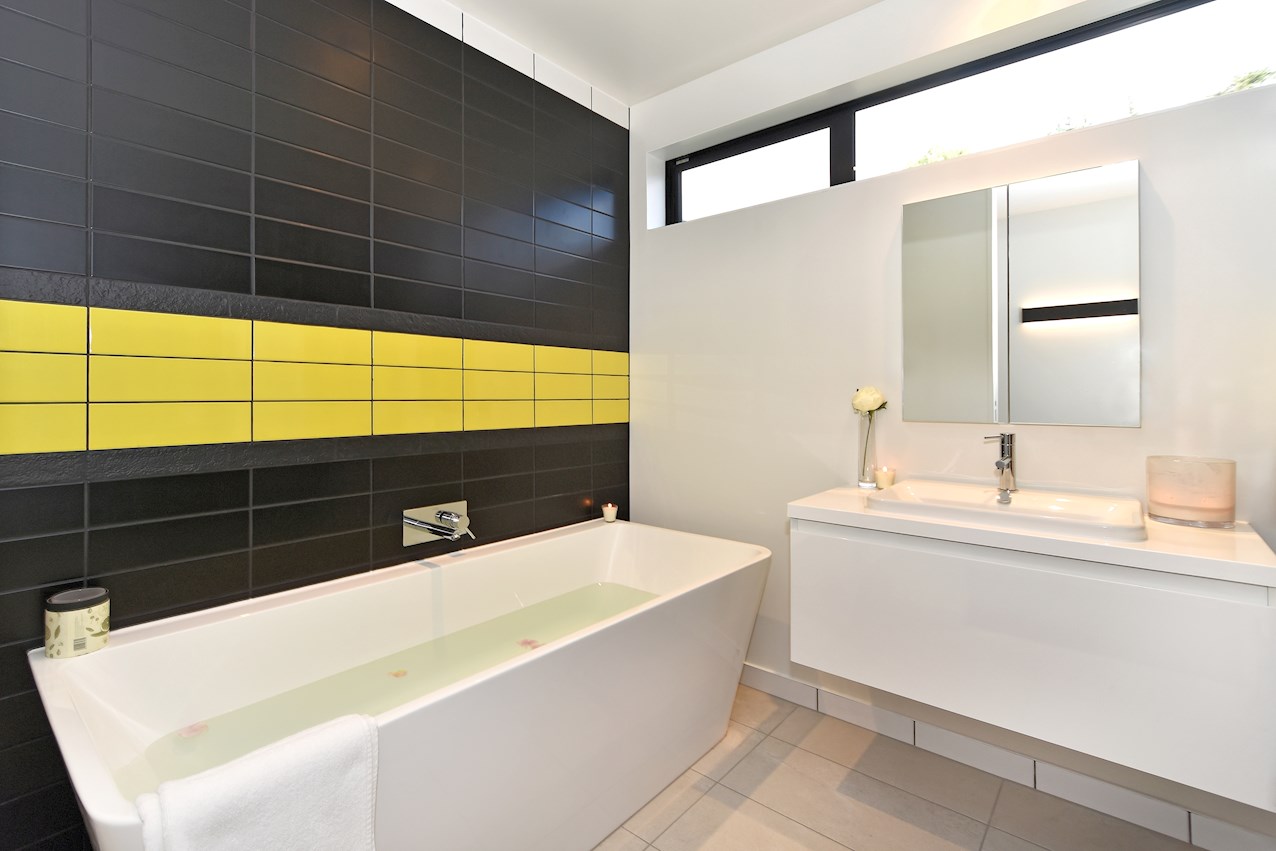 A separate living room, three bedrooms and two-and-a-half tiled bathrooms offer sanctuary for all. Built-in wardrobes and high-end fixtures elevate this home. Its modern decor is stylish and unique without being over the top. Pops of yellow at the entrance and in the bathroom tiles, make for a sunny vibe.