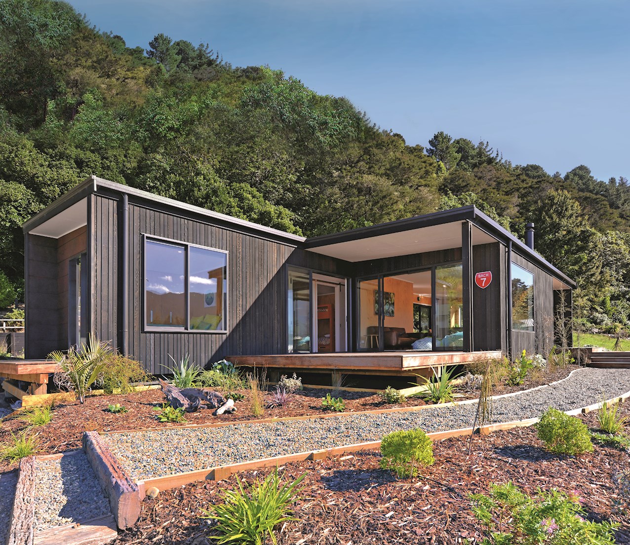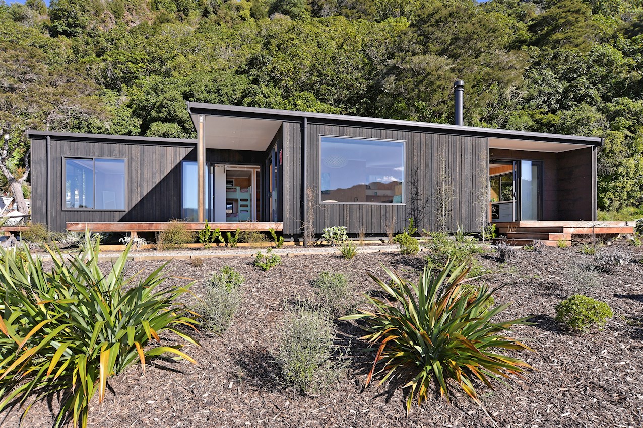 Built on a sliver of flat land in Tasman, this little slice of paradise sits beautifully against a backdrop of native bush. A subdued palette of materials and colours blends in with the lush surrounds. A pared-back 98sqm design caters to no-fuss beach stays.
