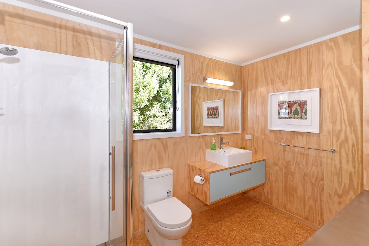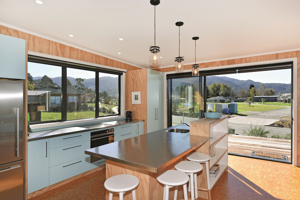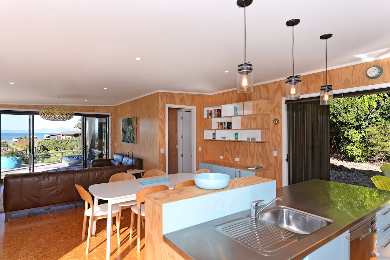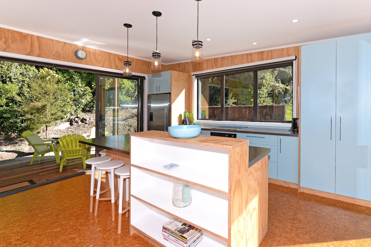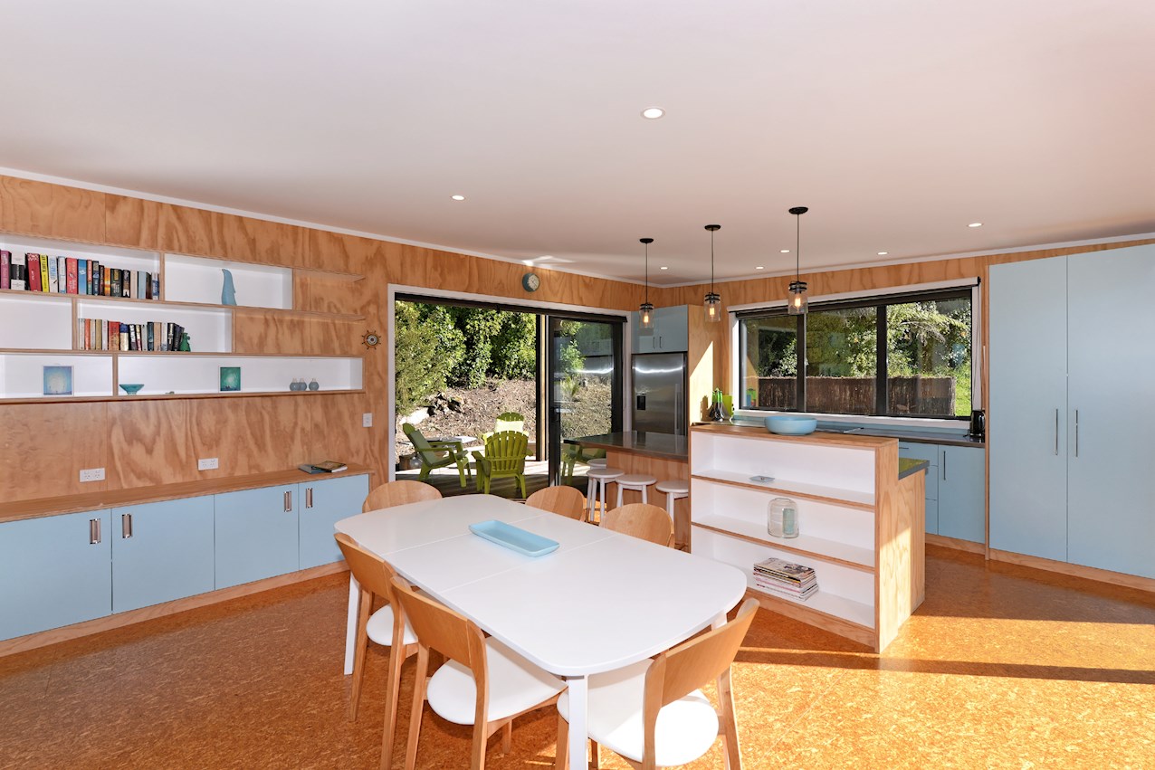 Interior materials are in keeping with the natural aesthetic. Clear finished floors and ply imbue the space with warmth. The white painted plasterboard ceiling fosters a sense of open space. Splashes of colour add fun and personality throughout.