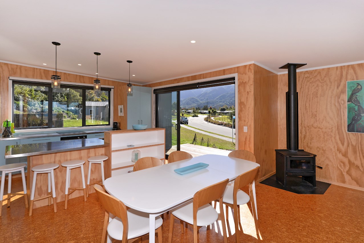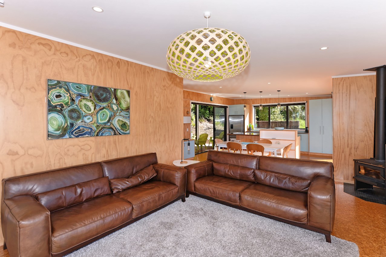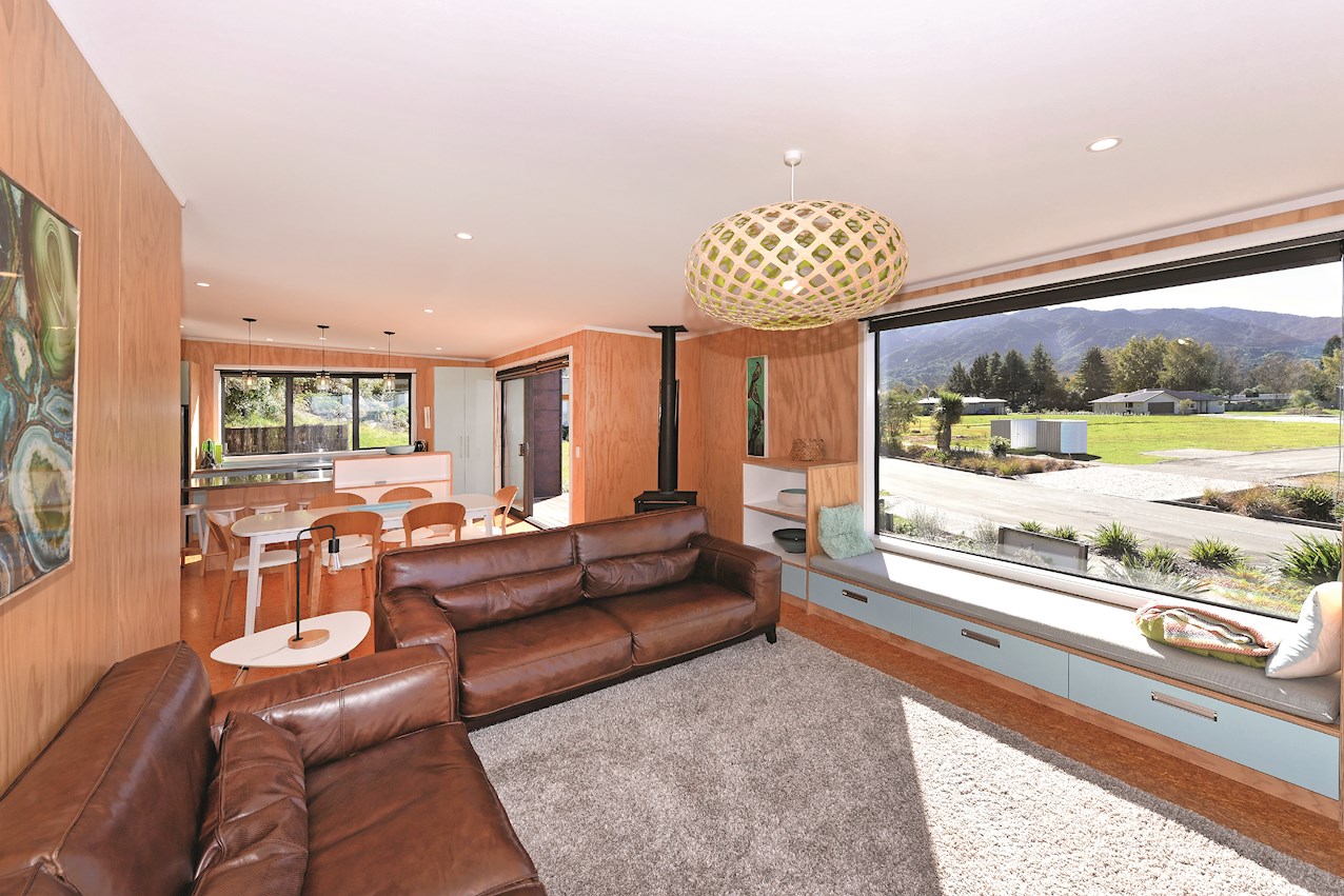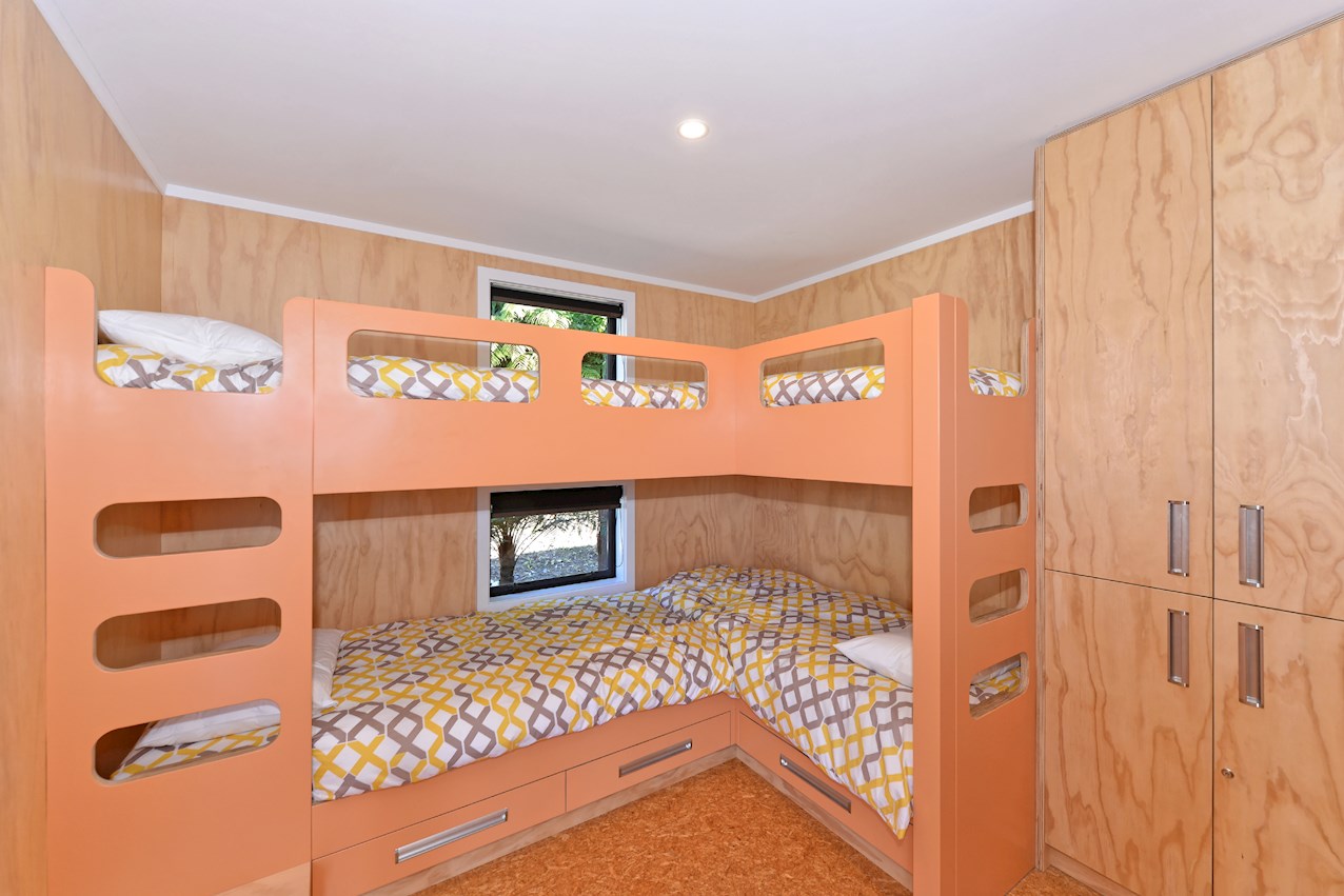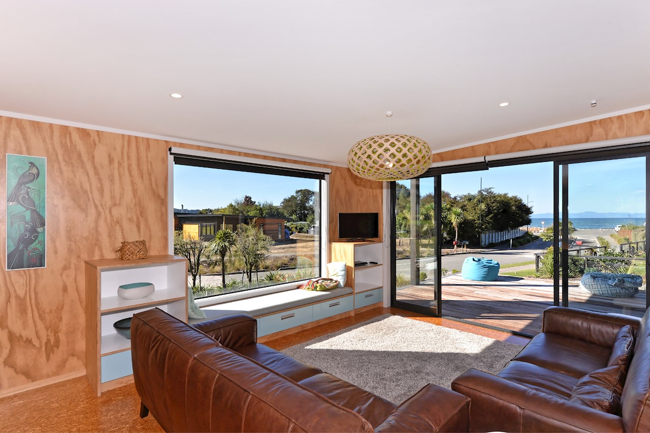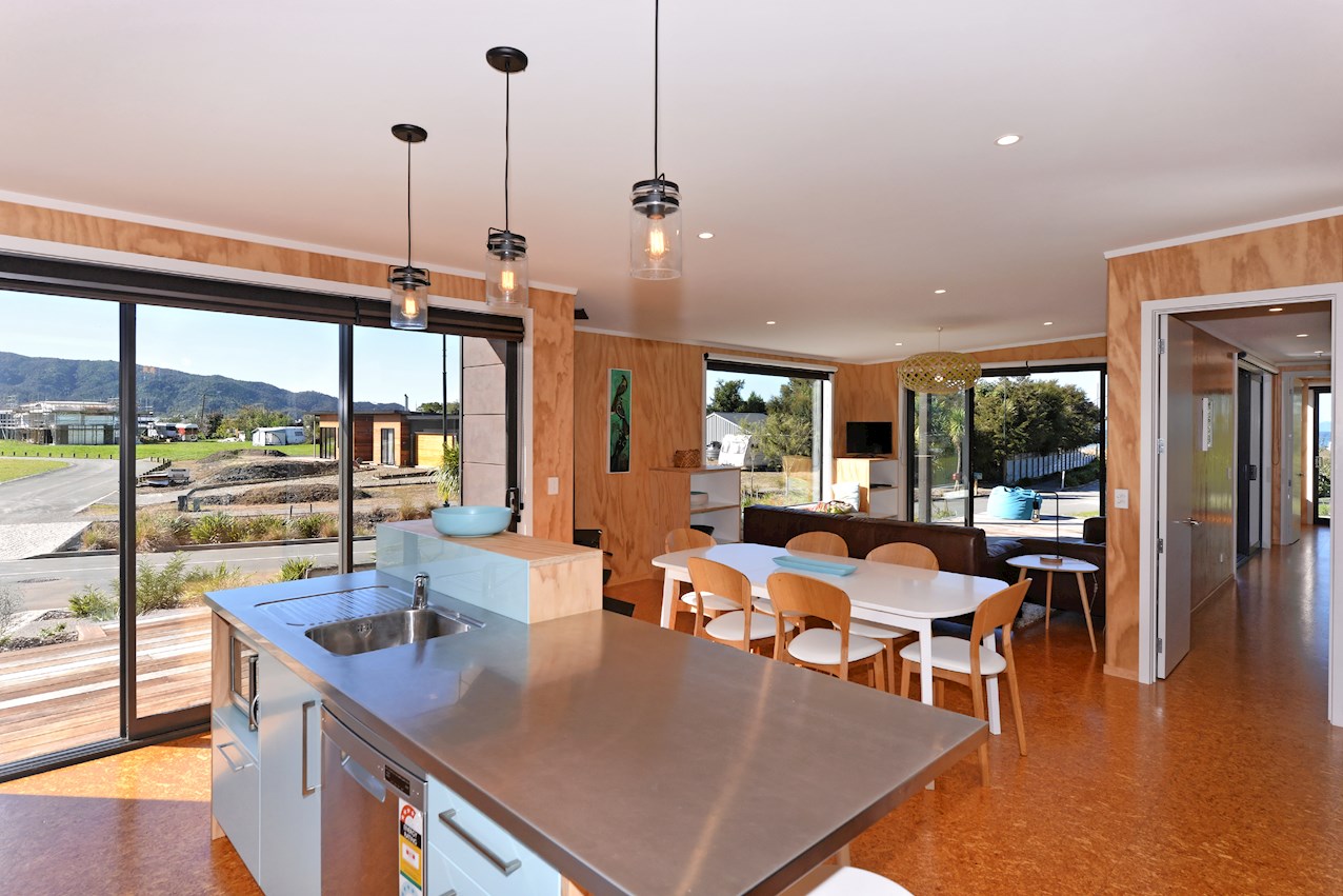 Interior materials are in keeping with the natural aesthetic. Clear finished floors and ply imbue the space with warmth. The white painted plasterboard ceiling fosters a sense of open space. Splashes of colour add fun and personality throughout.